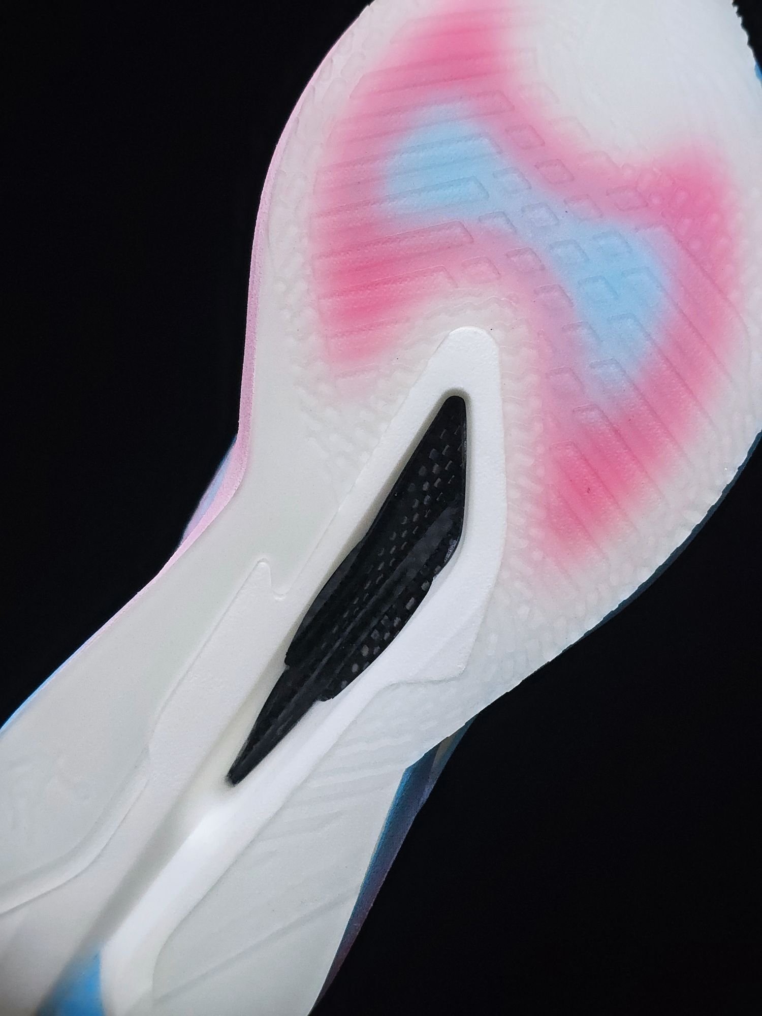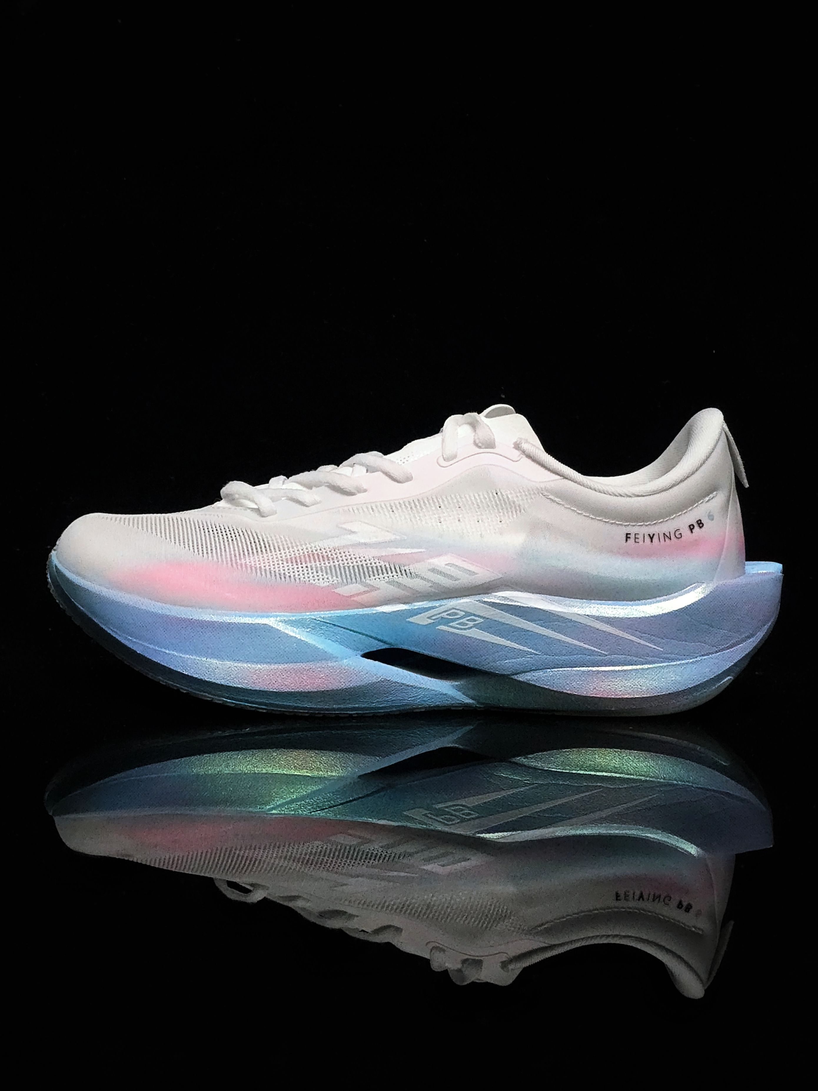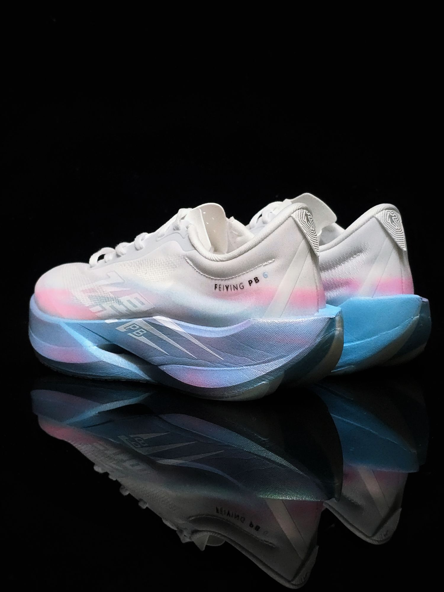 这双飞影PB6.0“勿忘我”配色以清新蓝粉渐变为主调,有点类似“冰雪奇缘”般的梦幻质感~ 性能方面核心卖点是创新的“悬浮碳板”与“超级巭中底”组合,前掌韧弹响应迅速,滚动过渡流畅,“弹射起步”感很清晰!鞋楦加宽设计对宽脚、高足背跑者更友好。单只重量200克左右,轻盈透气,很适合中小体重进阶跑者! 缺点是但中足支撑缺失,有足底筋膜炎风险,后掌过软影响稳定性,大体重或新手驾驭较难!