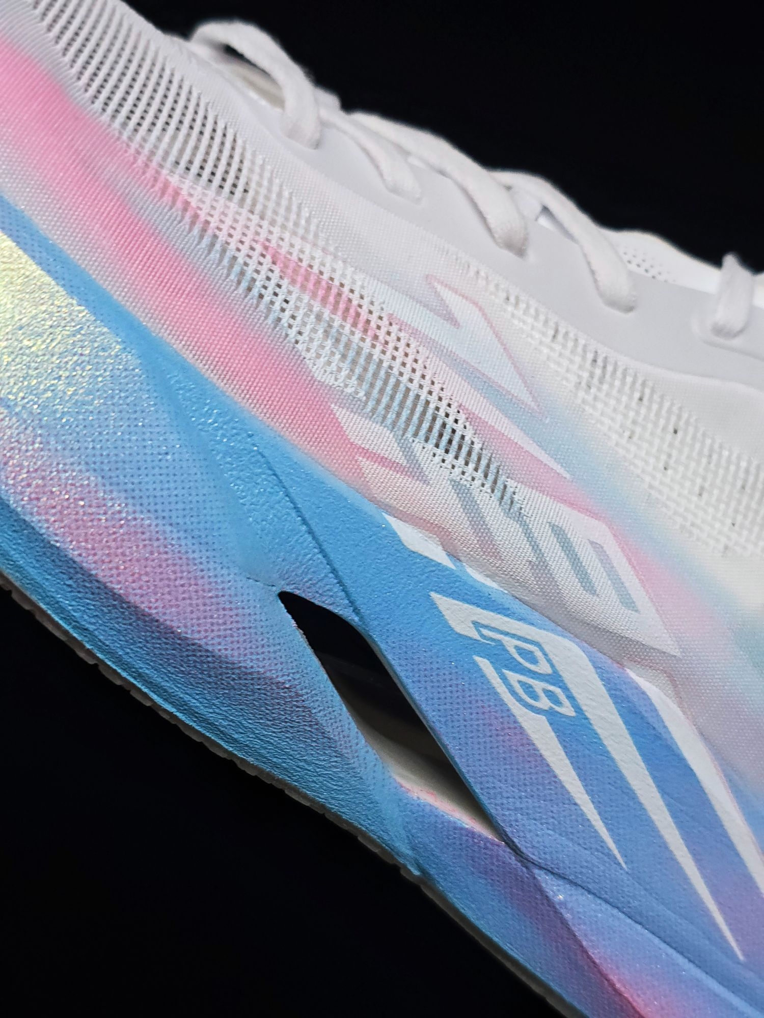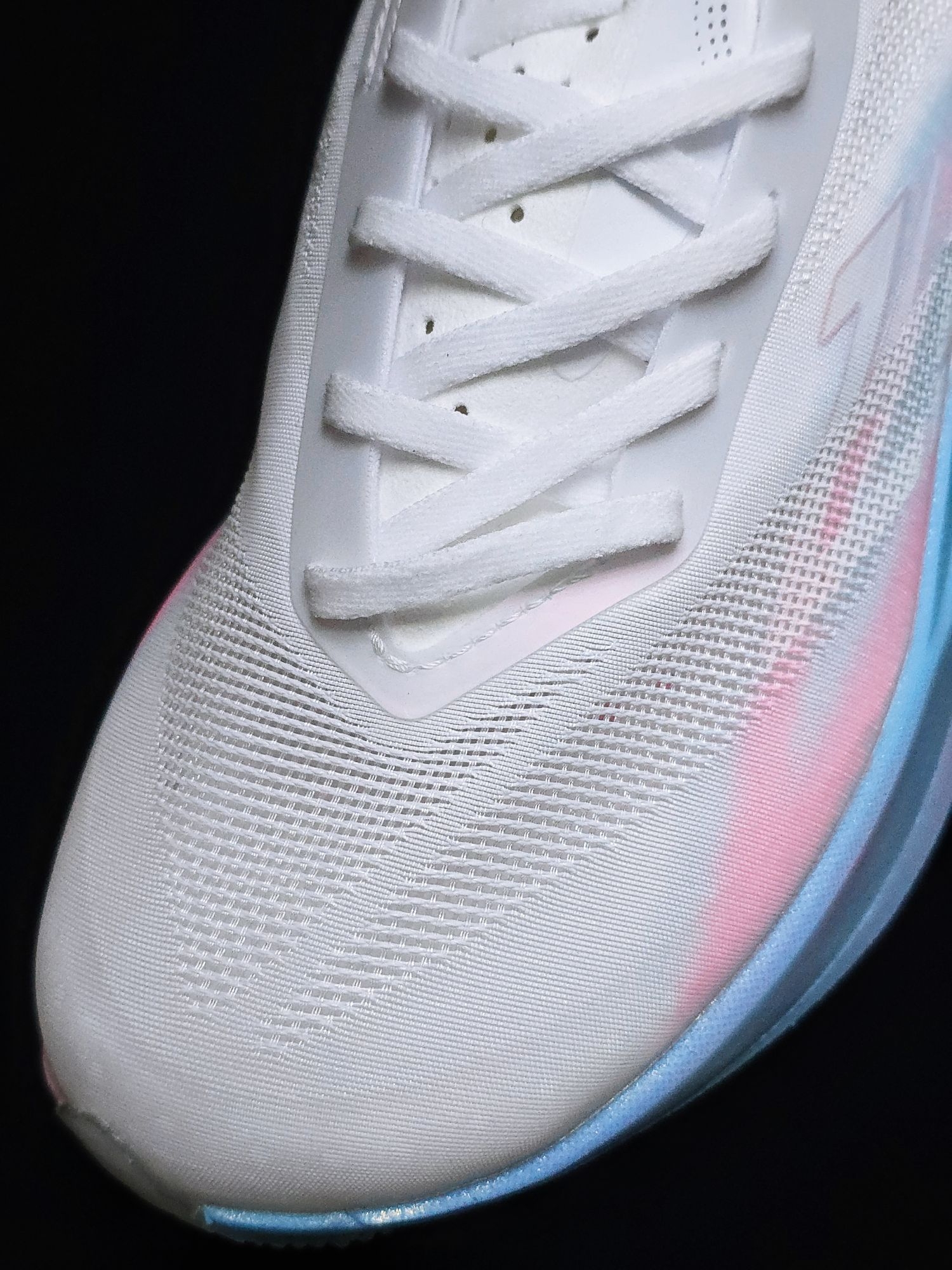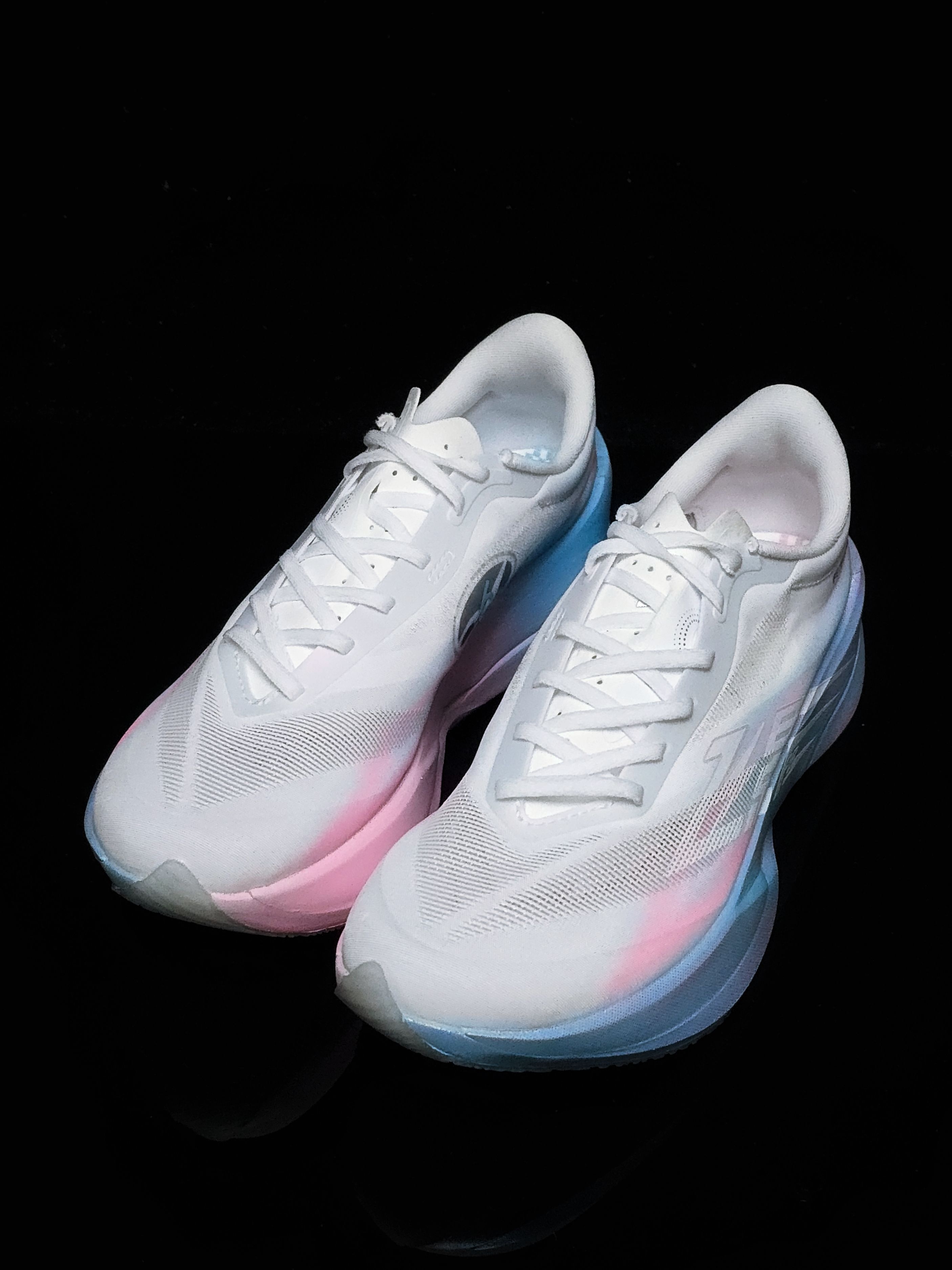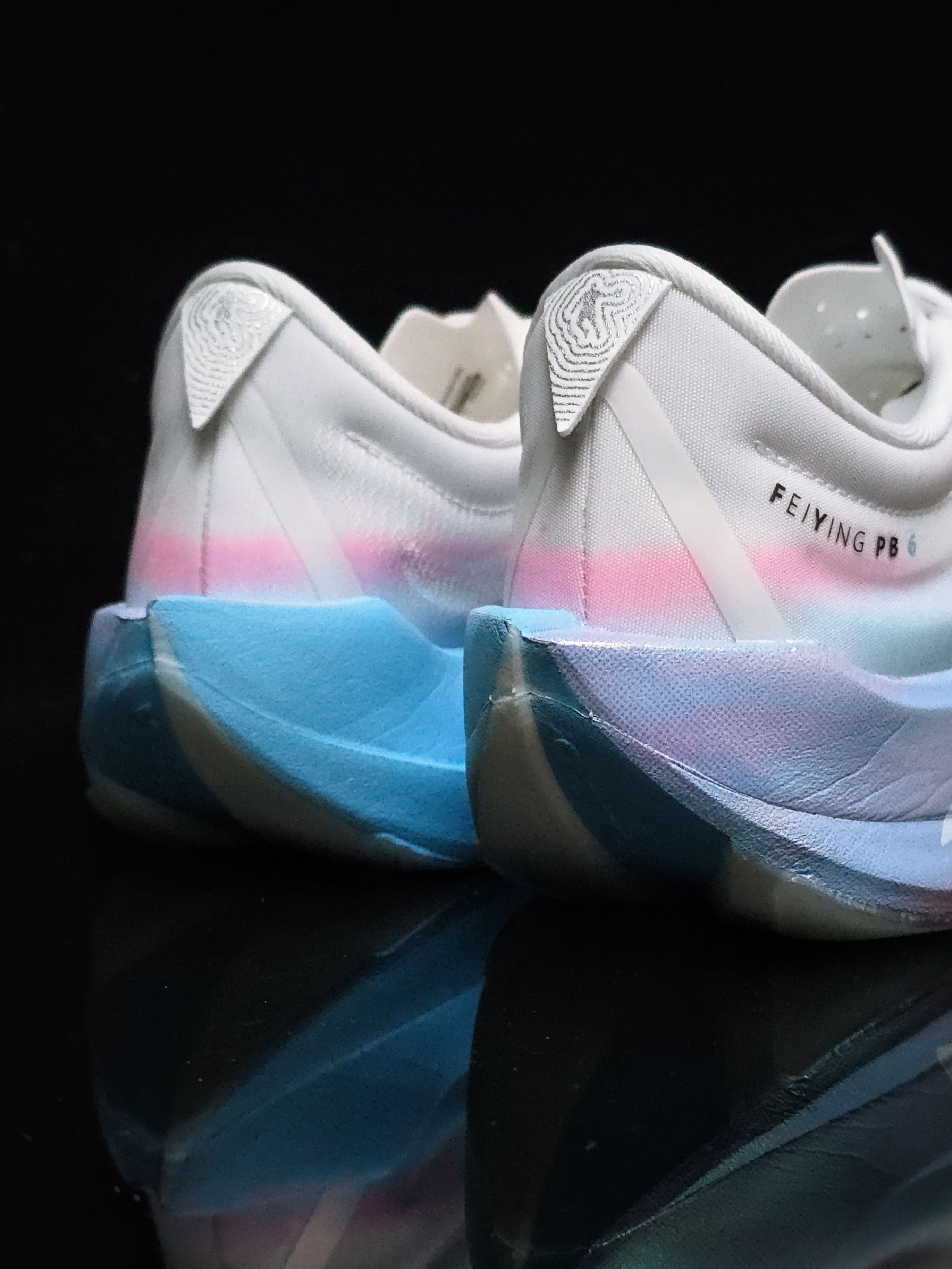这双飞影PB6.0“勿忘我”配色以清新蓝粉渐变为主调,有点类似“冰雪奇缘”般的梦幻质感~ 性能方面核心卖点是创新的“悬浮碳板”与“超级巭中底”组合,前掌韧弹响应迅速,滚动过渡流畅,“弹射起步”感很清晰!鞋楦加宽设计对宽脚、高足背跑者更友好。单只重量200克左右,轻盈透气,很适合中小体重进阶跑者! 缺点是但中足支撑缺失,有足底筋膜炎风险,后掌过软影响稳定性,大体重或新手驾驭较难!