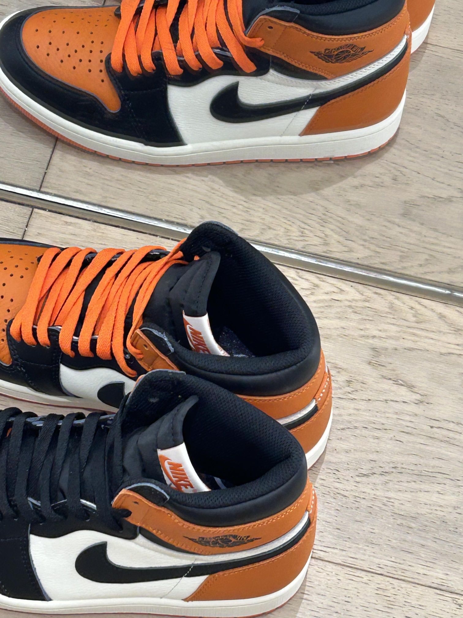 AJ1的扣碎配色终于回归了🧡这次颜色复刻的还是很正的✅刨除情怀党这款入手也没有问题,颜值很高,夏天这个季节穿着很亮眼 👉🏻黑扣碎还比较好打理,皮质的鞋面一擦就干净了,尺码不偏码,正码入手就可以了 📍OG鞋型的脚感还是很不错的