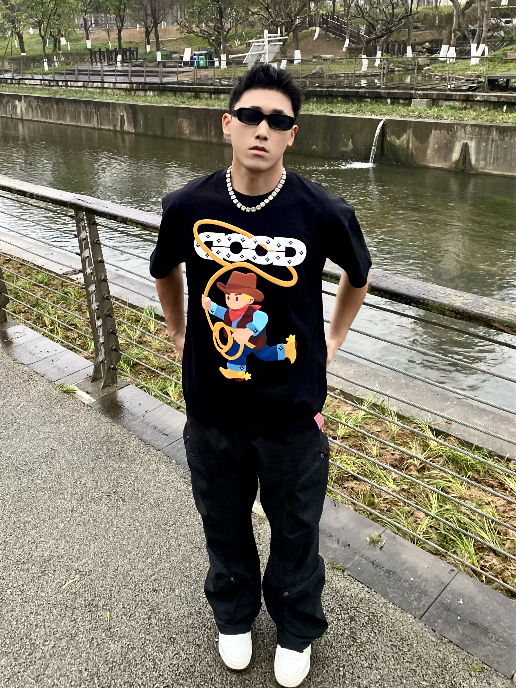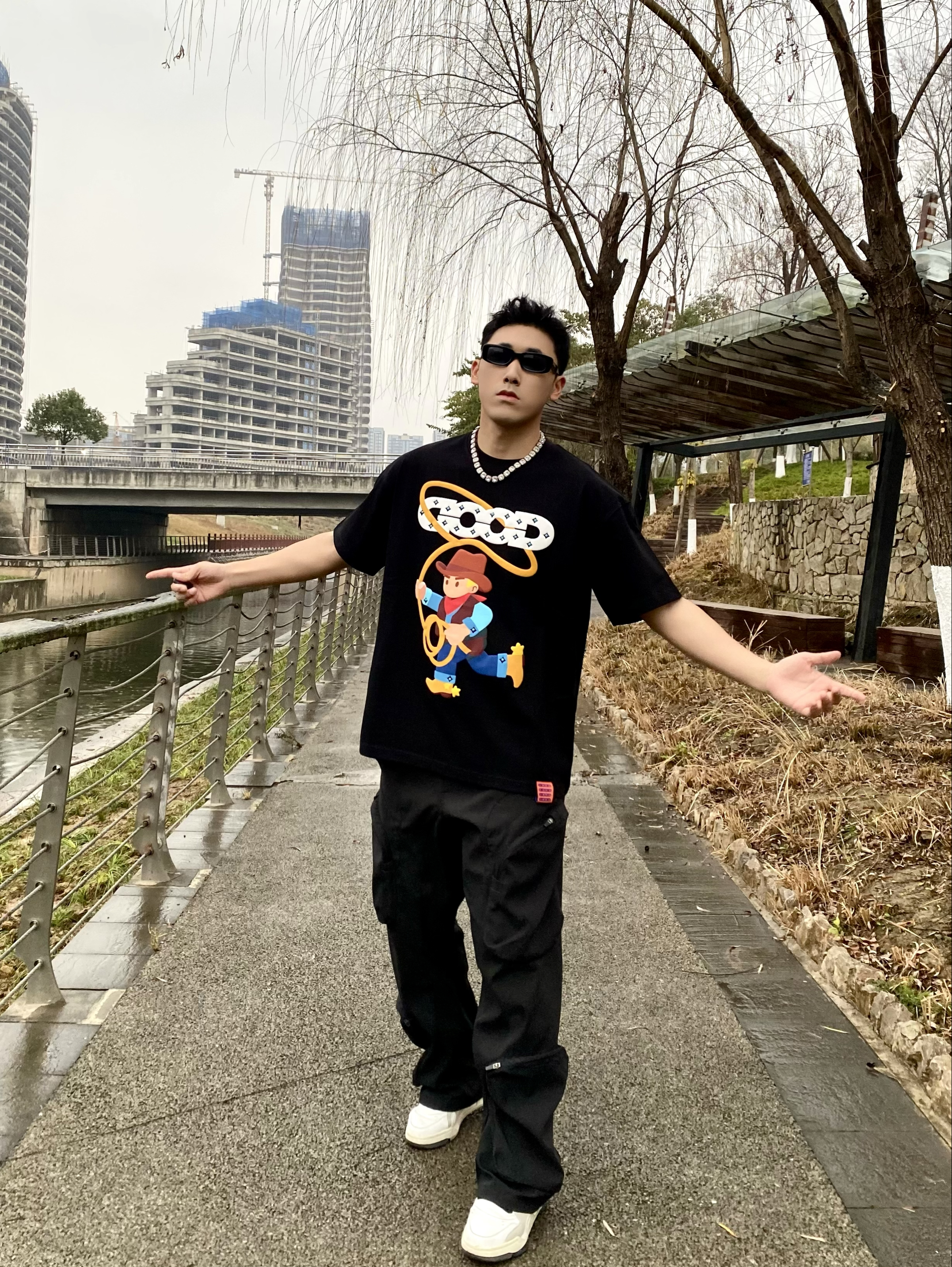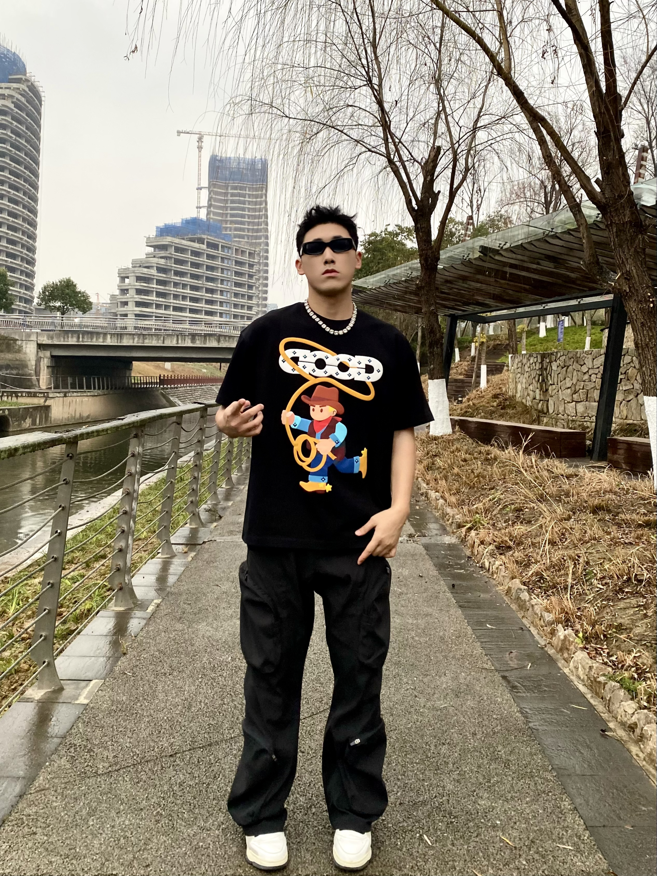 hello 这里是小樊~ 年一过又快到了漏肉的季节🙋 今天上身 GOOD 短袖👍 小樊身高体重180/77穿着L码宽松效果⚡️ 上身版型不错立体有廓形🏝️ 胸前是发泡牛仔形象童趣十足💥 宝石镶嵌轻奢感扑面而来🤩 背后也有logo和字母点缀🌬️ 下身搭配多口袋工装裤💖 这样穿帅气又有趣🏋️