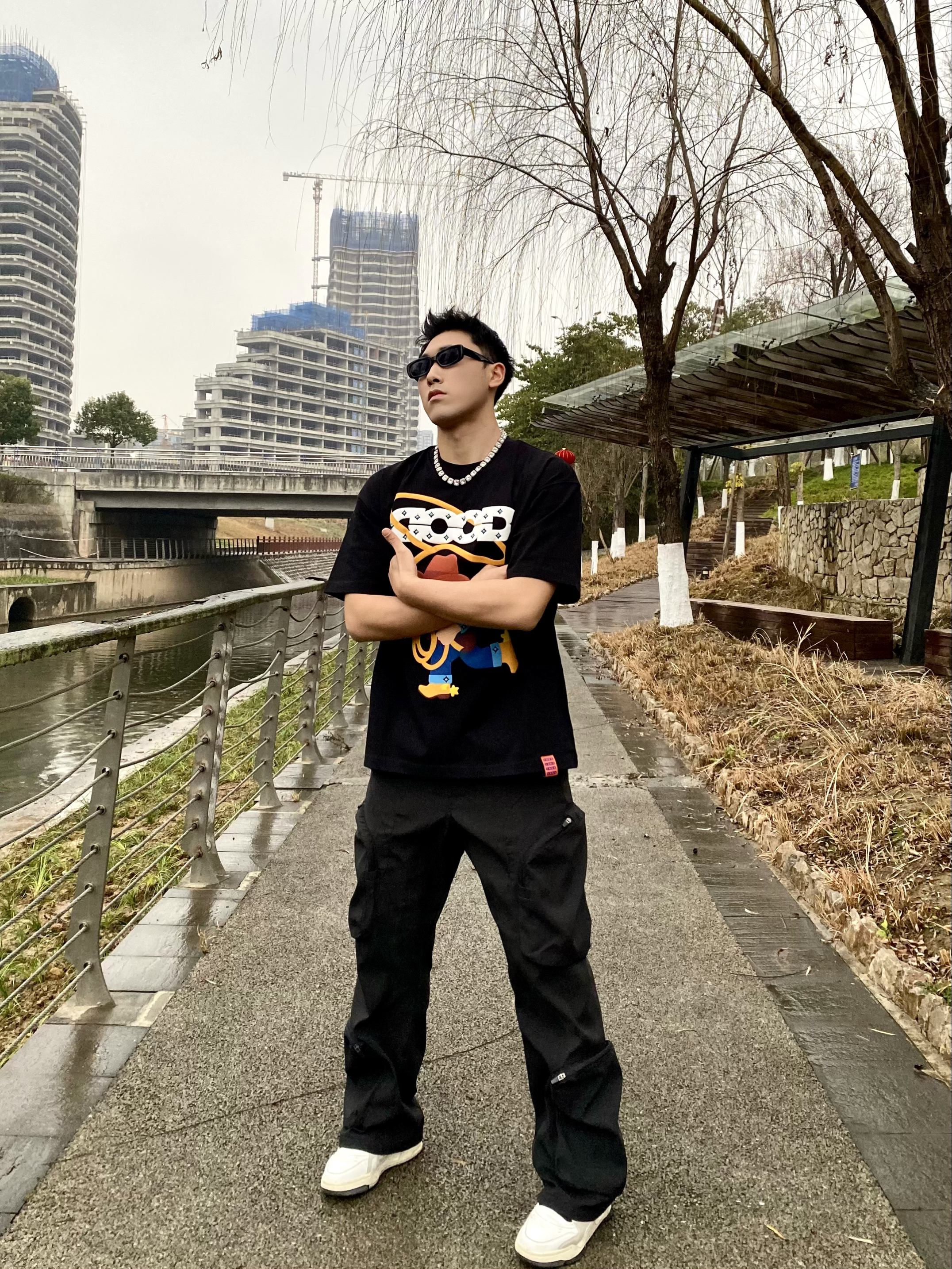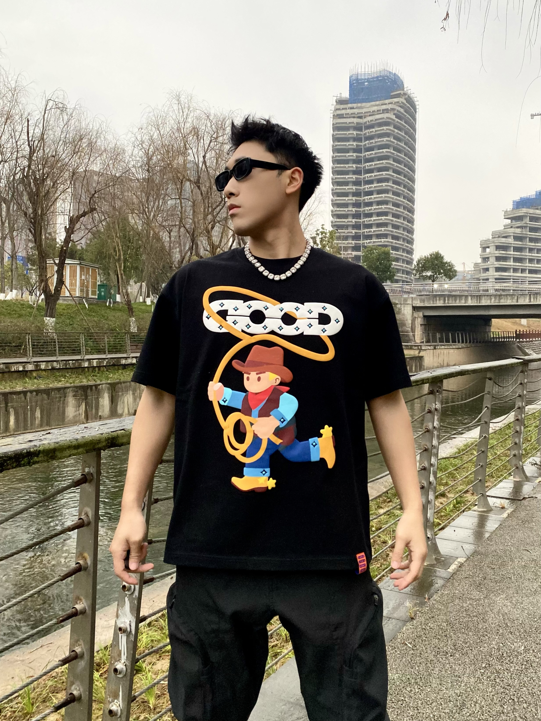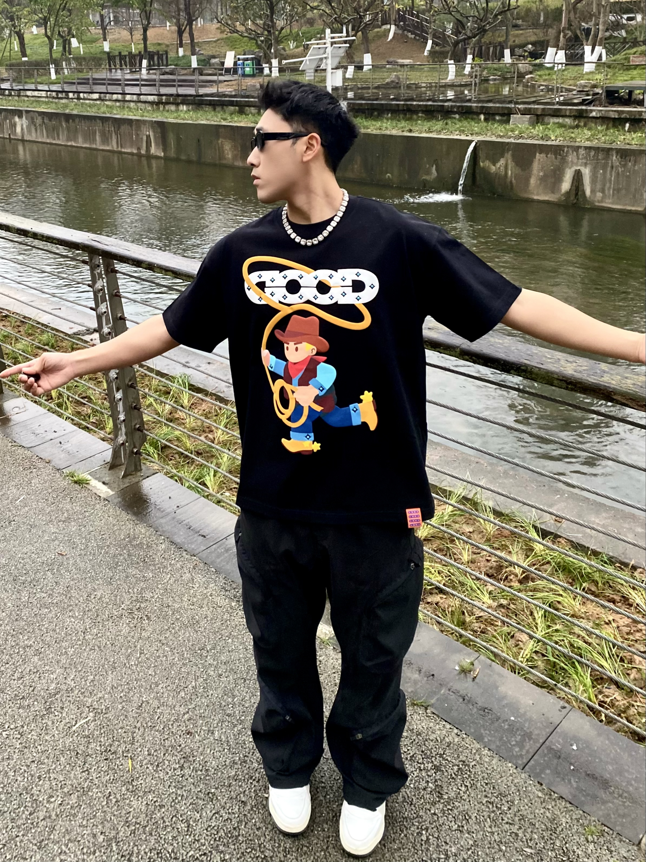 hello 这里是小樊~ 年一过又快到了漏肉的季节🙋 今天上身 GOOD 短袖👍 小樊身高体重180/77穿着L码宽松效果⚡️ 上身版型不错立体有廓形🏝️ 胸前是发泡牛仔形象童趣十足💥 宝石镶嵌轻奢感扑面而来🤩 背后也有logo和字母点缀🌬️ 下身搭配多口袋工装裤💖 这样穿帅气又有趣🏋️