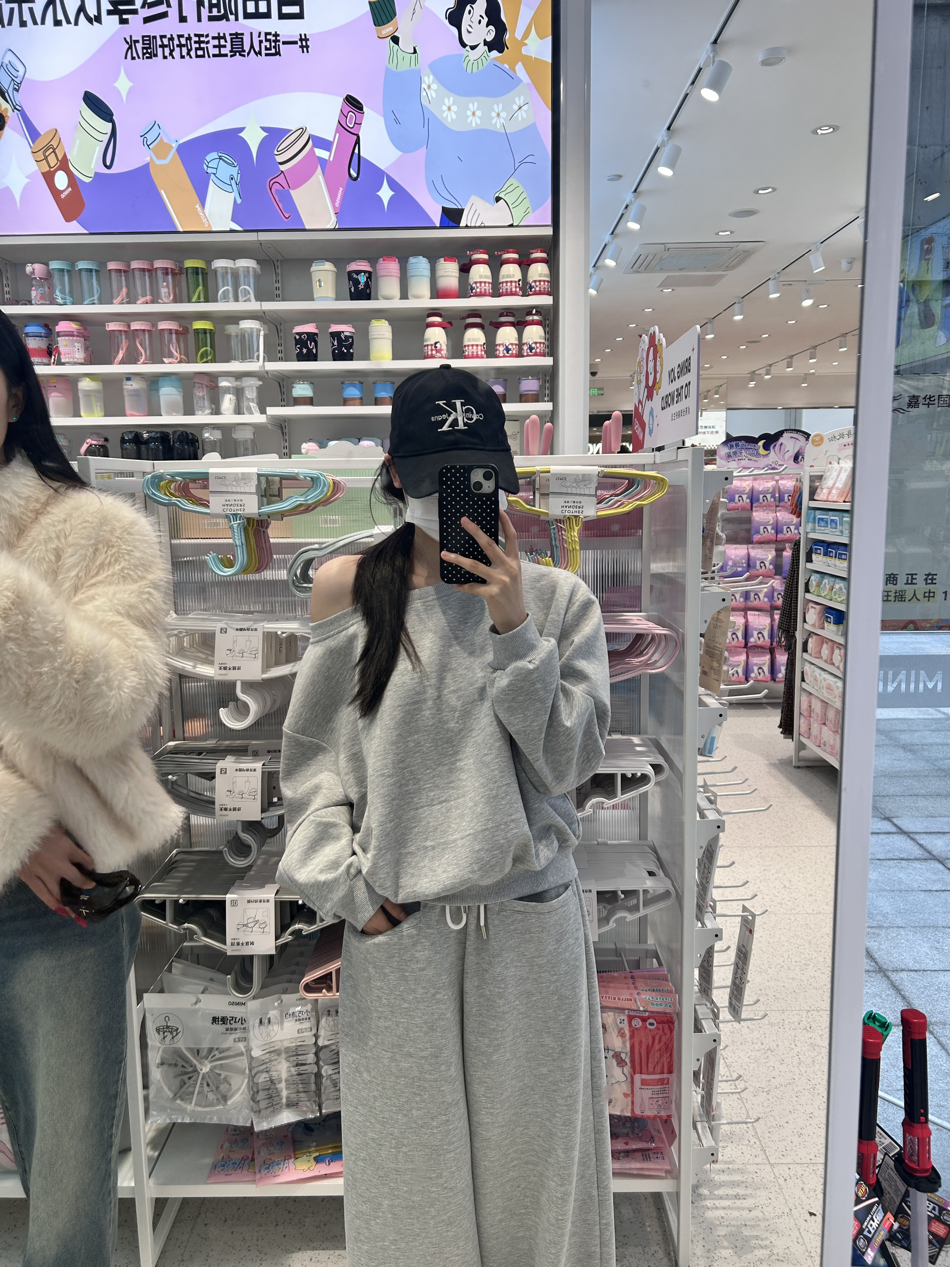 160/84小个子韩系穿搭 素颜散步也能穿出时髦氛围感 斜肩卫衣搭配宽松卫裤的慵懒感 鸭舌帽的增加路人的回头率