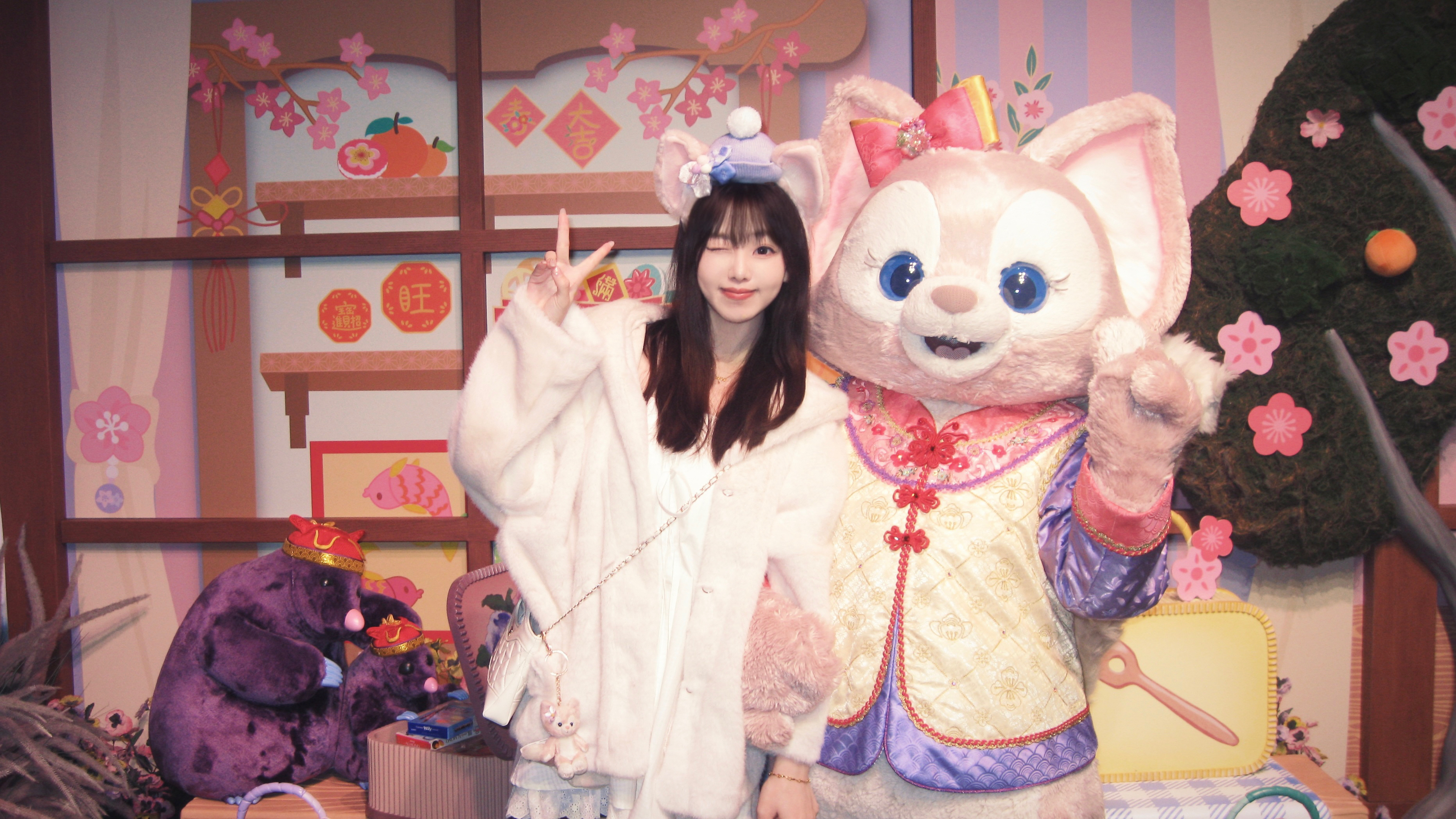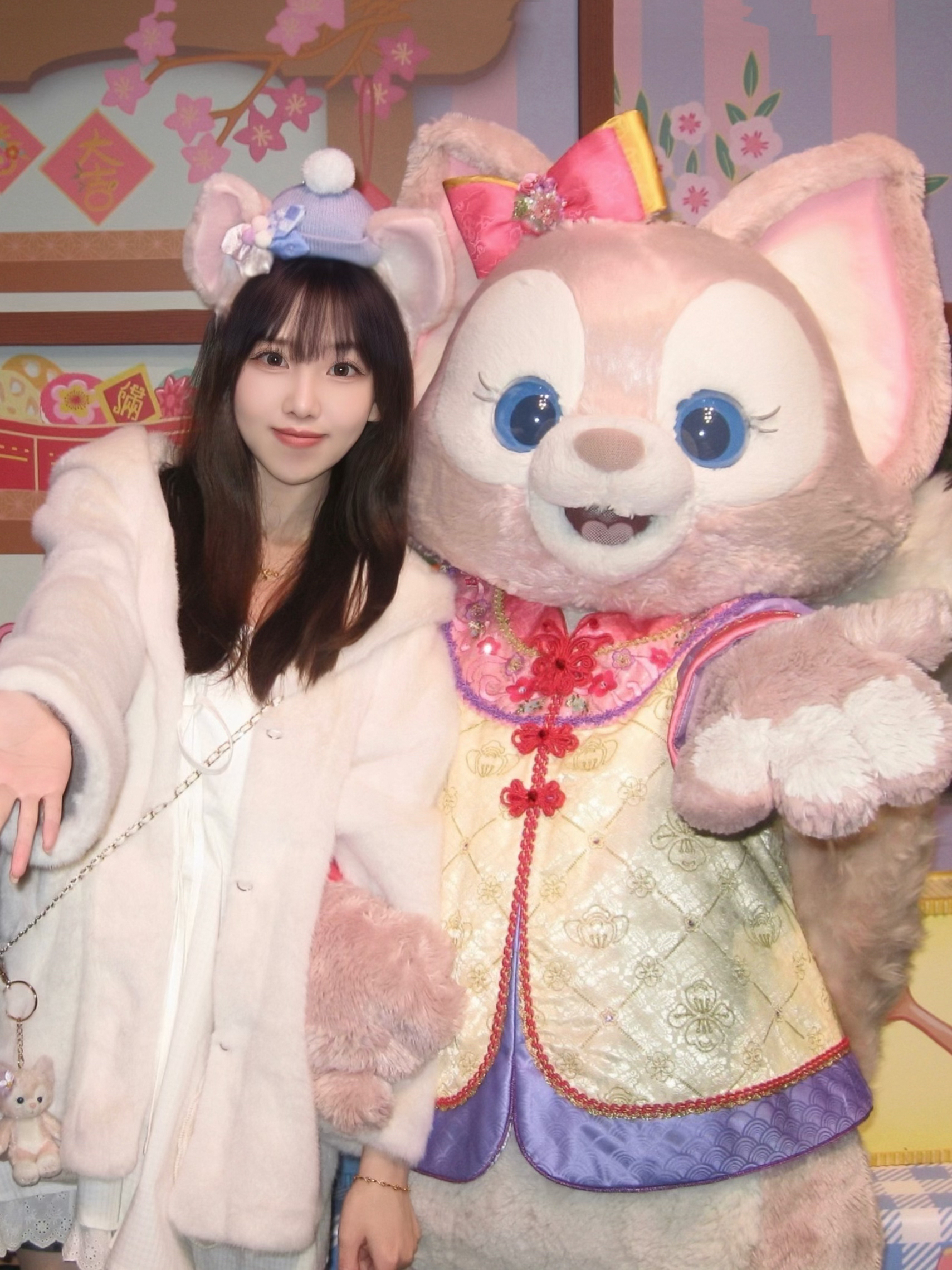 新春主题的迪士尼好有氛围~ 新年愿望马上显“玲”! 穿这套拍照好出片啊 白色裙子+毛茸茸外套很减龄 浅色穿搭很适合在这个梦幻的乐园🌟 戴上发箍主打甜美少女感🍬