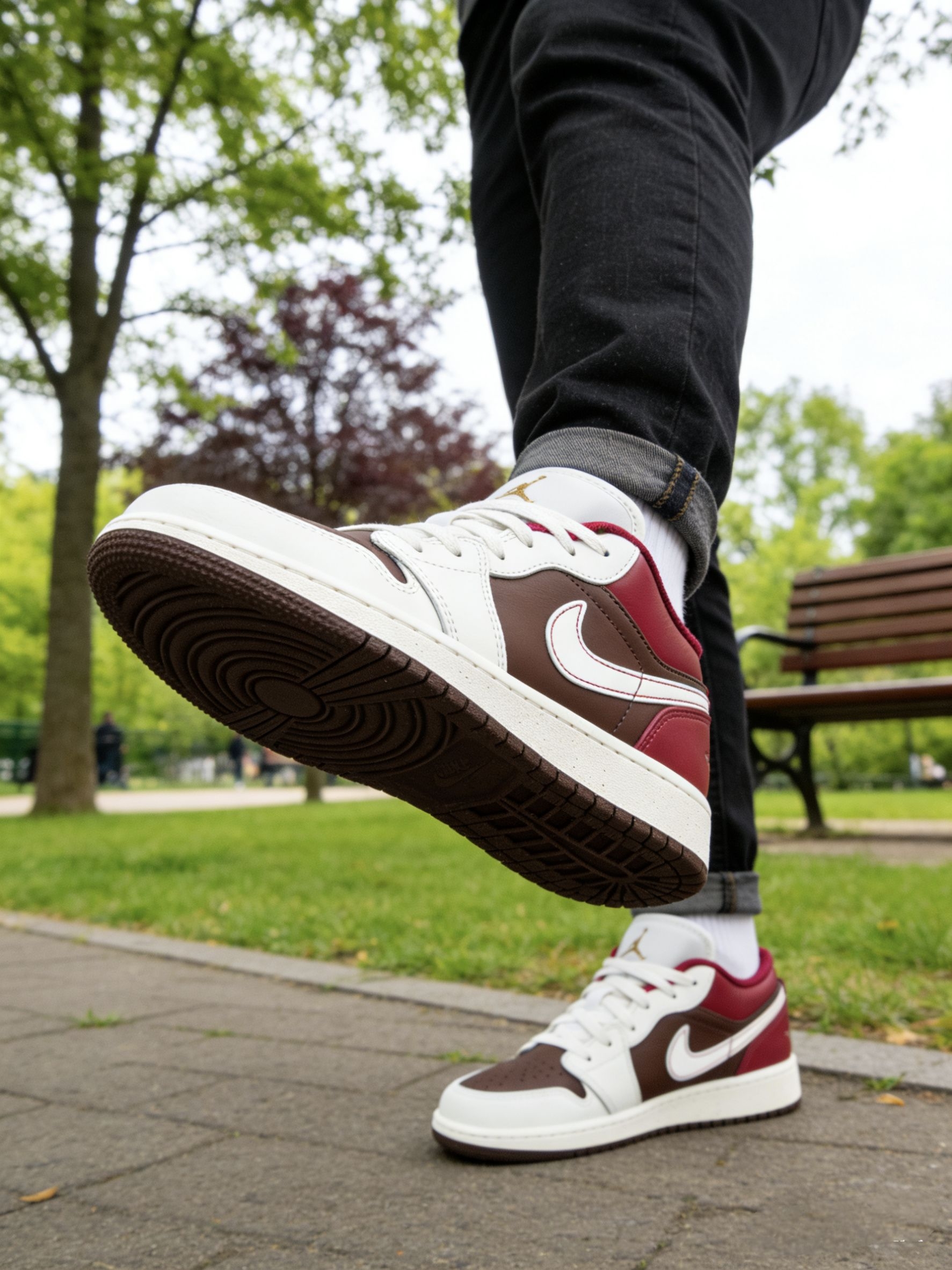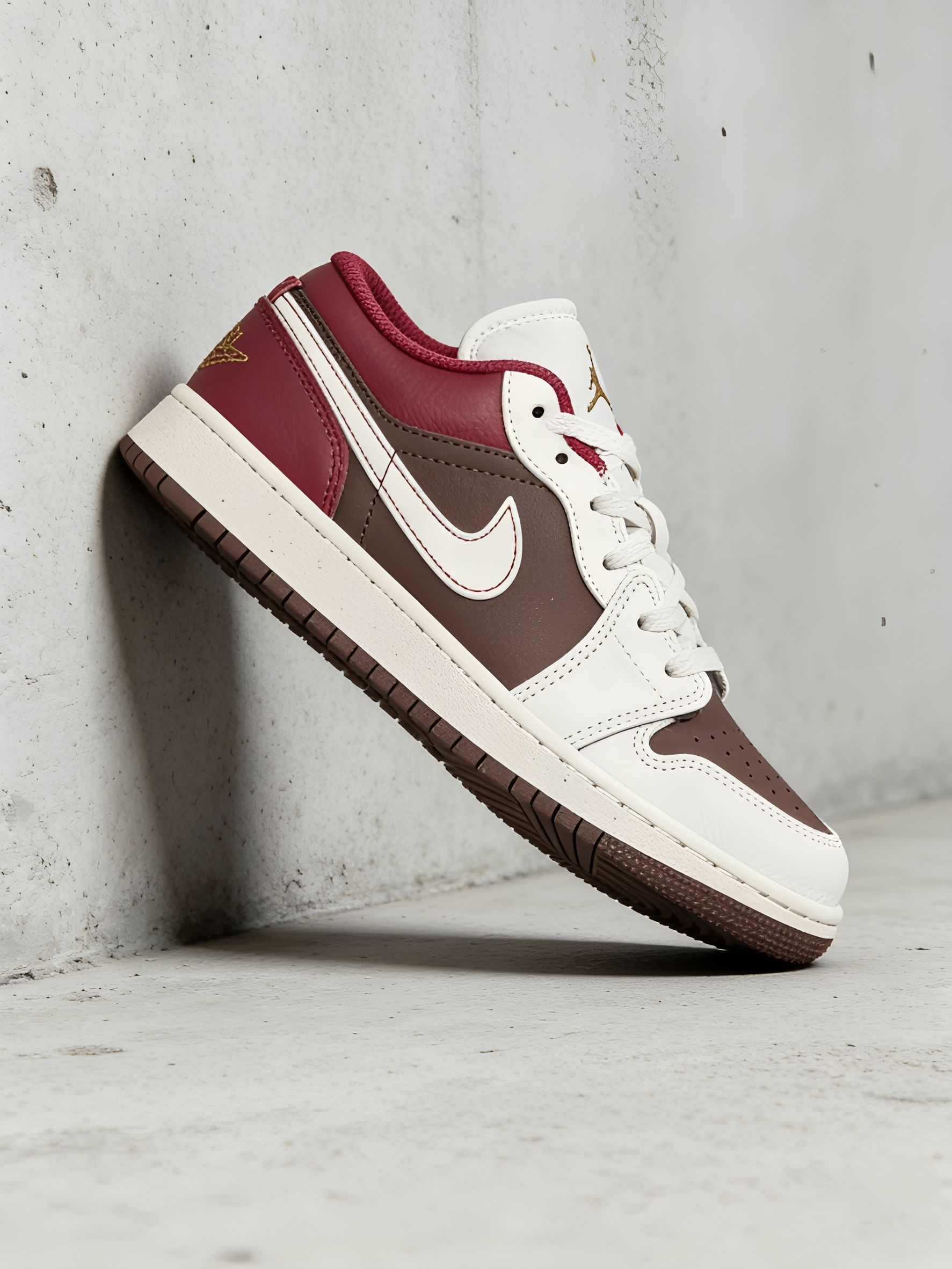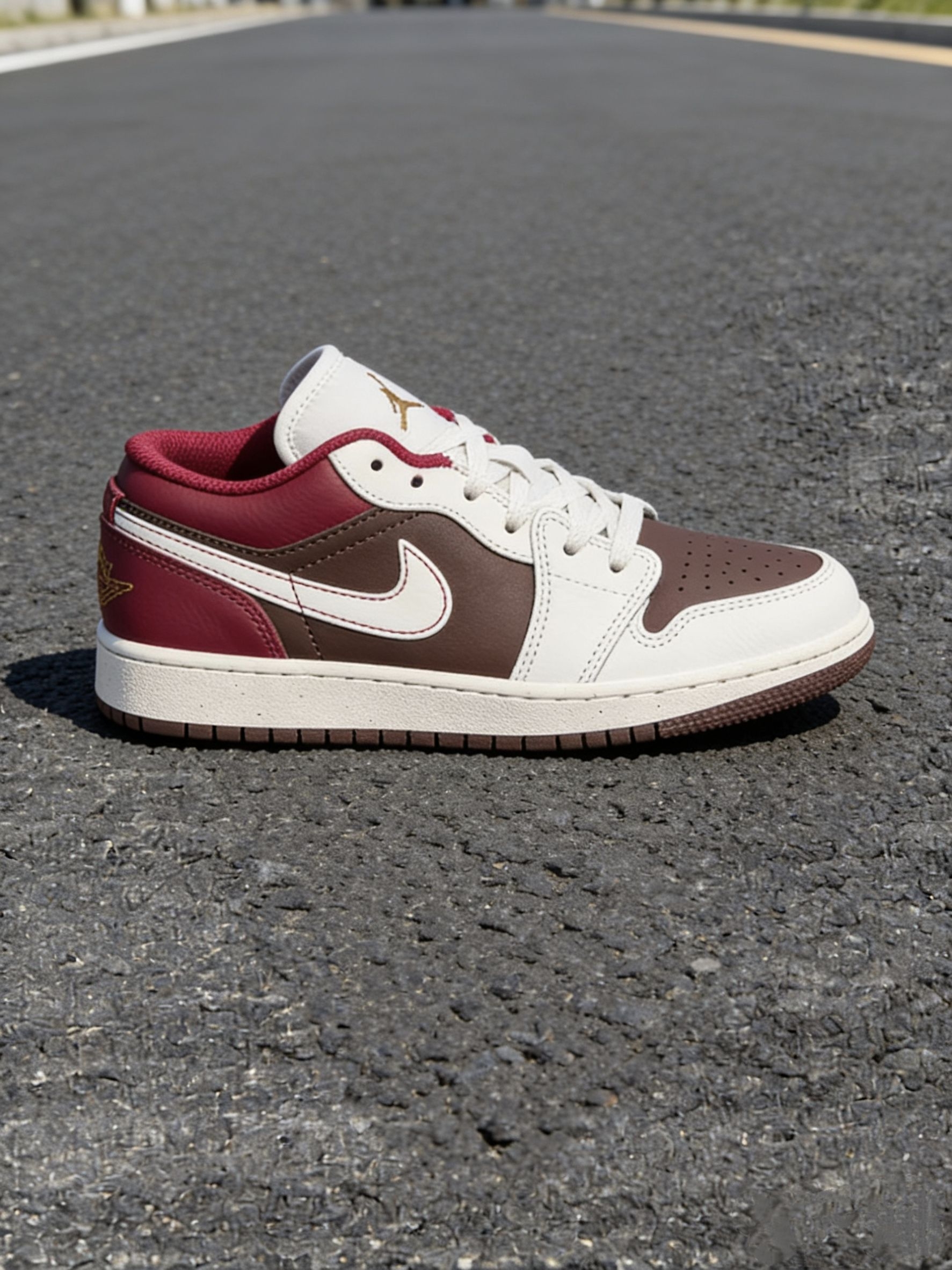 我最近真的很爱穿这双AJ1,奶白、深棕加酒红的拼色,温温柔柔的还很有复古感。 侧面红色那块还蛮亮眼的,配上白色小勾和棕色鞋身,看起来很有层次,不会平平无奇。鞋舌上有个小小的金色logo,不扎眼,但质感还挺好的。 白色鞋面比较挺括,不容易软塌塌,棕色是麂皮材质,带点做旧感,摸起来软软糯糯的。我平时配牛仔裤、休闲裤都很好看,随便穿都很搭。 就是麂皮部分有点小娇气,我稍微蹭到一点灰就得赶紧擦...