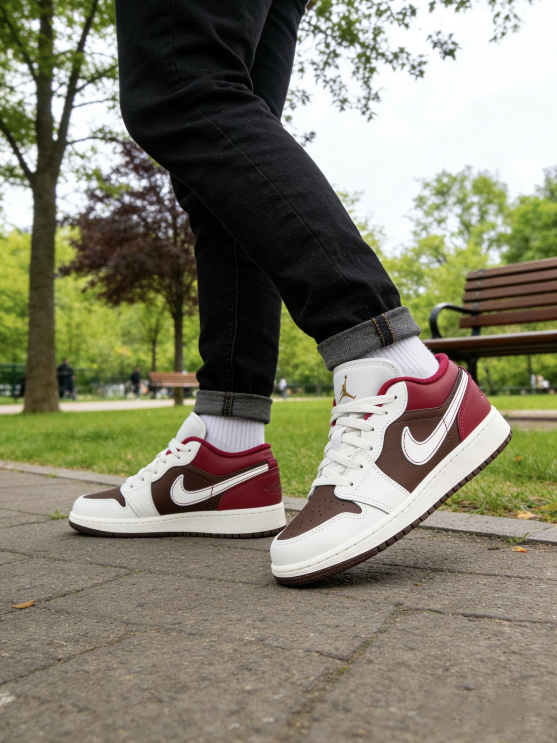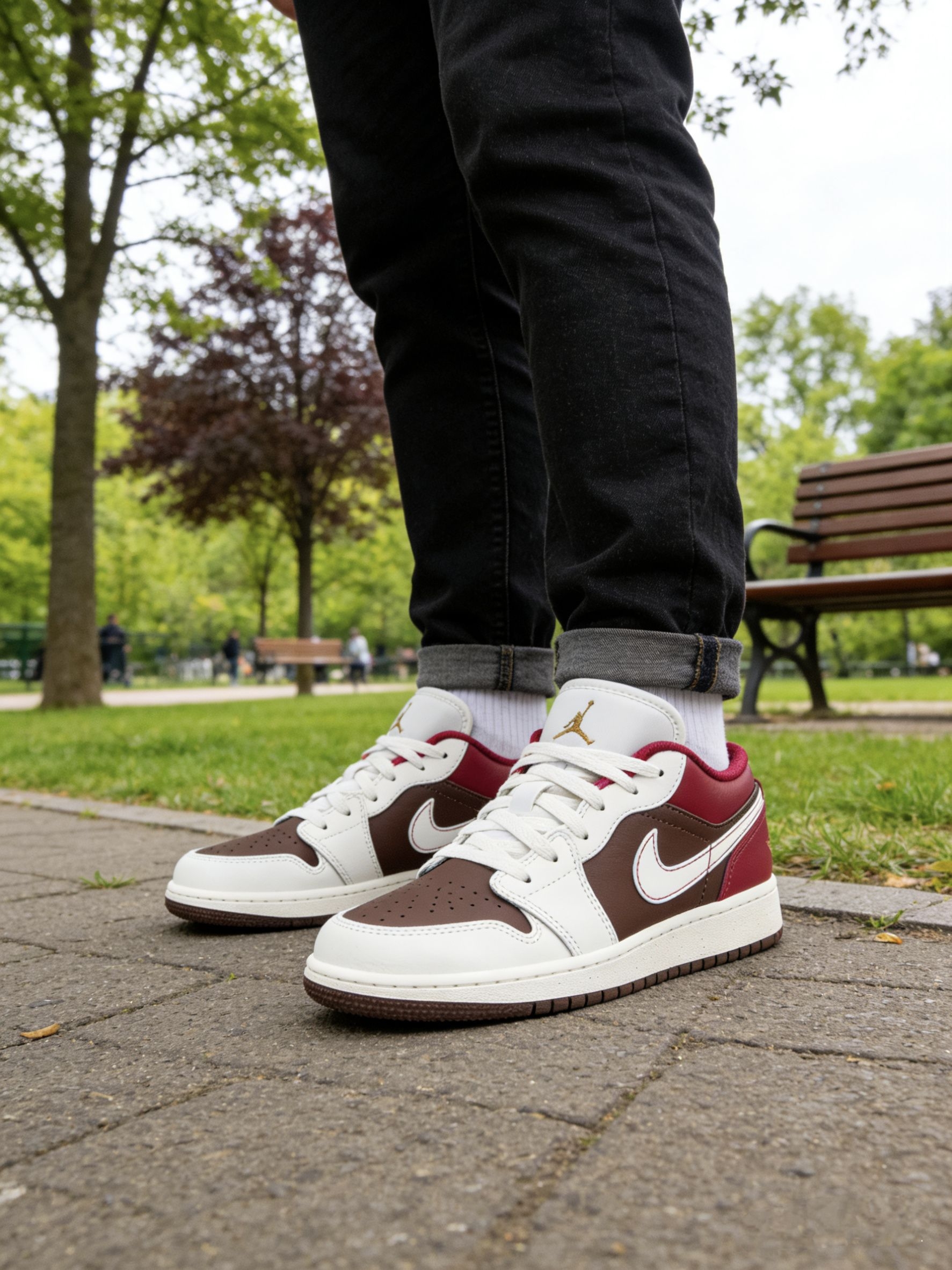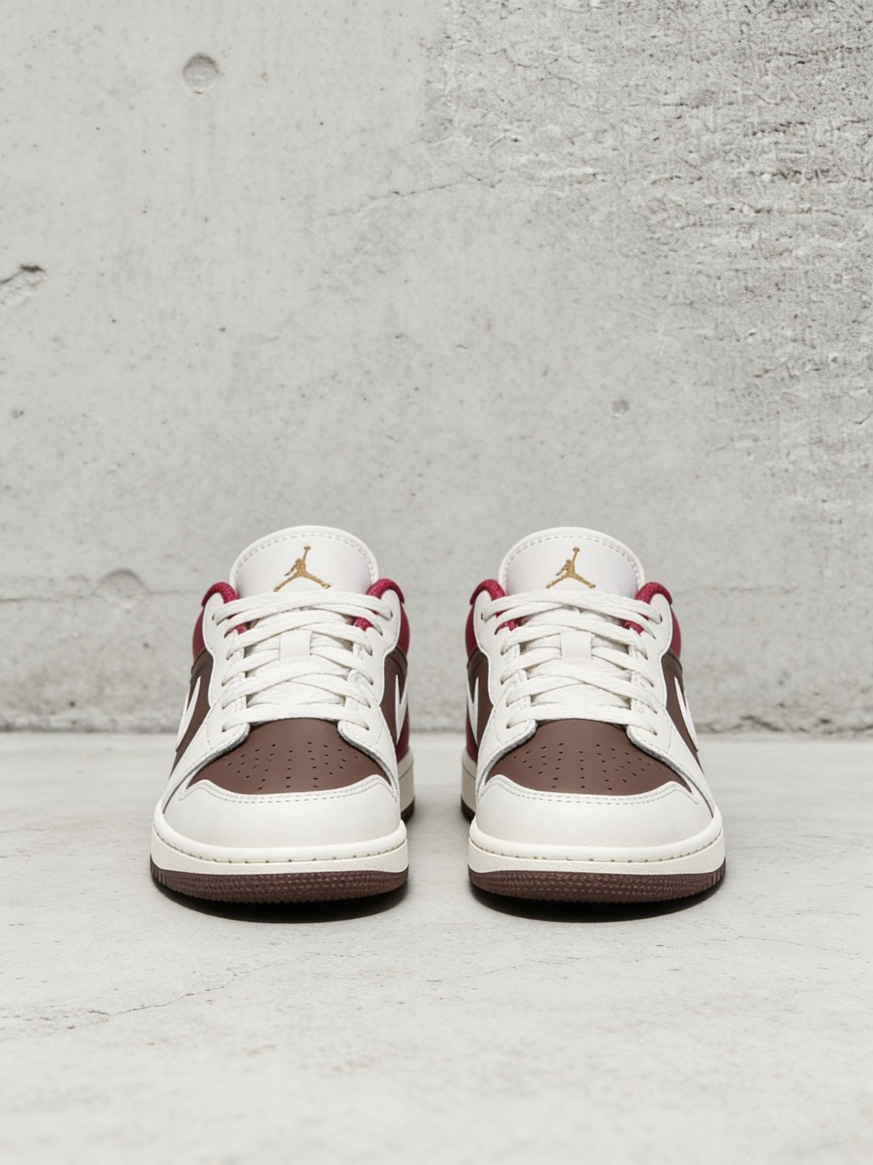 我最近真的很爱穿这双AJ1,奶白、深棕加酒红的拼色,温温柔柔的还很有复古感。 侧面红色那块还蛮亮眼的,配上白色小勾和棕色鞋身,看起来很有层次,不会平平无奇。鞋舌上有个小小的金色logo,不扎眼,但质感还挺好的。 白色鞋面比较挺括,不容易软塌塌,棕色是麂皮材质,带点做旧感,摸起来软软糯糯的。我平时配牛仔裤、休闲裤都很好看,随便穿都很搭。 就是麂皮部分有点小娇气,我稍微蹭到一点灰就得赶紧擦...