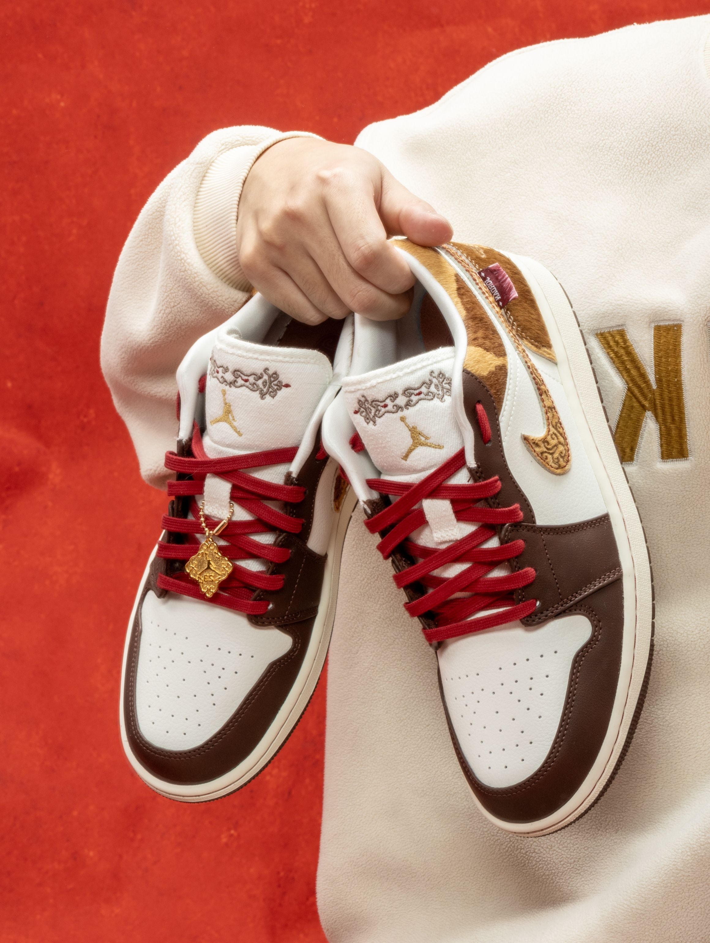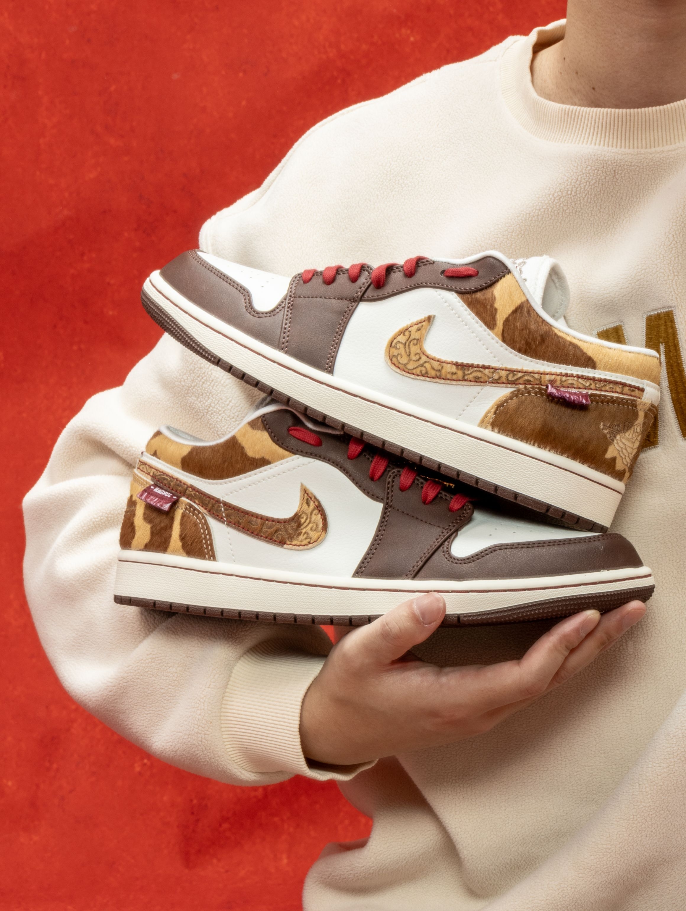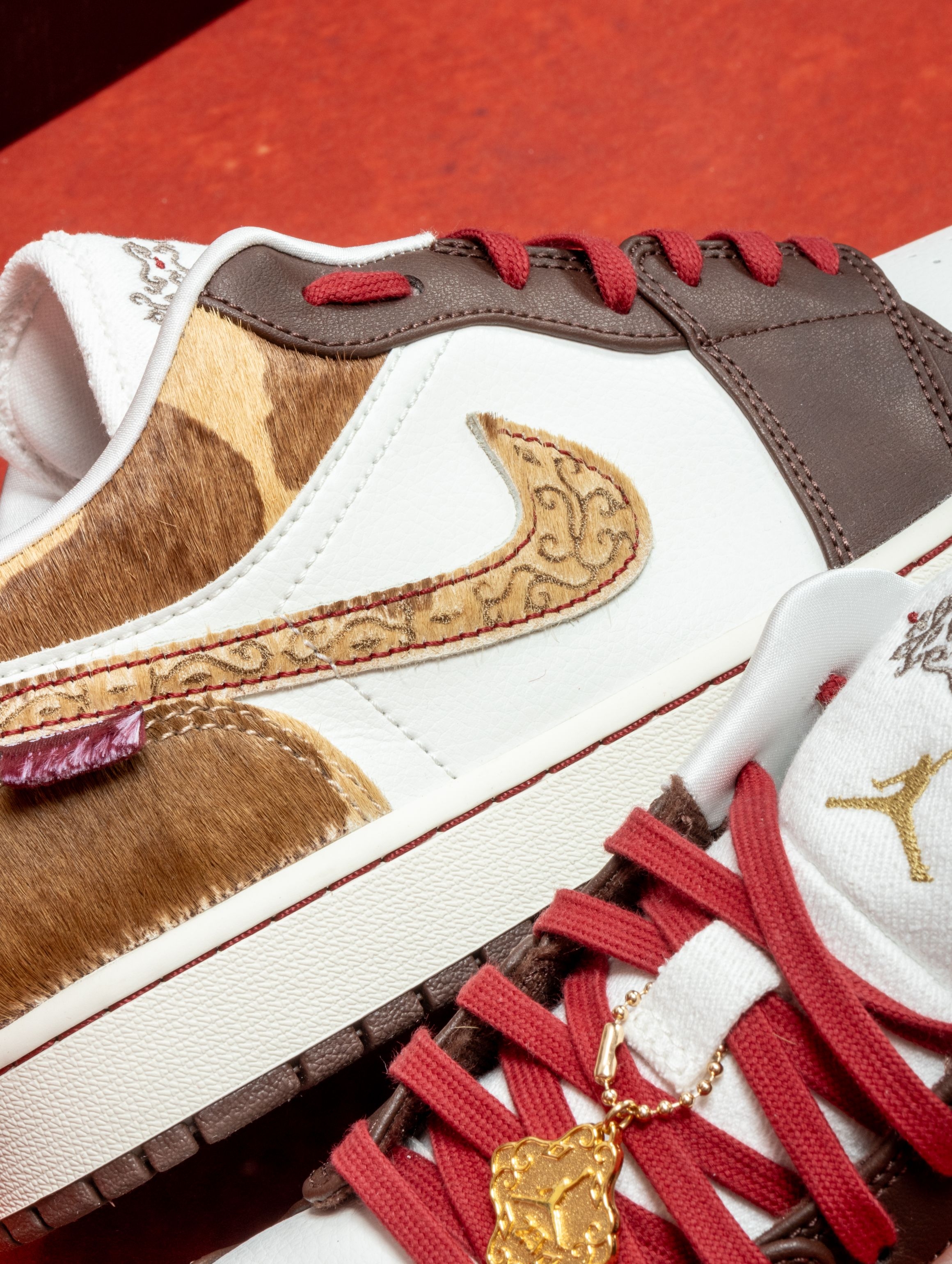 AJ1这双马年限定实物太顶了!店里挂着的时候还没觉得怎么样,上脚一试直接走不动道😂 棕褐色荔枝皮软得很,Swoosh和后跟那一圈小马毛摸着贼舒服,阳光下还有淡淡光泽感。鞋头那朵花卉刺绣精致得不像是球鞋该有的东西,鞋舌卷轴标签打开还藏着祝福彩蛋——这种小心思真的戳我。 上脚第一感觉就是不用磨合,皮质软得直接能穿出门。 一双能把新年氛围和日常百搭焊得这么死的鞋,值得拥有。