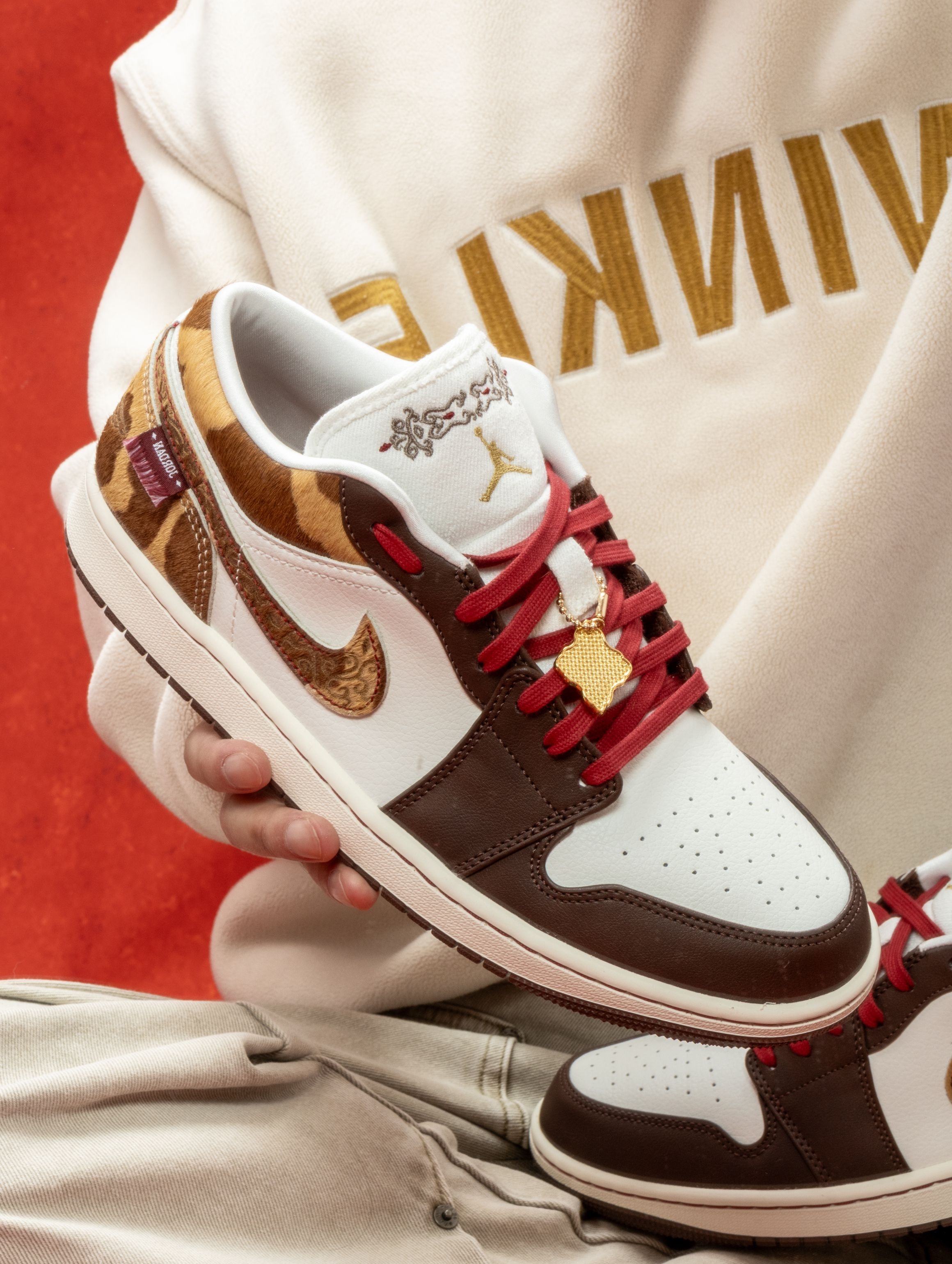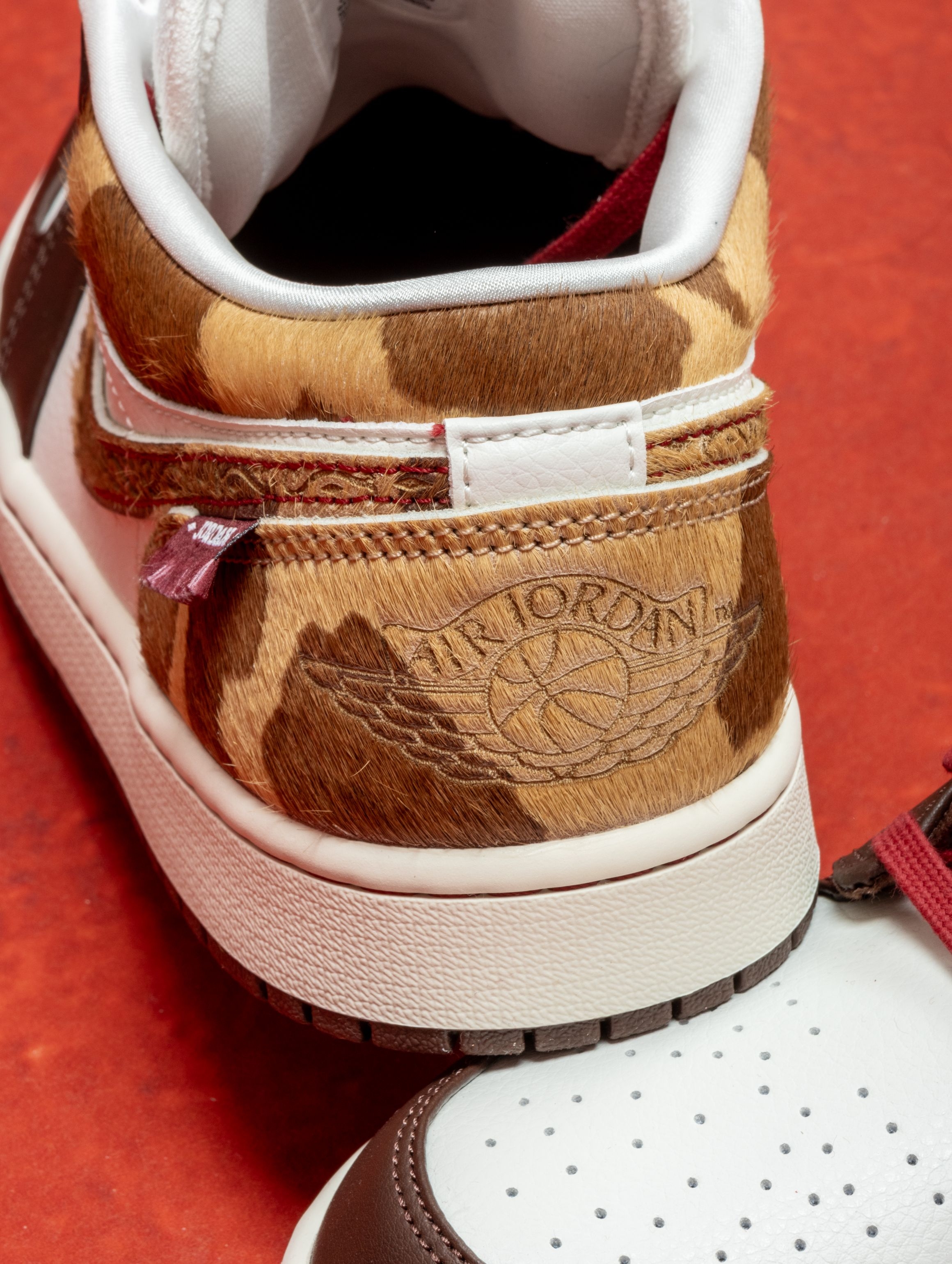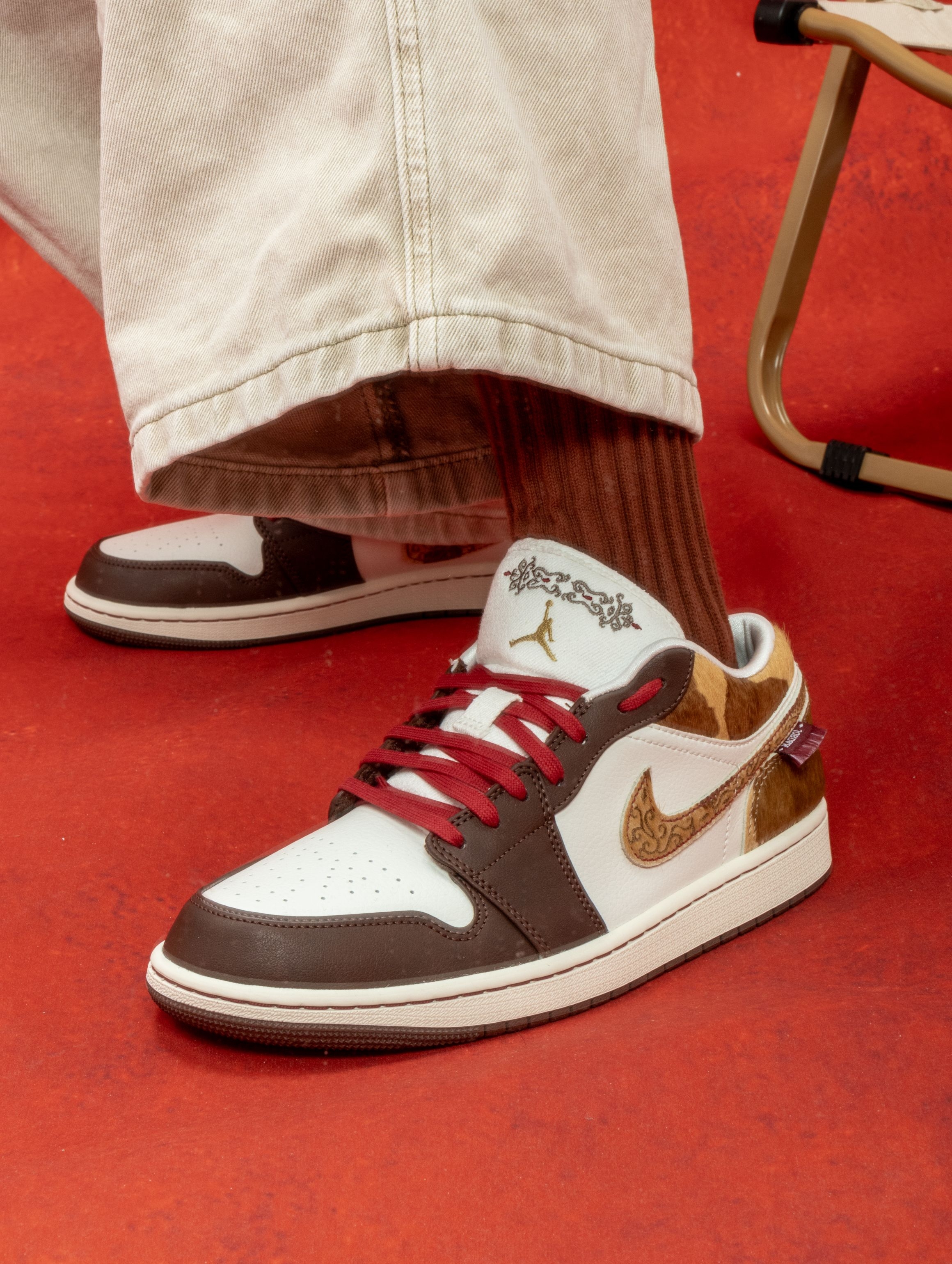 AJ1这双马年限定实物太顶了!店里挂着的时候还没觉得怎么样,上脚一试直接走不动道😂 棕褐色荔枝皮软得很,Swoosh和后跟那一圈小马毛摸着贼舒服,阳光下还有淡淡光泽感。鞋头那朵花卉刺绣精致得不像是球鞋该有的东西,鞋舌卷轴标签打开还藏着祝福彩蛋——这种小心思真的戳我。 上脚第一感觉就是不用磨合,皮质软得直接能穿出门。 一双能把新年氛围和日常百搭焊得这么死的鞋,值得拥有。