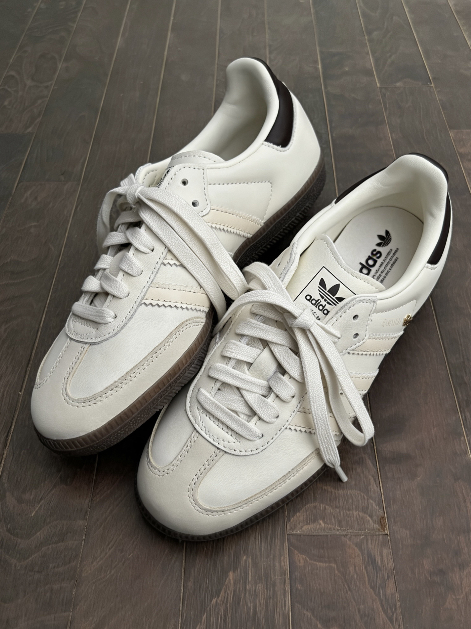 🩶火了半个多世纪的经典德训鞋型,实力真的不用多说,这双更是把配色和质感直接拉满。 🩶整体是奶fufu的米白主调,不是生硬的冷白色,自带柔焦滤镜,同色系的浅调三道杠低调又有层次,完全不会有突兀感 🩶后跟的黑色尾标做了恰到好处的点睛,中和了温柔感多了几分利落,鞋侧的小金标和复古生胶大底更是灵魂所在,拿在手里就能感受到细腻皮革的高级质感