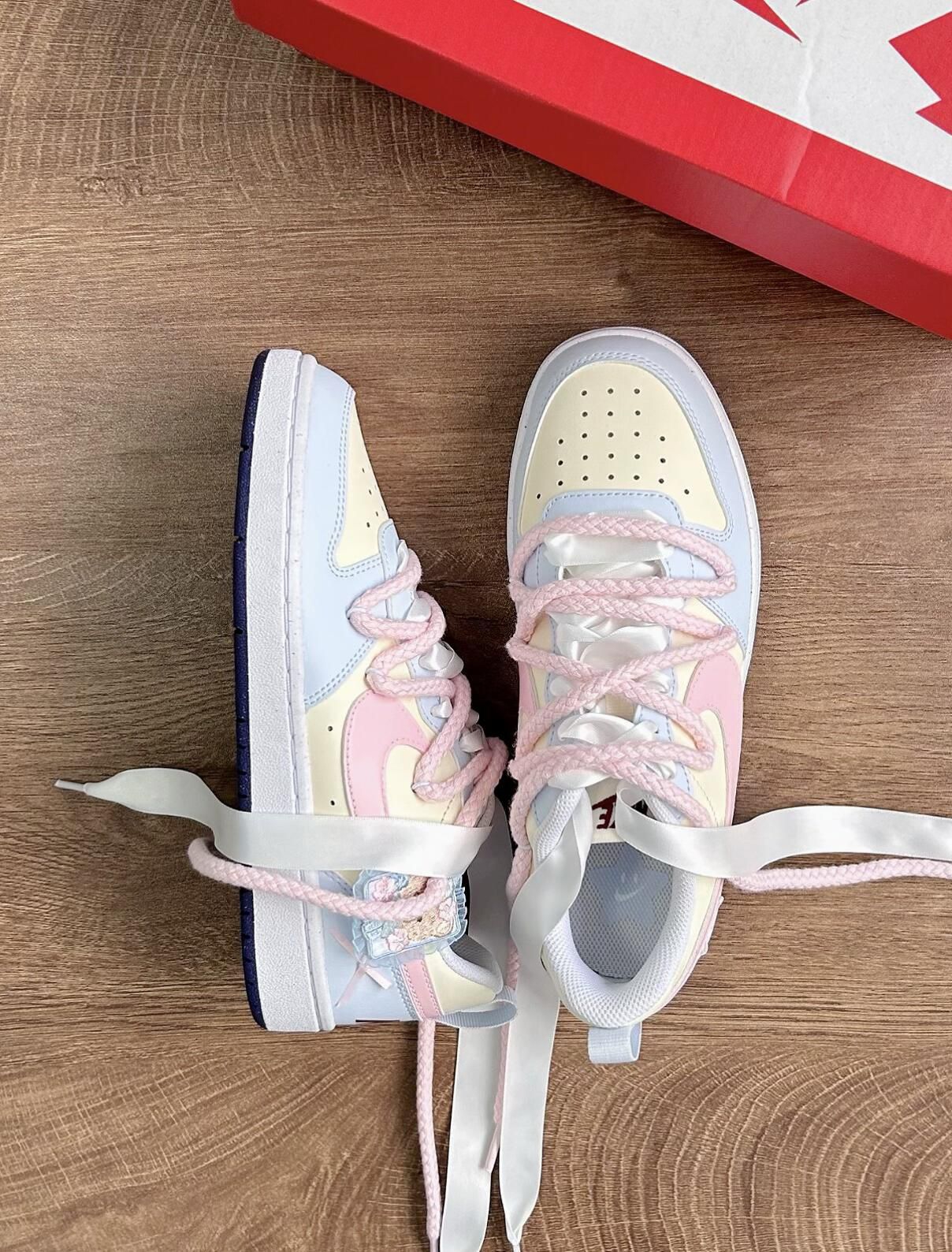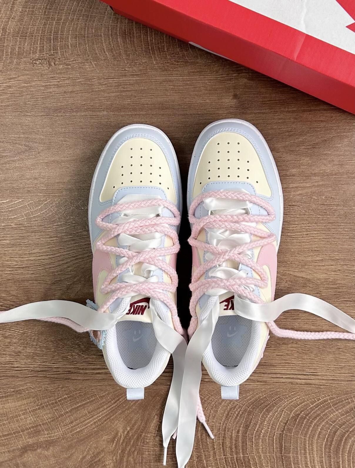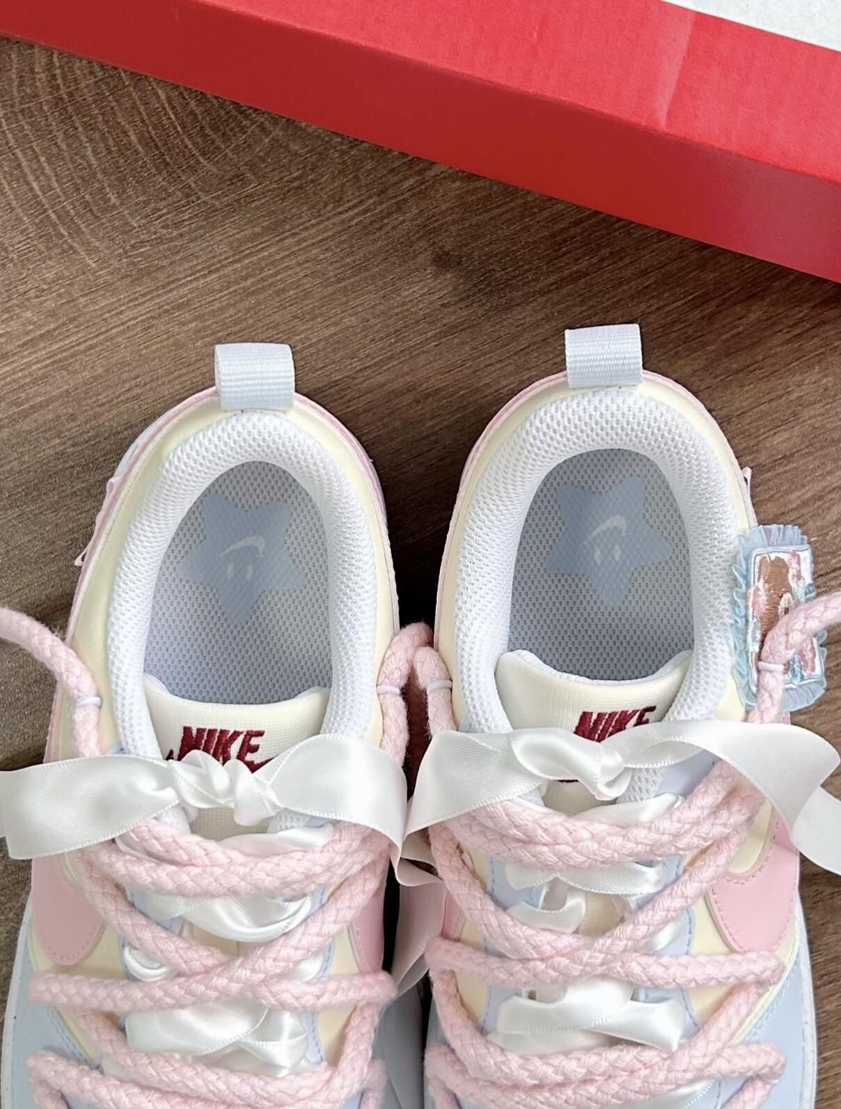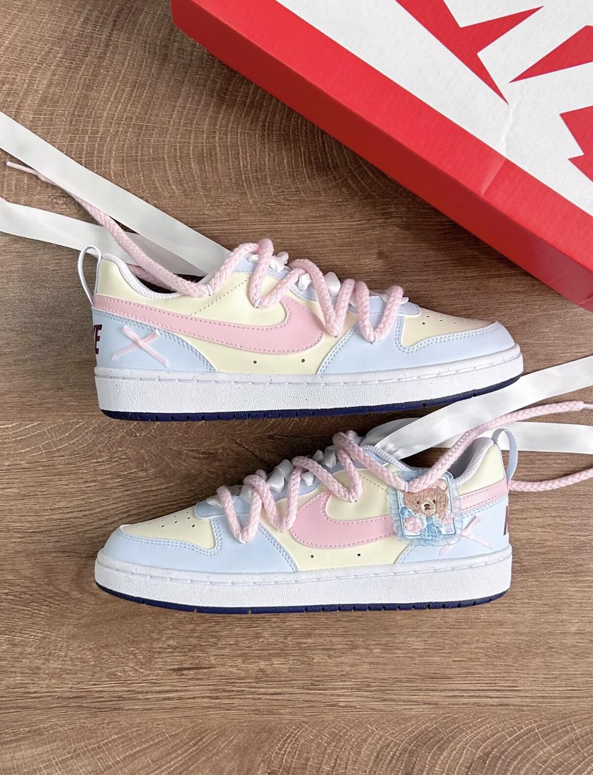 🌷开春开学季到来,真的疯狂种草🌱这双Nike court的酥酥🐻,简直太适合春天了 鞋身🌸粉粉嫩嫩的樱花粉调调,配上清爽的蓝色点缀,甜度直接拉满! 我真的要夸爆鞋侧的小熊图案,软乎乎的超可爱,瞬间戳中我的少女心!上脚亲测巨舒服,鞋型贴合脚面,暴走大半天都完全不磨脚,对我这种怕磨脚星人太友好了。 春夏搭配小裙子穿简直绝了,甜妹氛围感直接拿捏,出门随便拍都巨出片!