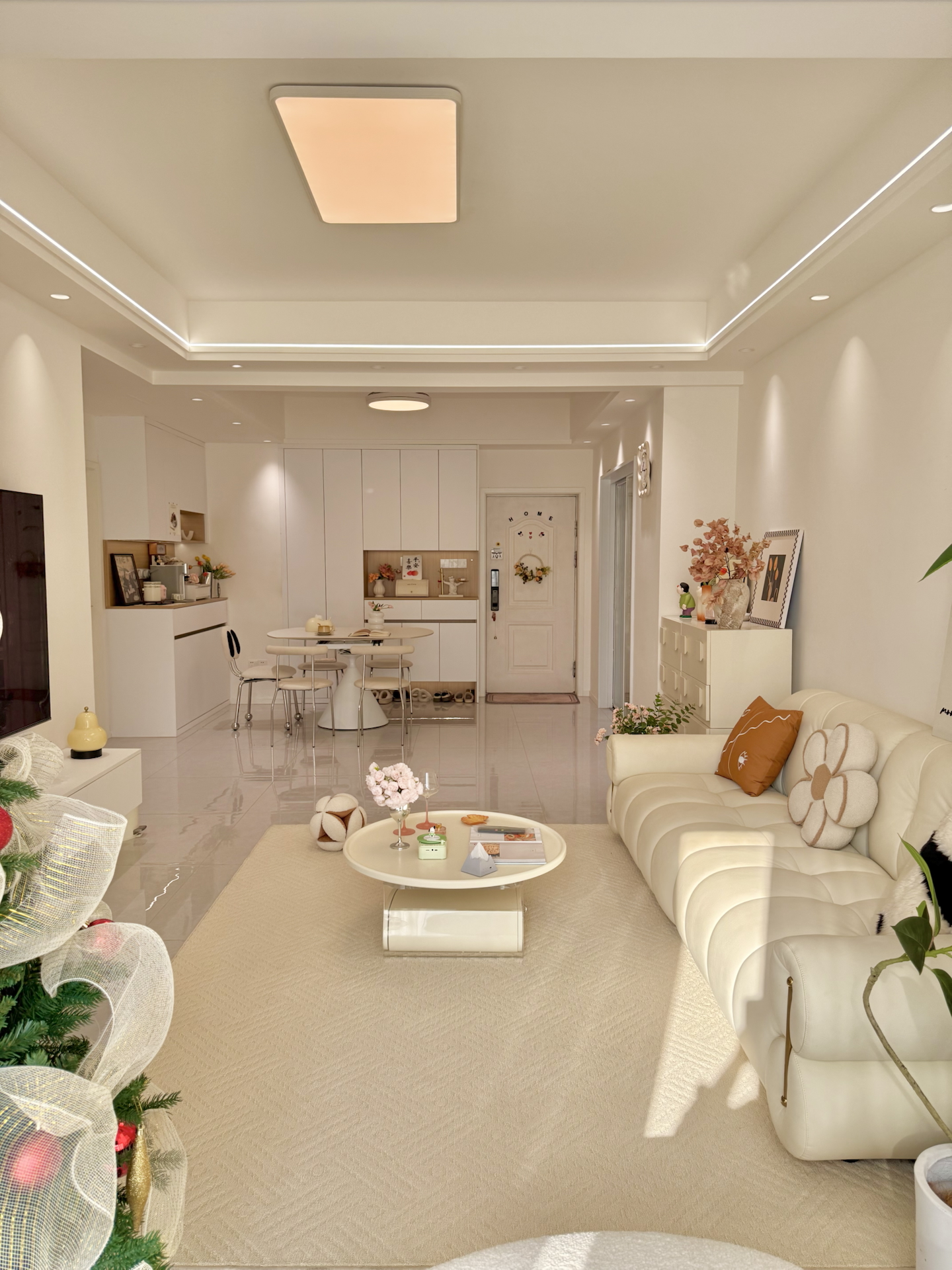 当初不顾我妈反对,封了阳台做大落地窗,布置成我喜欢的休闲区!不仅采光更好,客厅也更敞亮了,平时坐在阳台摇摇椅上,看看书喝喝茶真的太惬意了~ 关于客厅: 🔸全屋通刷浅色乳胶漆,温馨又耐看,让人倍感舒适 🔸简单的双眼皮吊顶,嵌入线线灯射灯,打下来的小山丘很有氛围感,让空间更具层次感 🔸拆掉推拉门,封阳台做大落地窗,通透显大,让室内外更加通畅 🔸做了餐边柜和鞋柜,常用物品收纳起来,显得整个空间通透干净...