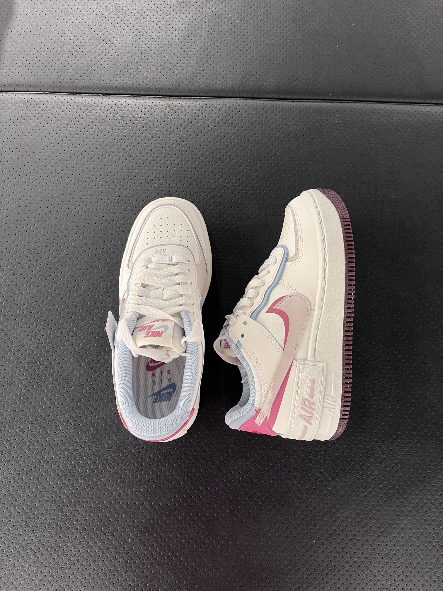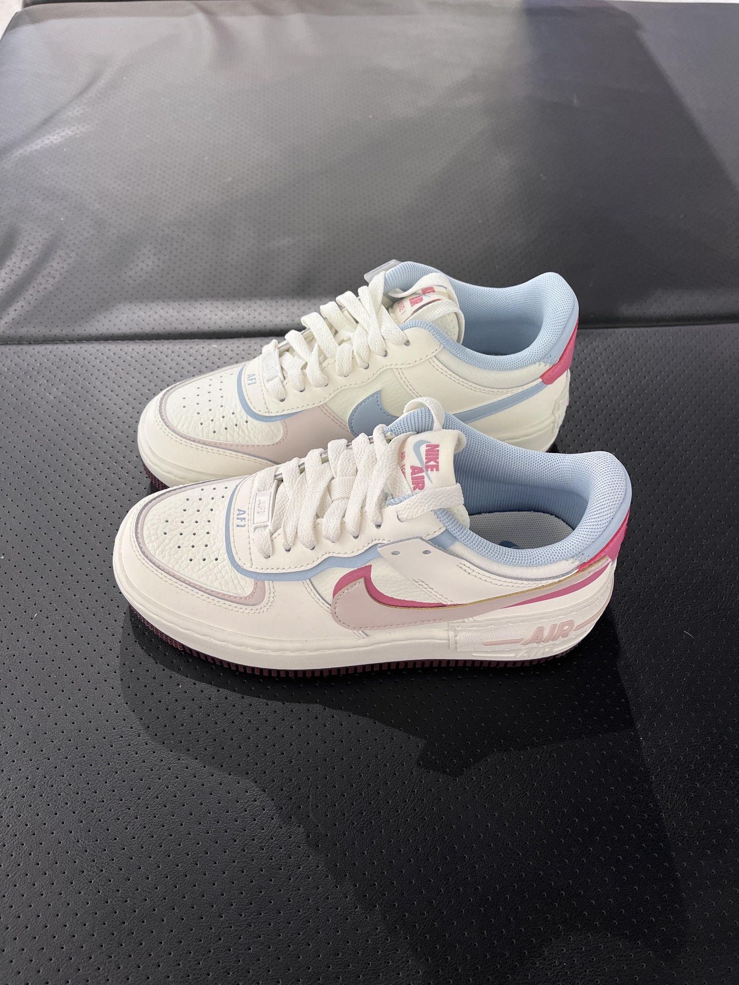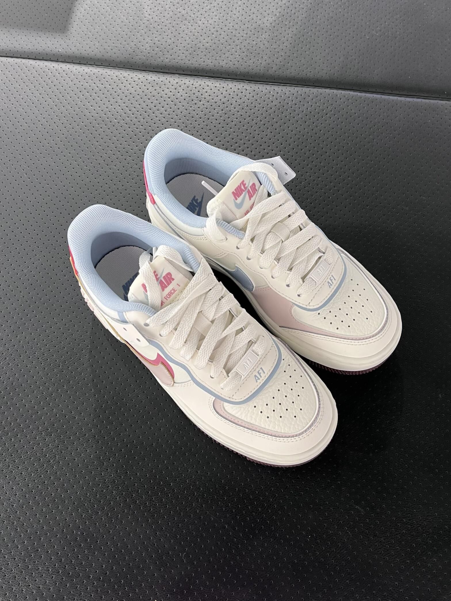 客选新款!这双粉蓝Shadow空军一号谁不爱呢~ 米白底色➕奶蓝➕樱花粉的撞色太甜啦! 解构双钩的设计自带层次感,一点都不单调~ 上脚显腿细,脚感软乎乎的不磨脚,不管是搭牛仔裤还是小裙子都巨好看!