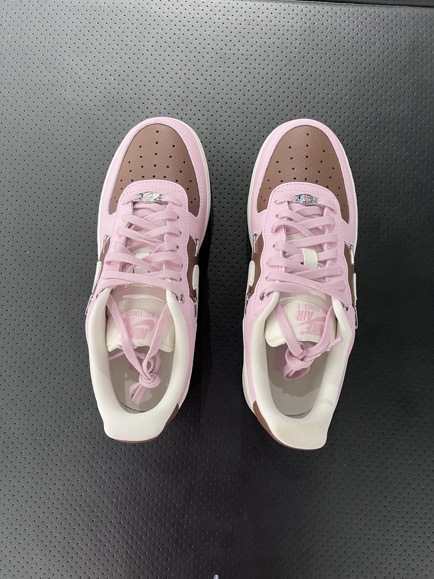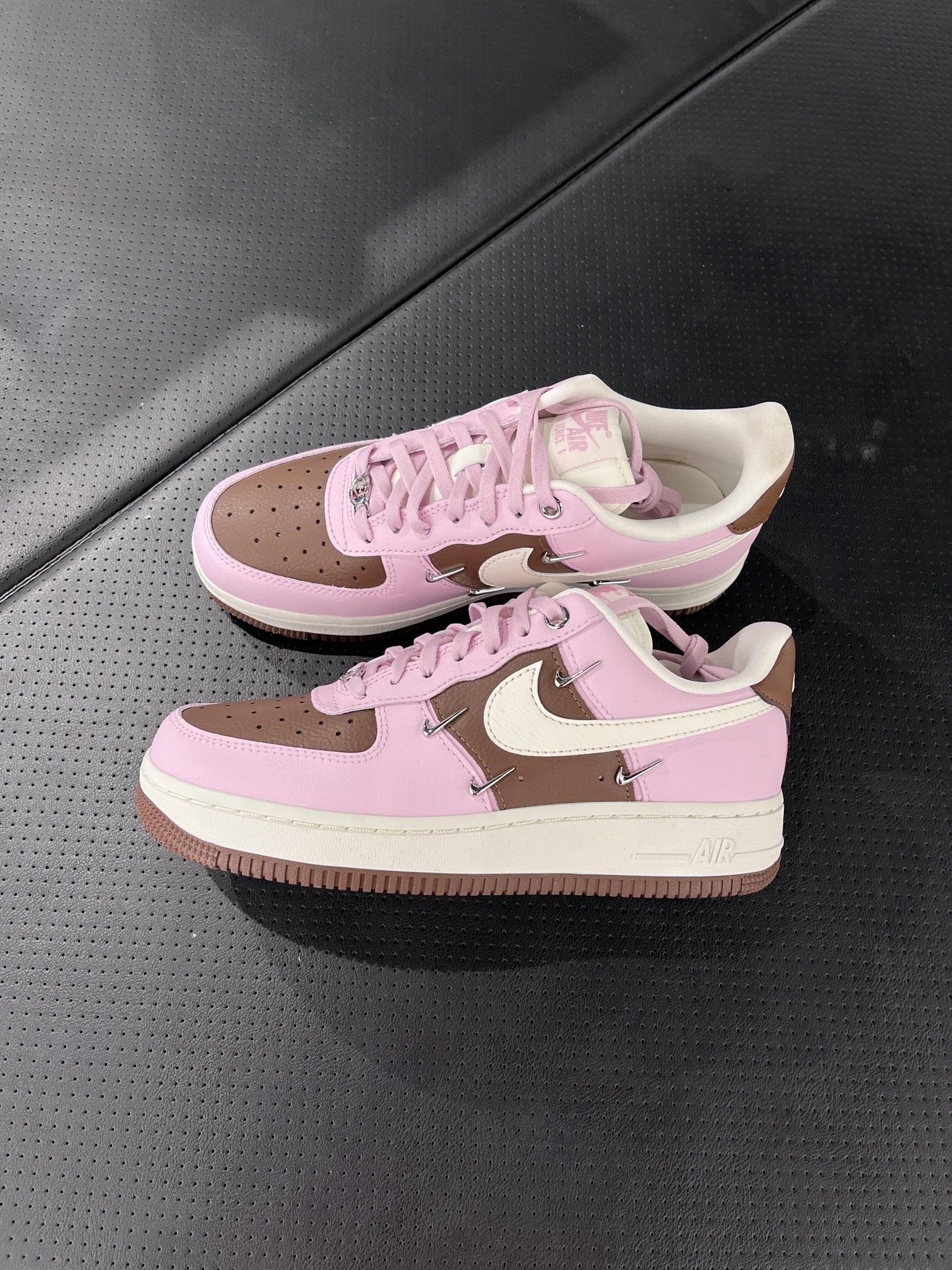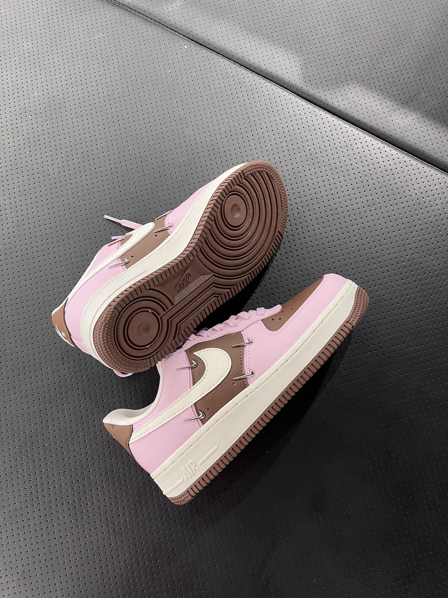 这双Nike Air Force 1也太懂甜酷女孩了! 樱花粉➕焦糖棕的配色,四个金属小银钩超别致~ 配卫衣、牛仔裤都超有范儿!