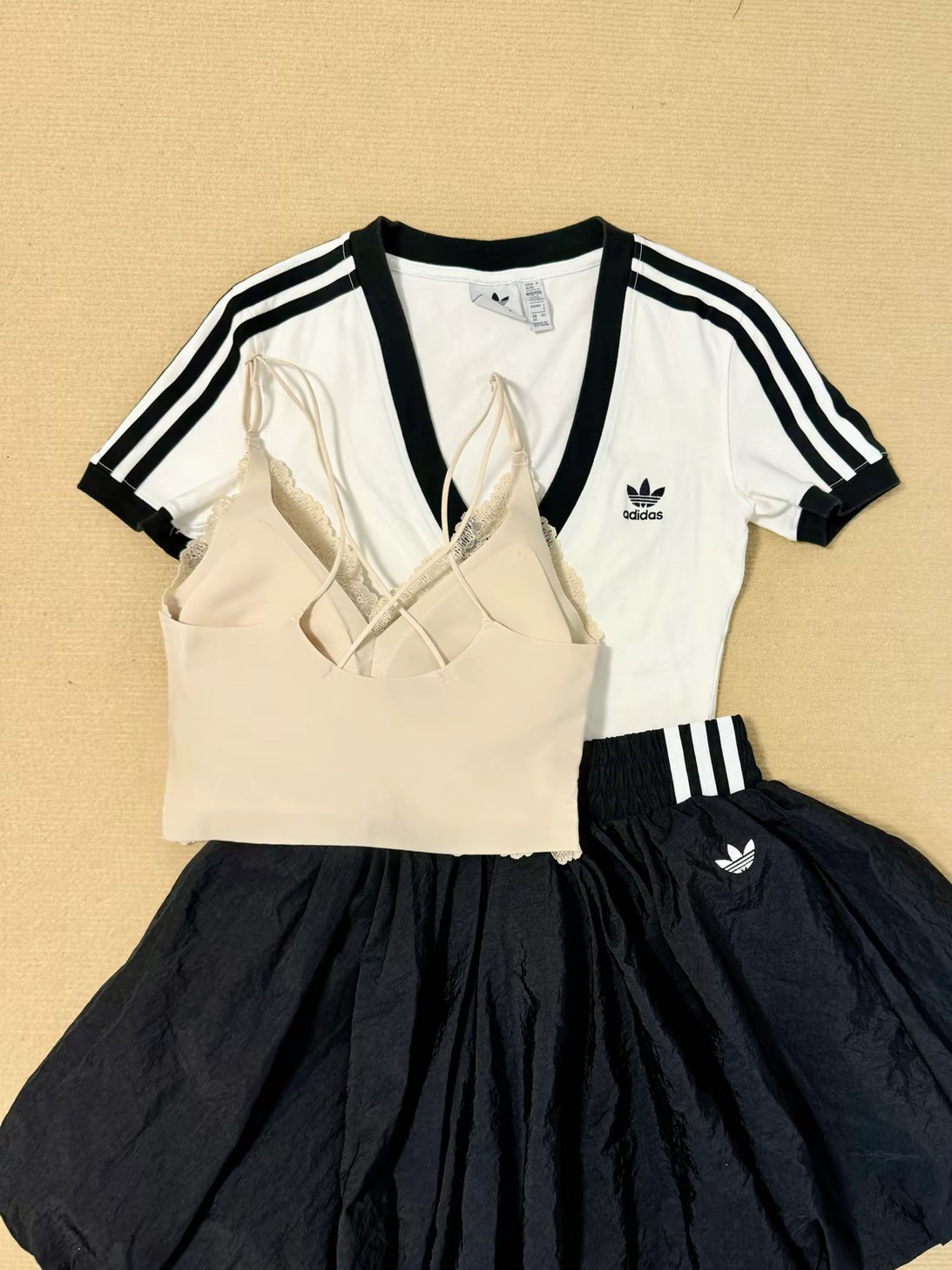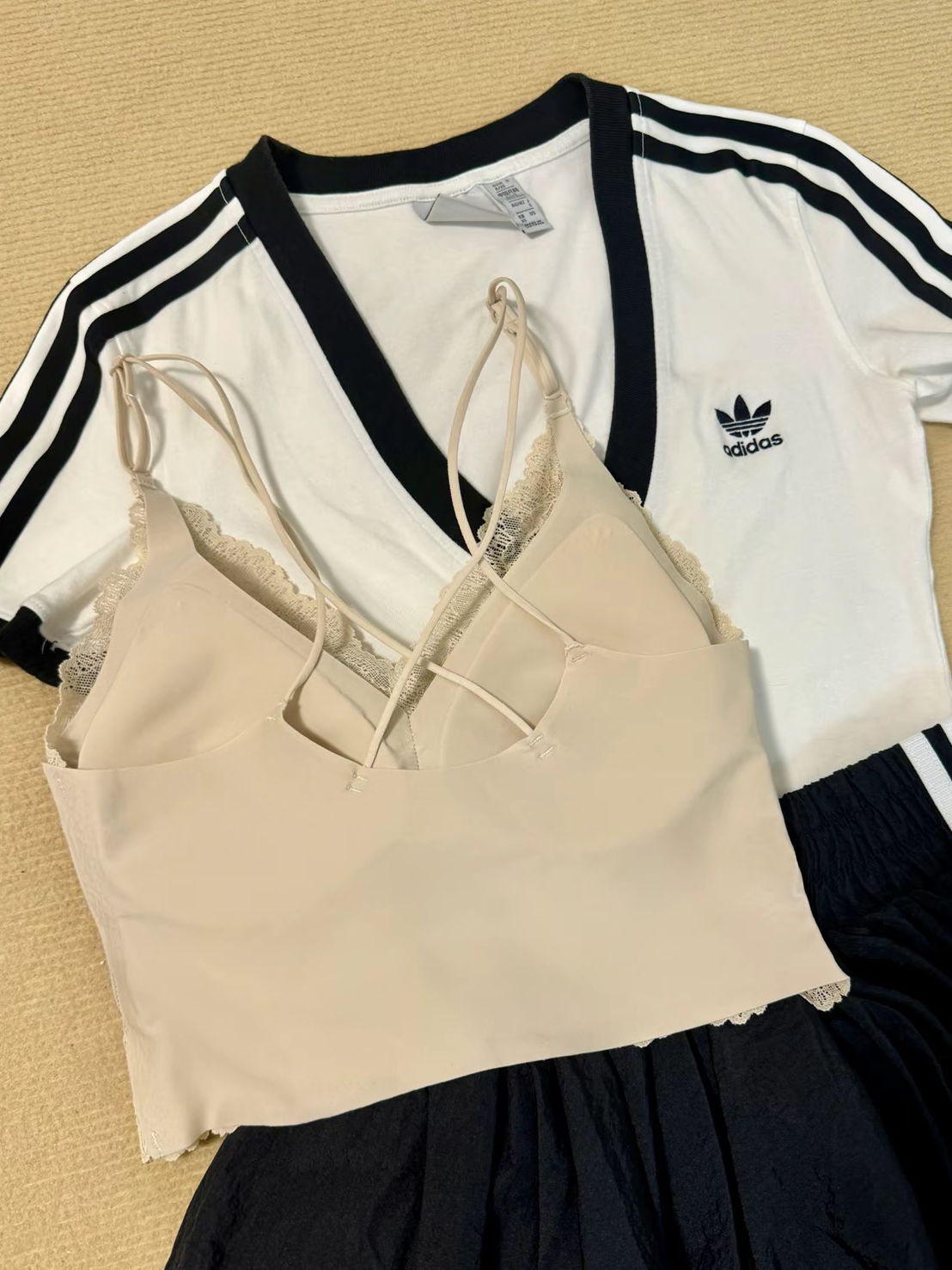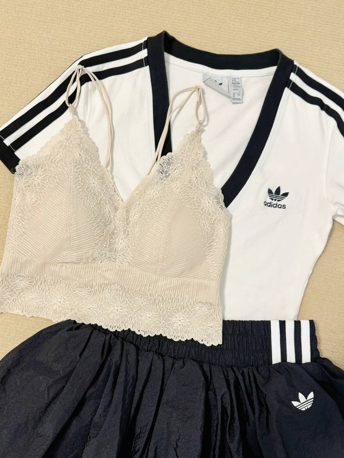 这一身阿迪黑白色系ootd泰韩里韩气了吧,我也是今年才get到蕾丝叠穿这么香的,阿迪这件T恤是有点低领的嘛,蕾丝叠穿在里面露出点蕾丝边边,哇老好看了,就是那种高级韩女感拿捏!我买的是幸棉家的,它蕾丝面料还挺软的不咋扎皮肤,贵是有贵的道理啦!