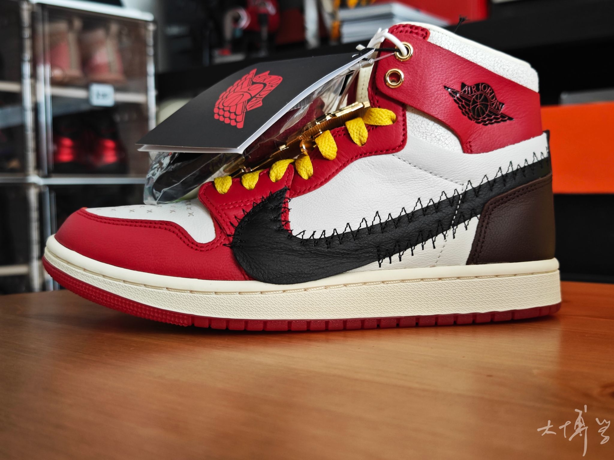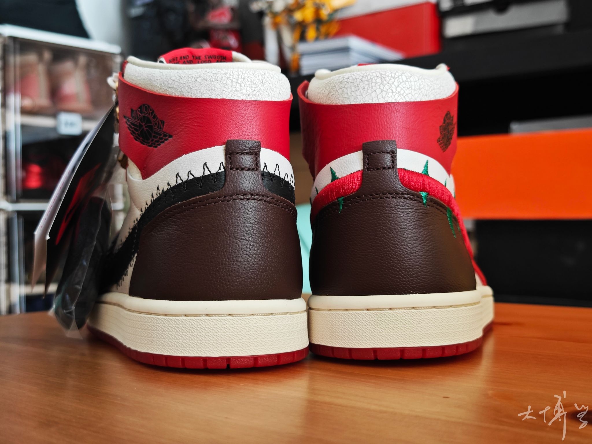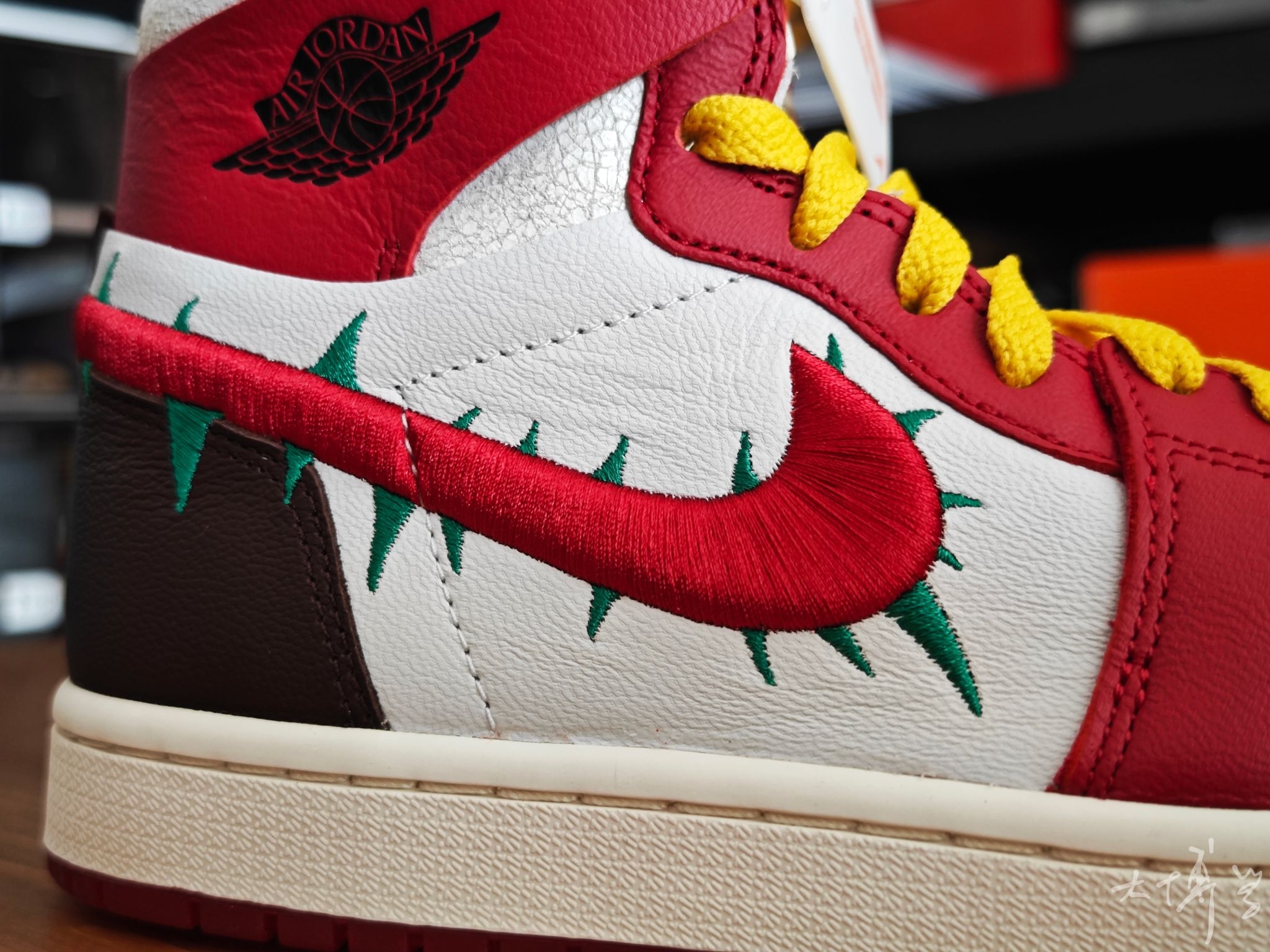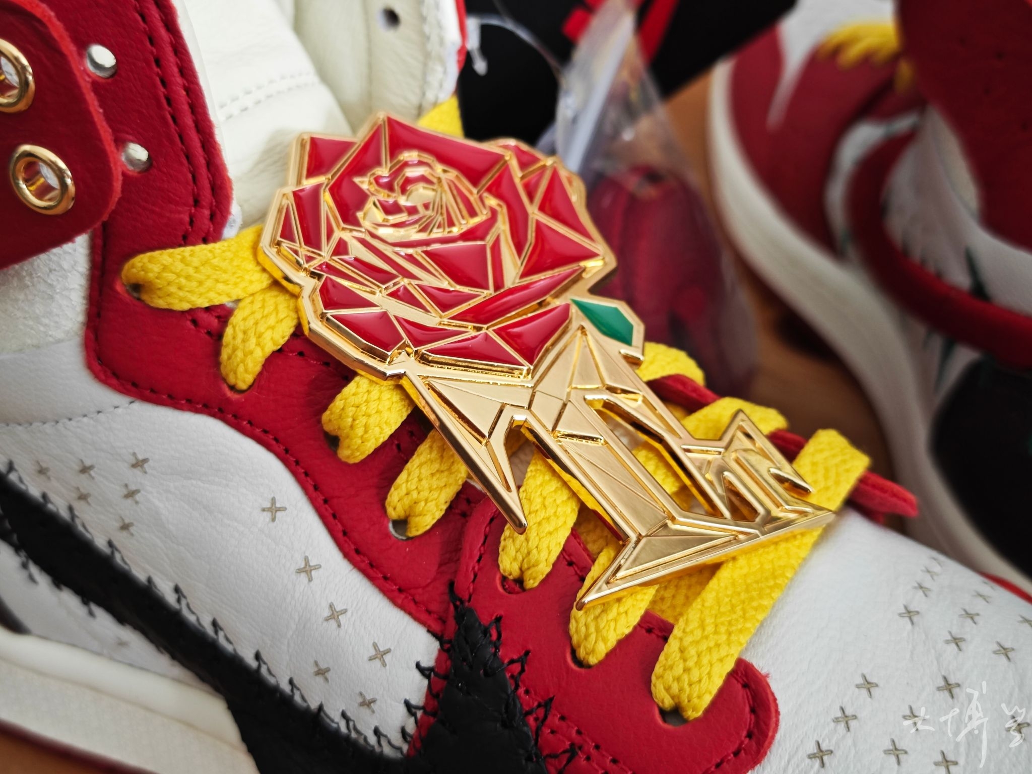 一双芝加哥红白配色的AJ1 可以说是我最喜欢的一款AJ1 鞋面由皮革打造 鞋帮处的龟裂皮革是我唯一不太满意的地方 右脚是带有绿色荆棘刺绣的红色Swoosh 左脚则是带有锯齿缝线的黑色大Swoosh 呼应“玫瑰带刺”的主题 随鞋附赠的金色玫瑰金属挂饰更是点睛之笔 可惜大码太少了...