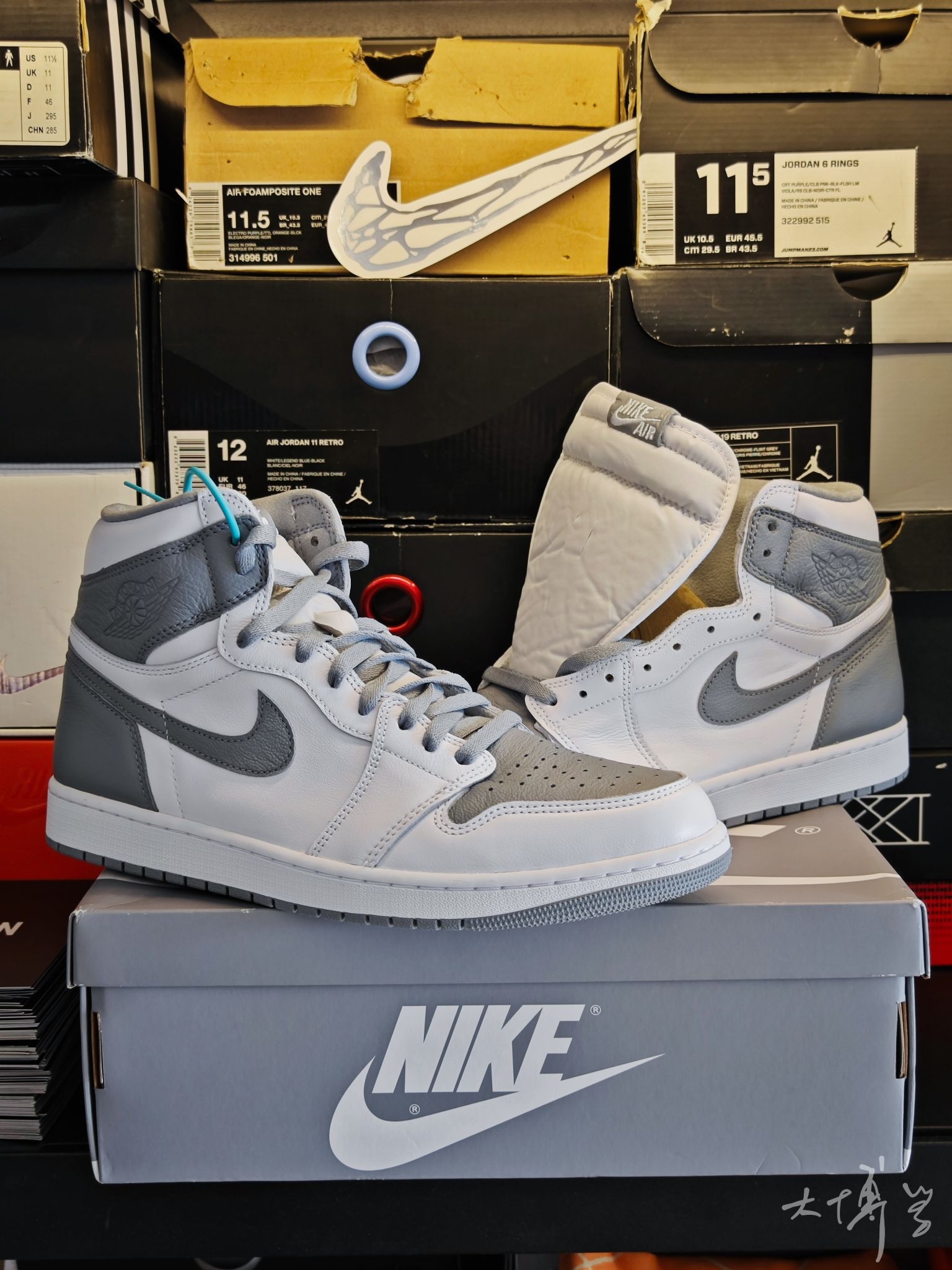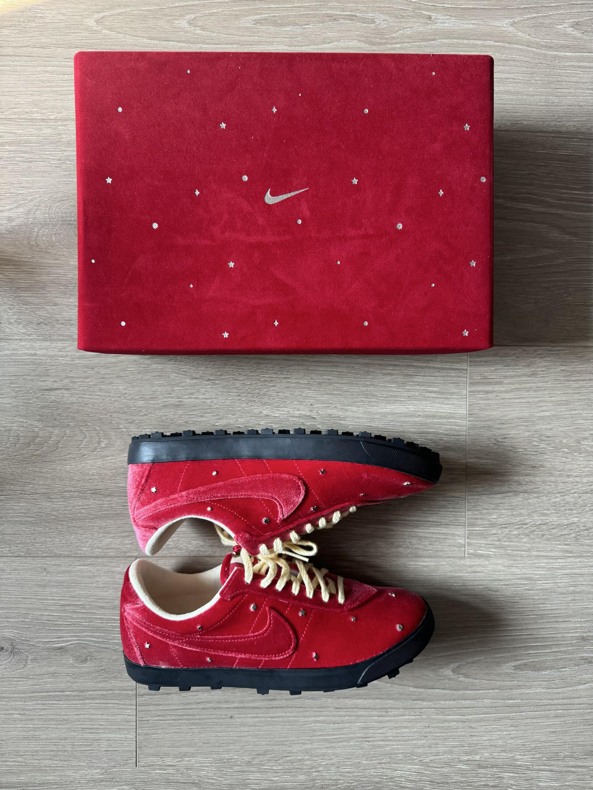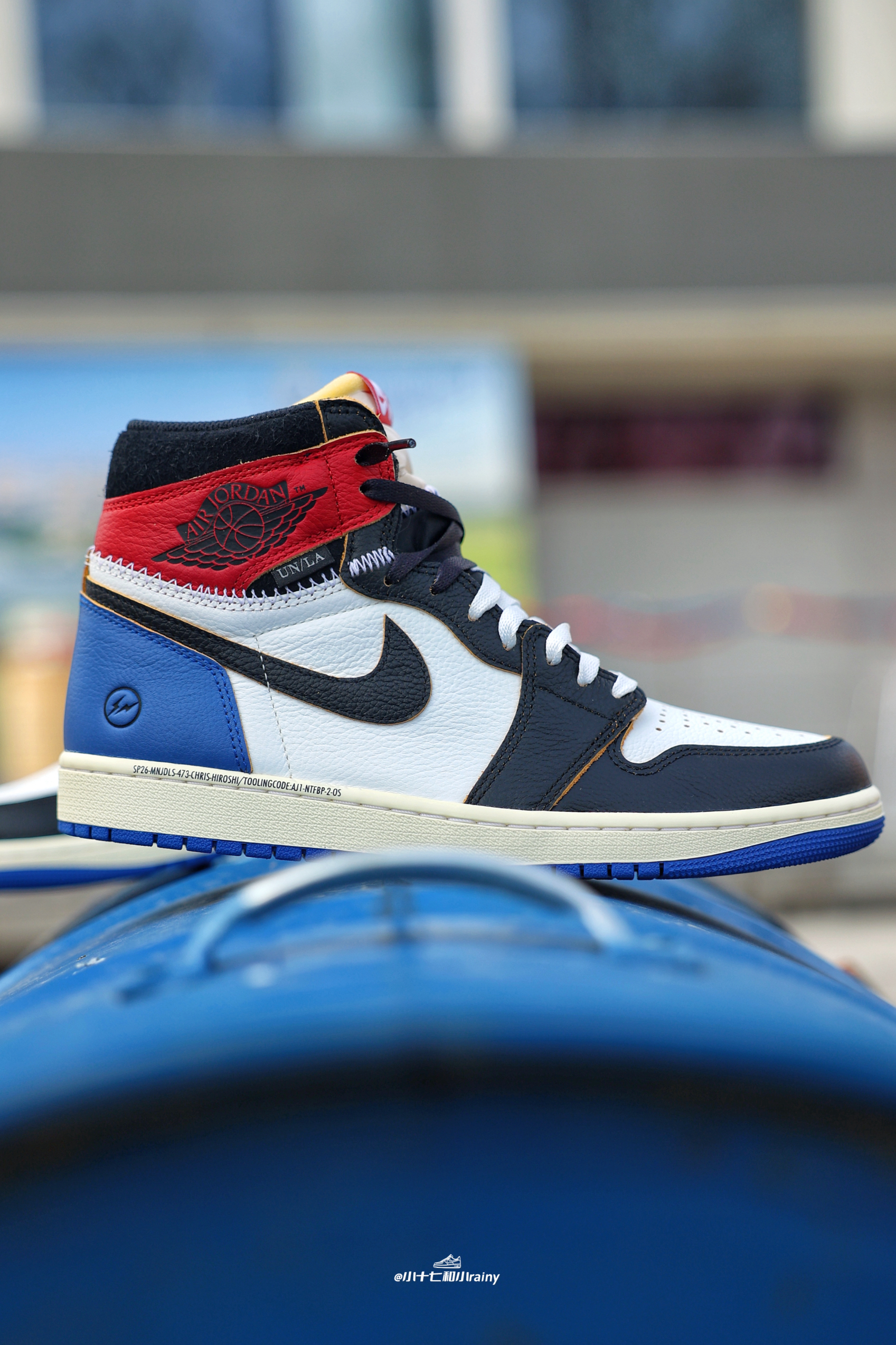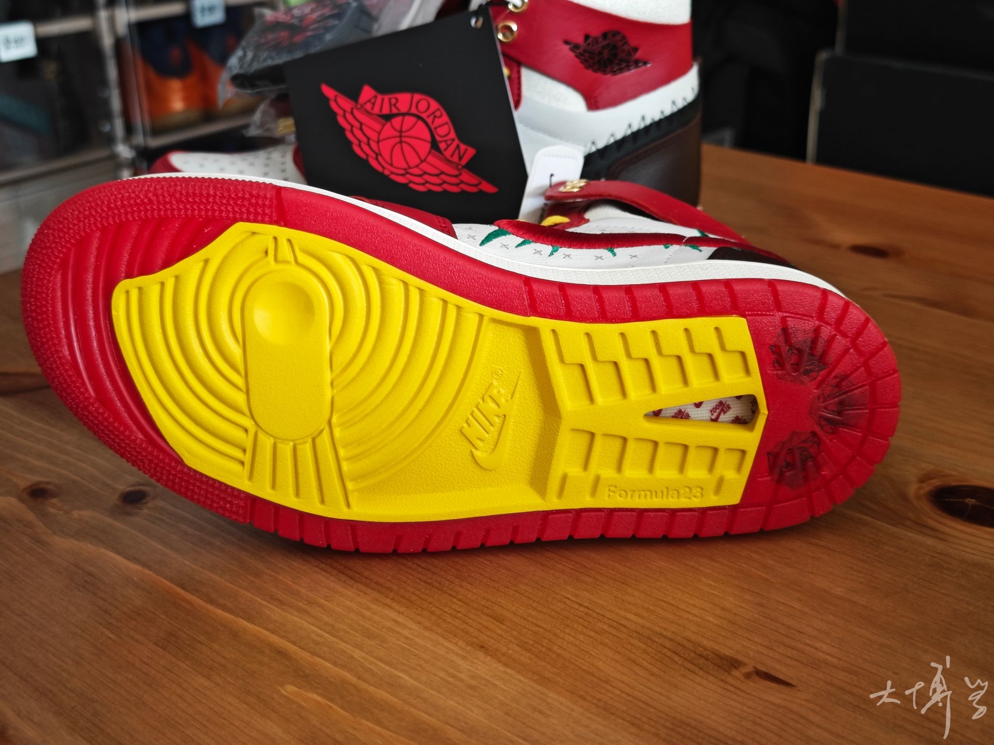 一双芝加哥红白配色的AJ1 可以说是我最喜欢的一款AJ1 鞋面由皮革打造 鞋帮处的龟裂皮革是我唯一不太满意的地方 右脚是带有绿色荆棘刺绣的红色Swoosh 左脚则是带有锯齿缝线的黑色大Swoosh 呼应“玫瑰带刺”的主题 随鞋附赠的金色玫瑰金属挂饰更是点睛之笔 可惜大码太少了...