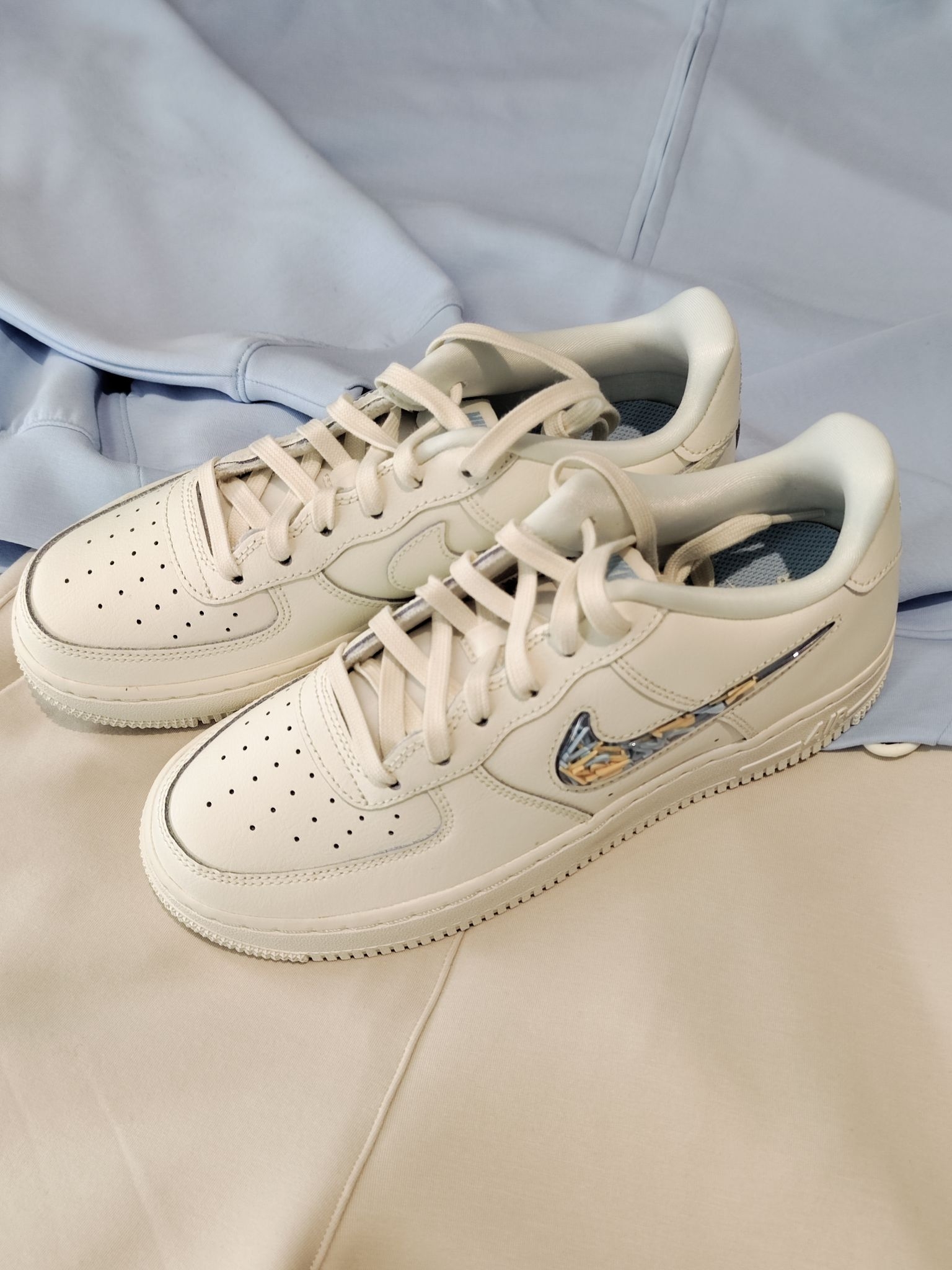 谁能拒绝一双奶白色的空军一号啊!!这双的Swoosh真的绝绝子,大的swoosh里面填充很多小的swoosh,趣味多多,细节感直接拉满~ #玩转swoosh #宝藏板鞋空军一号白 #空军一号NIKE爱了爱了 #耐克经典白色空军一号 #国庆出游穿这身