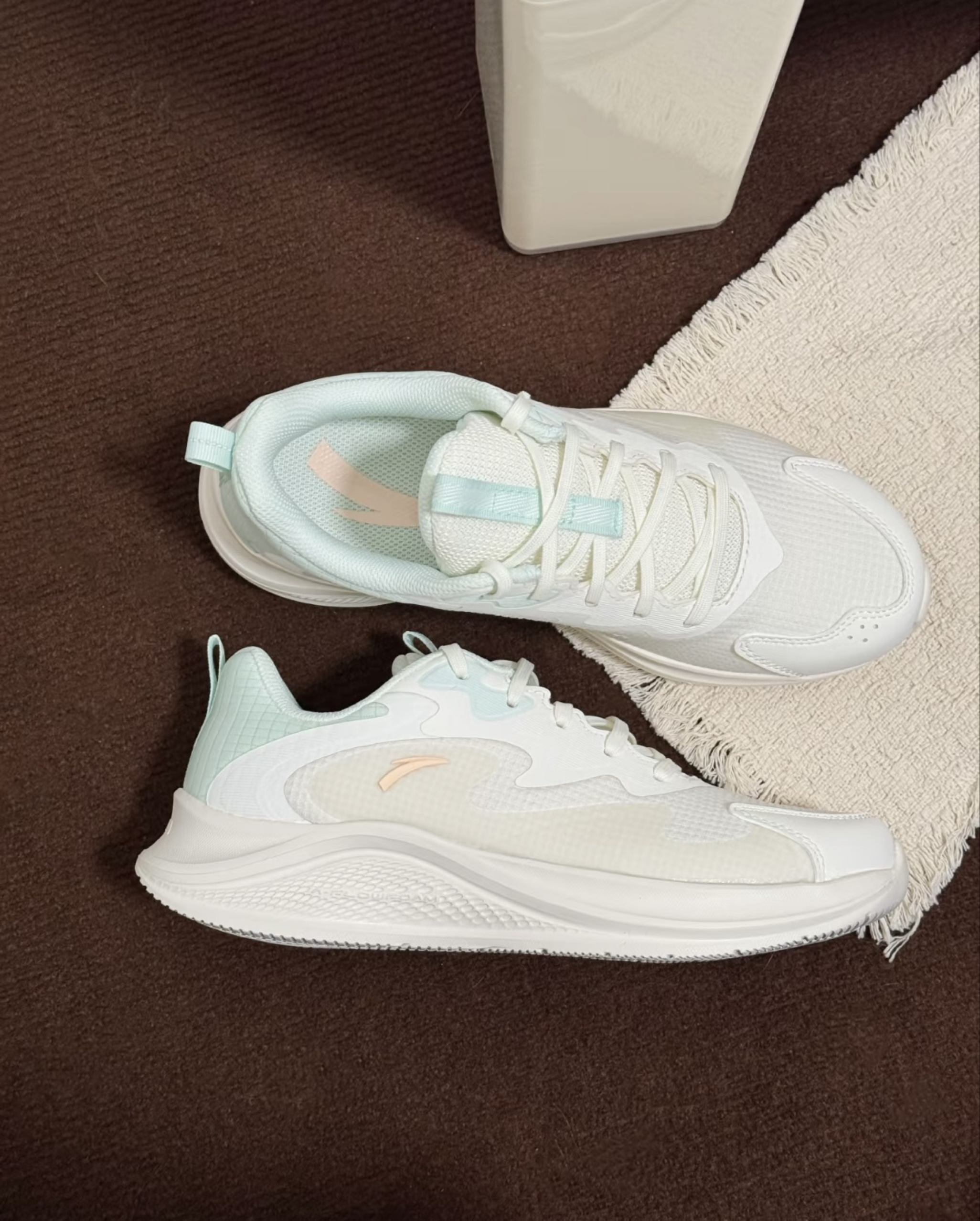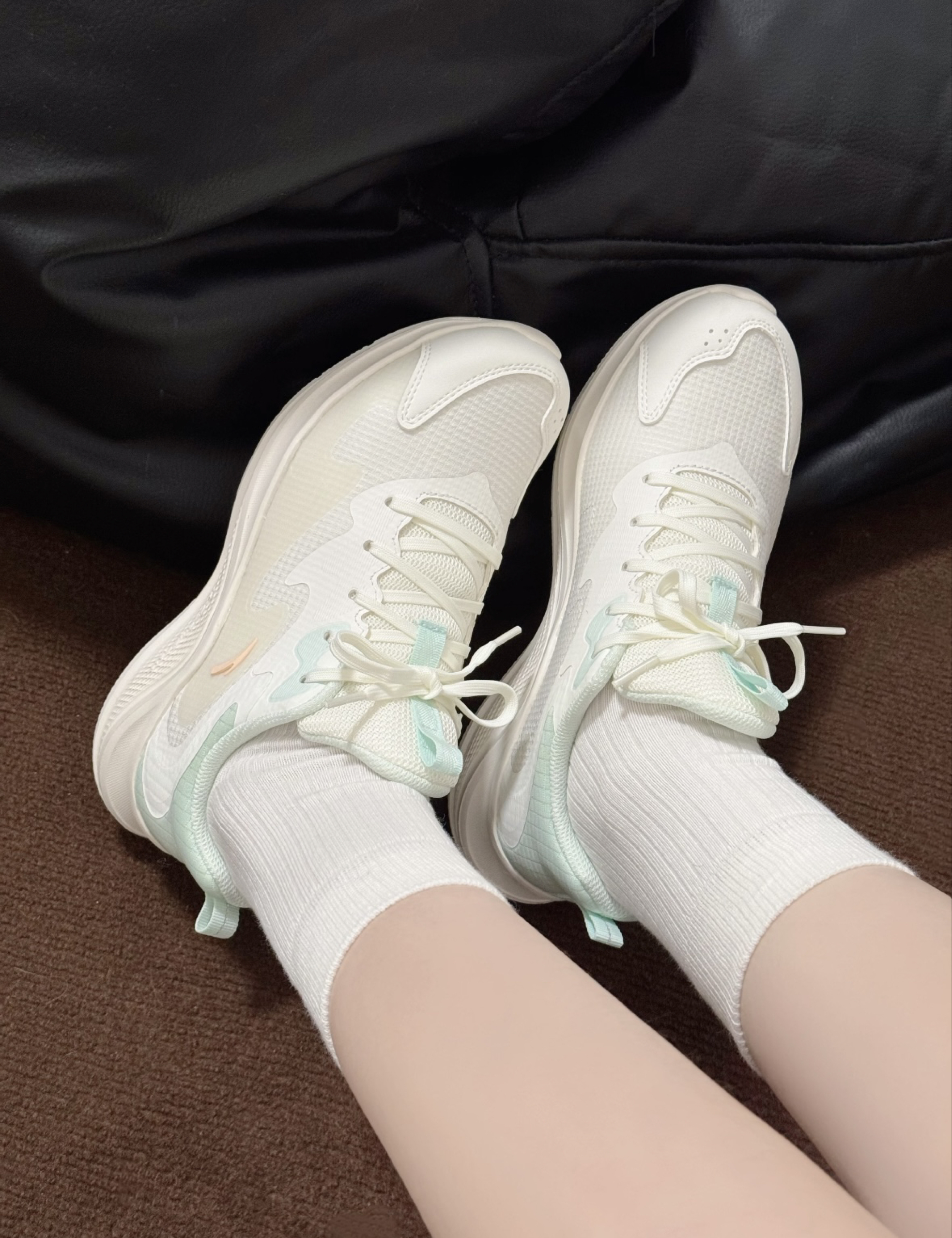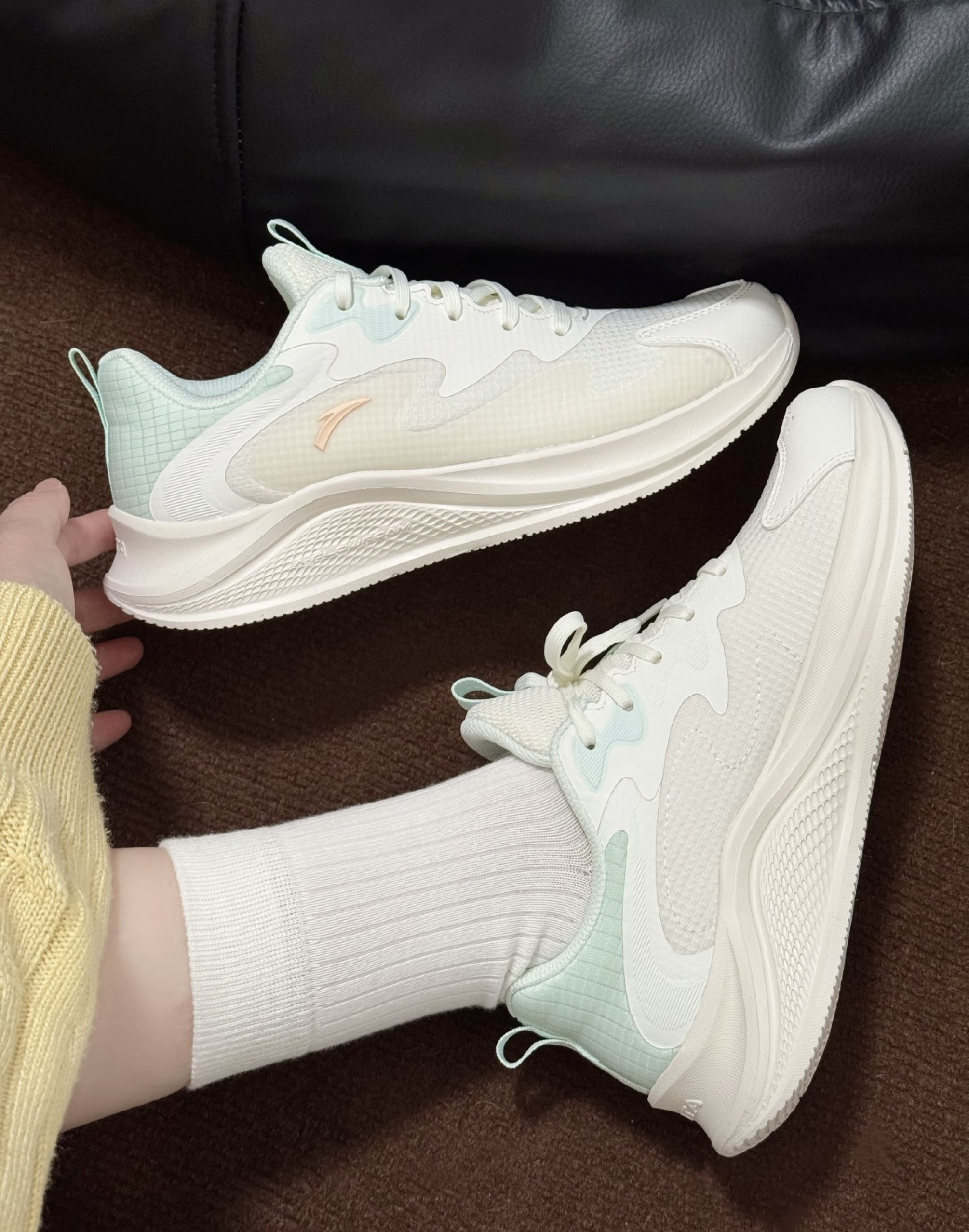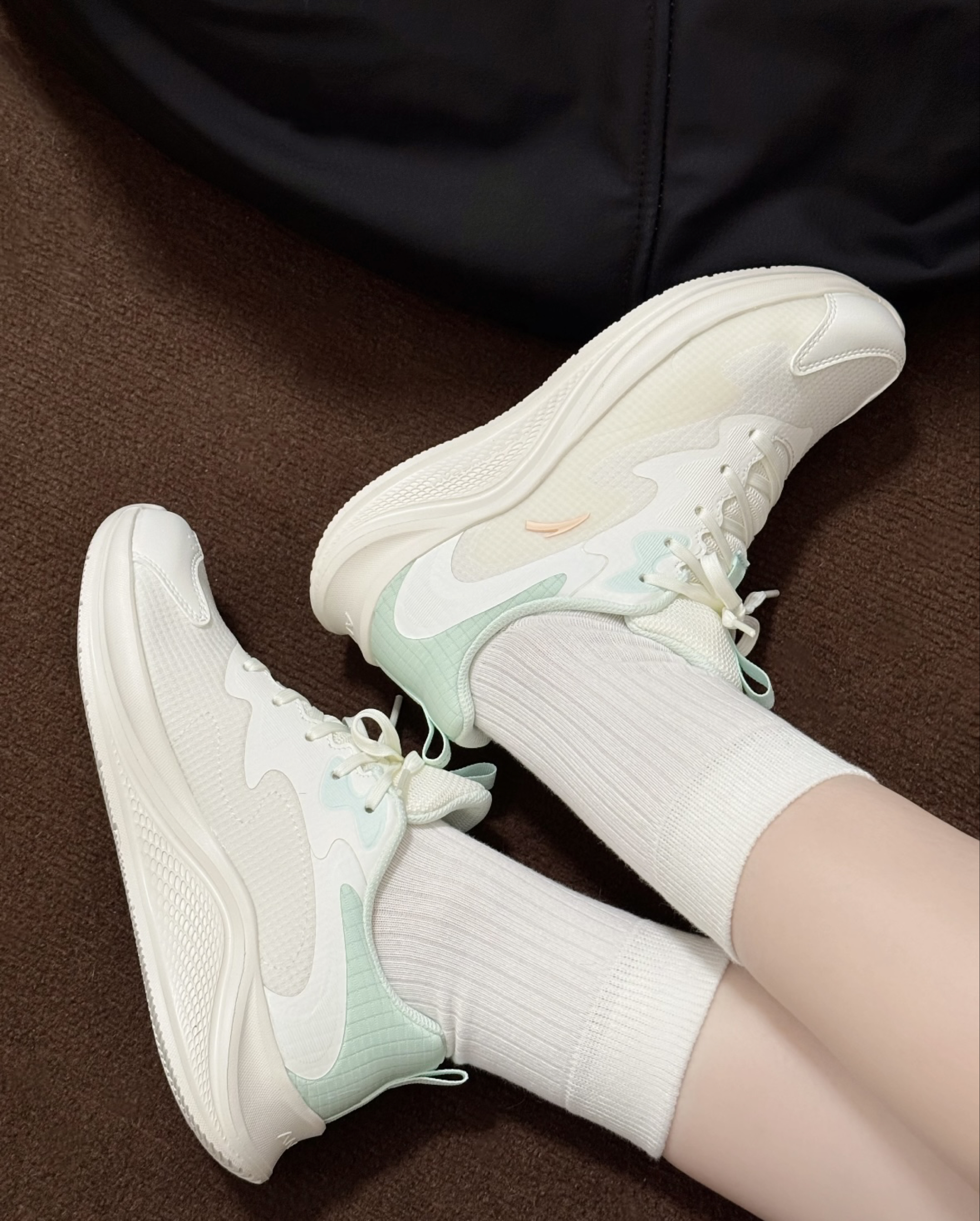 颜值拉满:奶白底色搭配清新的薄荷绿点缀,像一杯加了冰的薄荷奶绿,温柔又清爽。搭配白袜子和浅色系下装,瞬间营造出春日的松弛感,完全是“氧气少女”既视感。 • 脚感绝了:中底的缓震科技真的很顶,踩上去软弹软弹的,像踩在棉花糖上,走路、慢跑、跳绳都很舒服,久穿也不容易累脚。 • 透气不闷:网面材质很透气,春夏穿也不会闷脚,鞋身轻盈,日常通勤或者运动都毫无压力。 • 增高小心机:厚底设计自然增高,视...