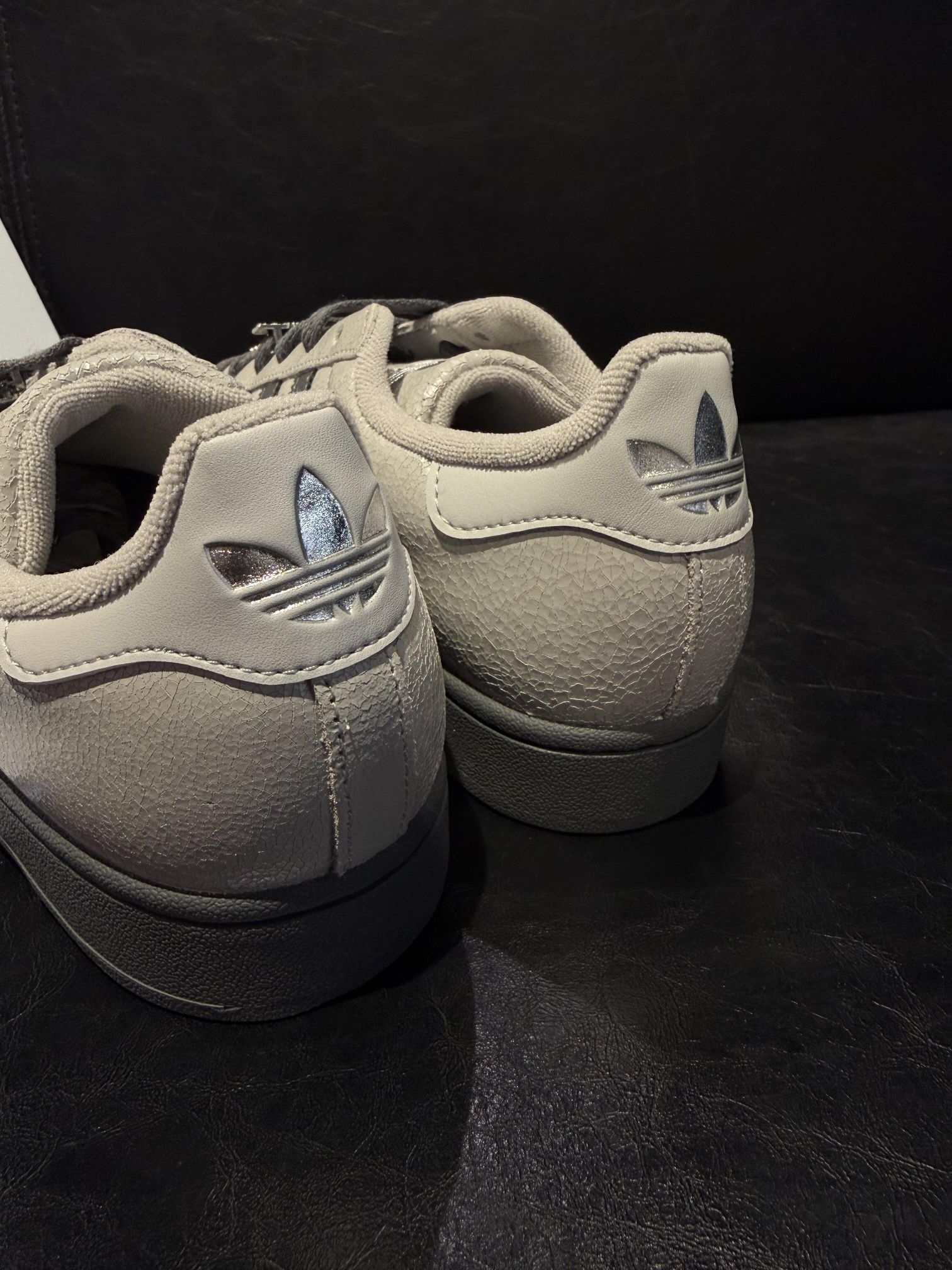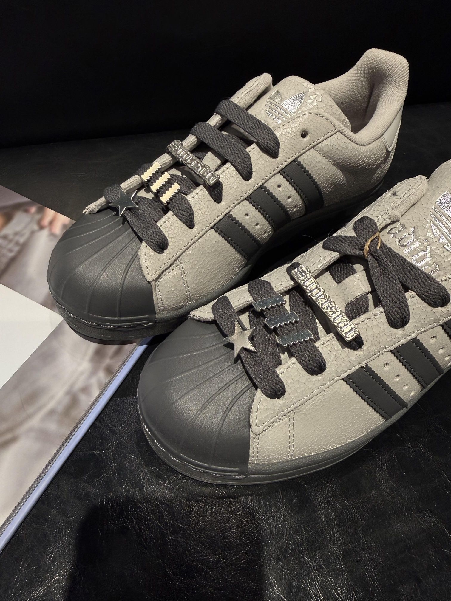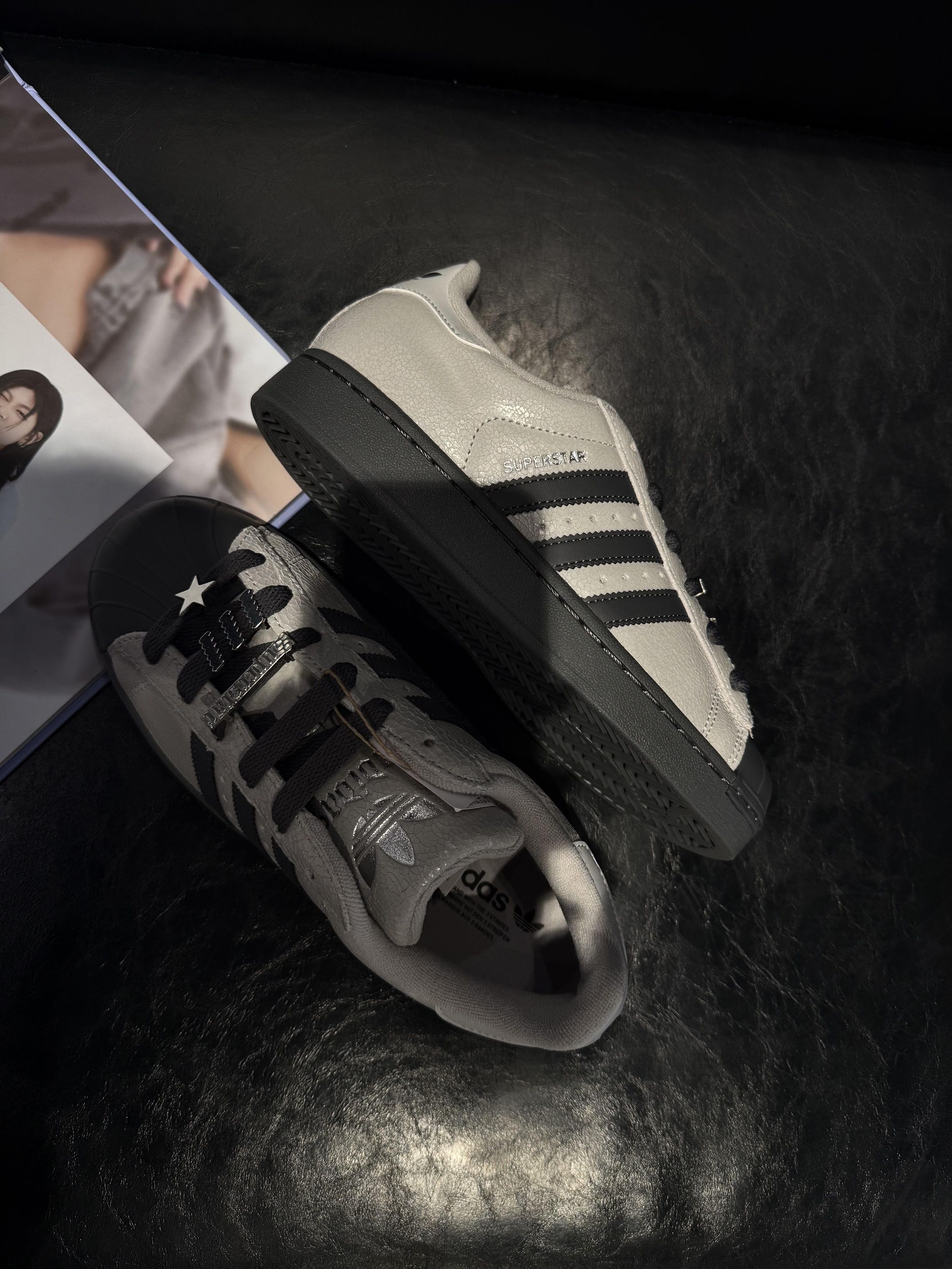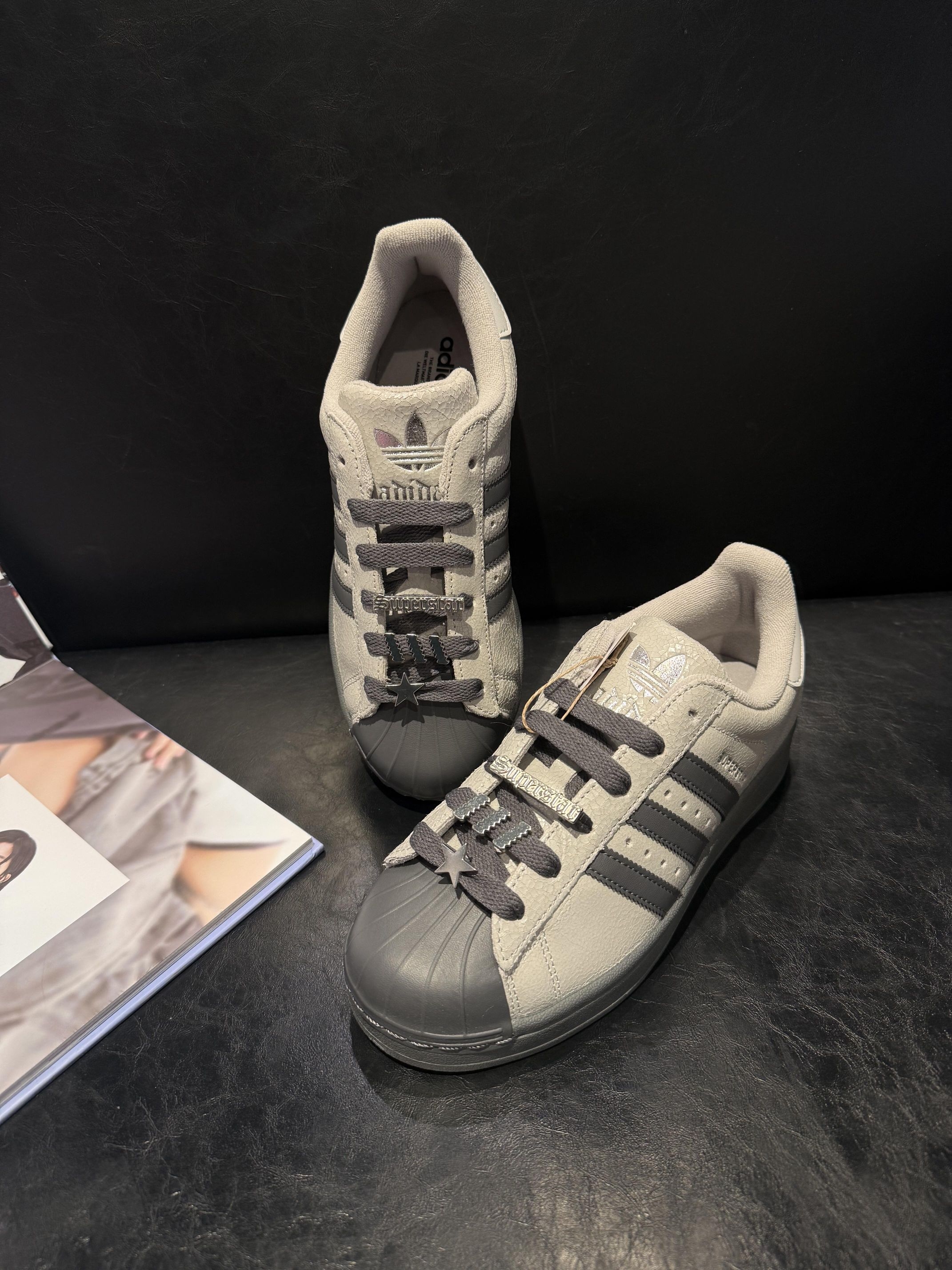 这双adidas Originals Superstar 2浅灰色,真的太酷了!😍 皮革鞋面细腻有光泽,浅灰色低调又带点复古质感,黑三条和灰鞋头对比鲜明,鞋带上的银饰超级闪,点缀星星和字母细节超有态度。鞋垫软弹有支撑,脚掌包裹稳稳的,走一整天都不觉得累~👟✨ 穿上它,整个人都自信起来了!姐妹们,这双真的绝,赶紧冲~💕