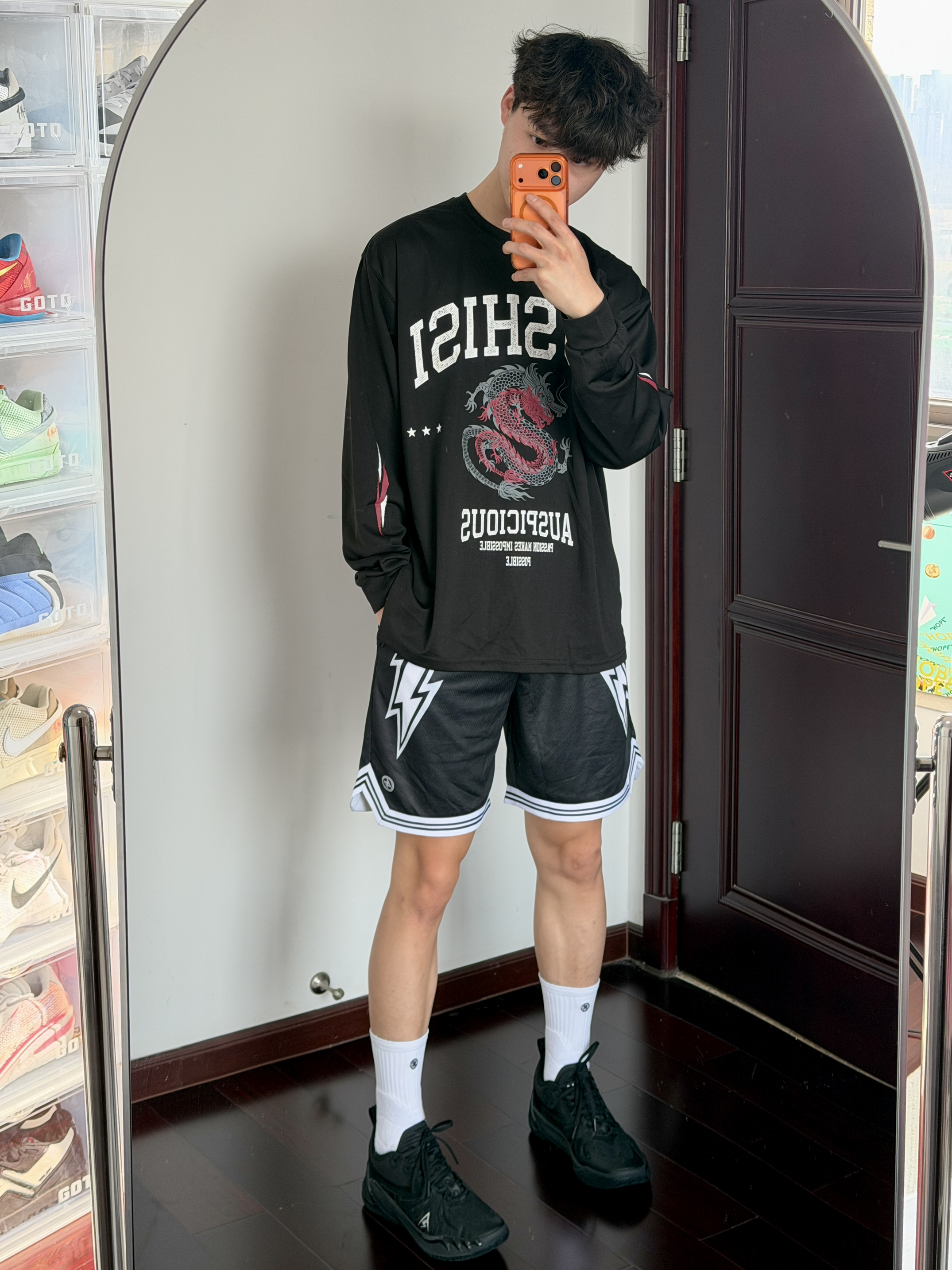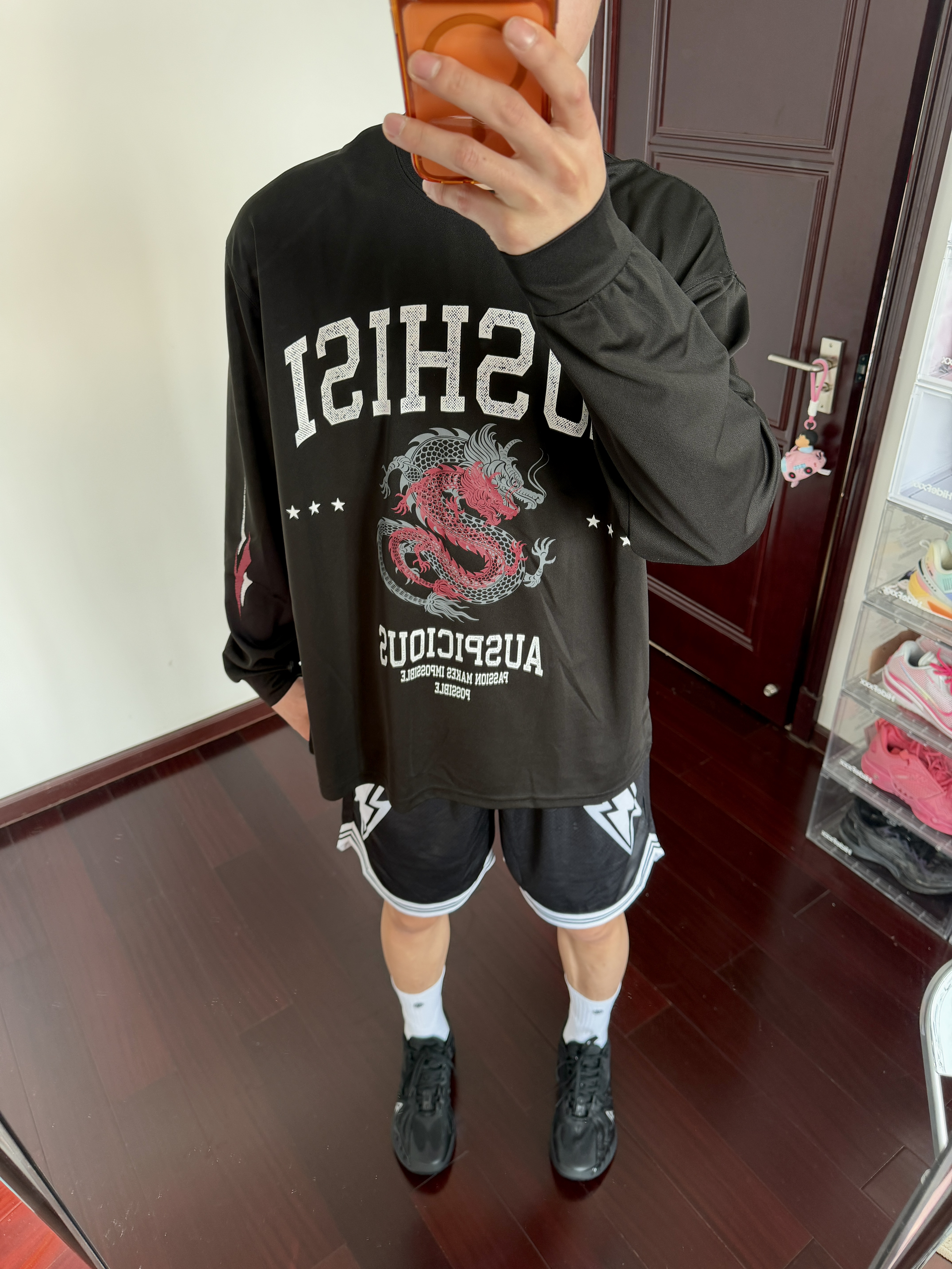 不会还有人不知道吧黑色穿搭的酷吧这套效果绝对不错的呀黑色美式字母印花投篮服很帅爽 短裤随便搭一条黑色短裤百搭的勒 上脚AR3黑马配色篮球男孩直接爱啦好看好看还耐脏性能很出色后卫穿它还不错呢脚感很韧 启动很迅速