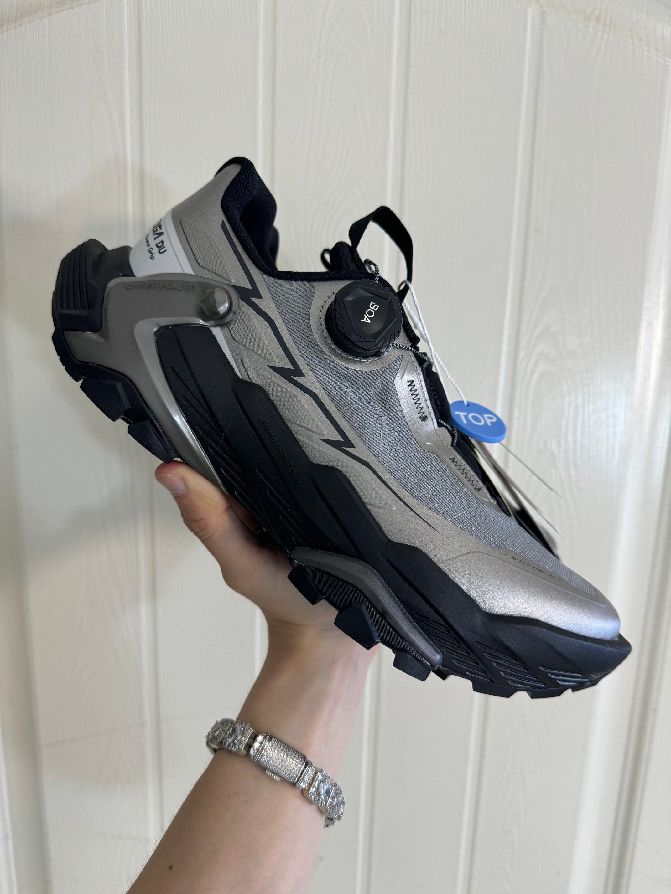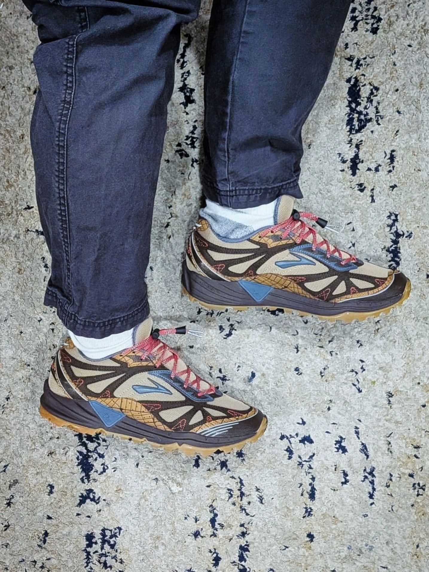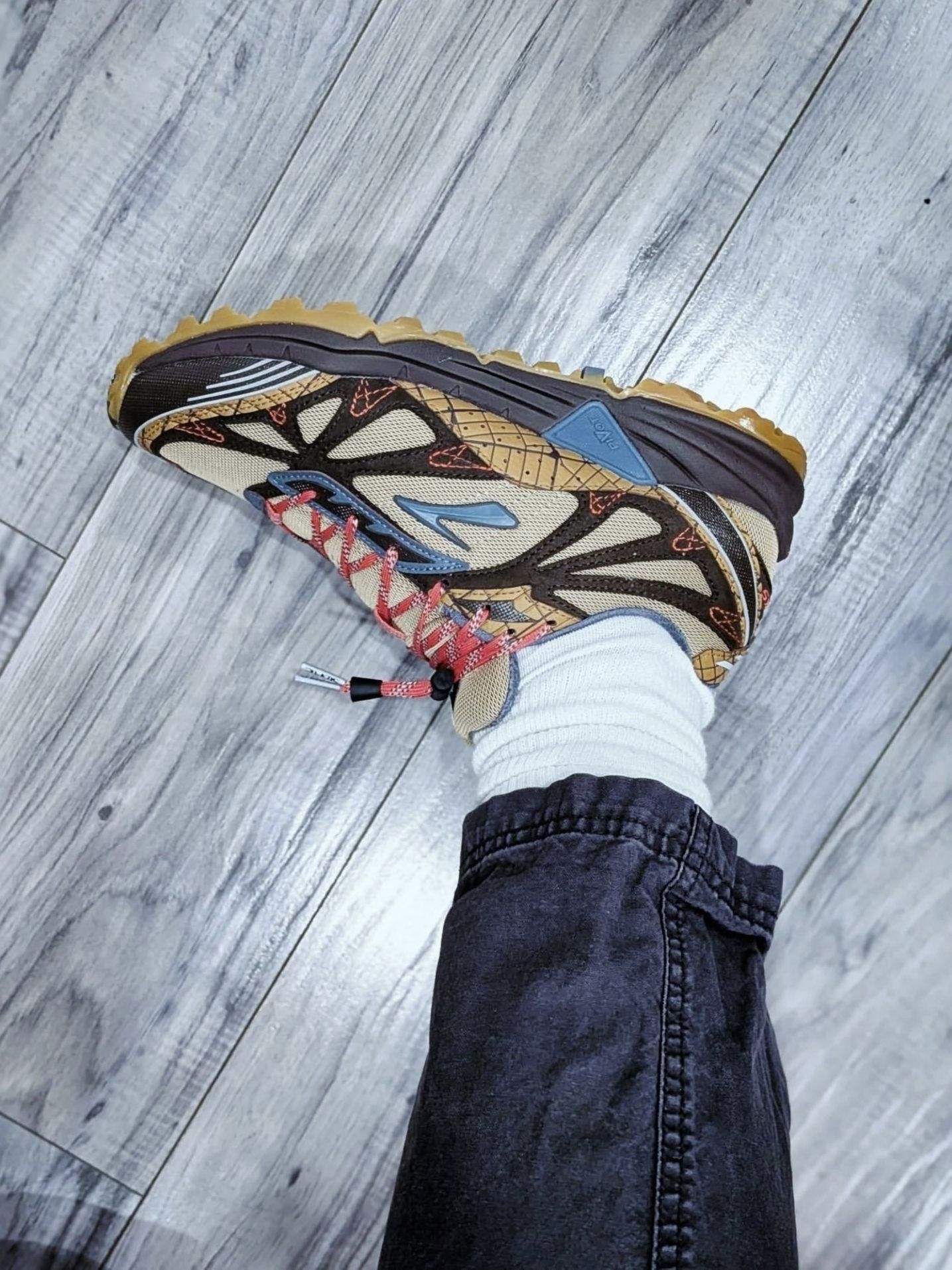 我直呼惊艳,当它踩在做旧地毯上时,卡其棕基底上的深棕蛛网纹、湖水蓝Logo与亮红鞋带撞色凌厉,把户外鞋的“野性色彩美学”拉满。 我越看越爱它的细节巧思,网布与合成革拼接鞋面兼顾透气与抗造,深齿外底承袭Cascadia的户外基因,无论是踩在郊野碎石路还是城市街头,都能稳稳贴合地面。卡其棕的大地色系适配度极高,搭配深灰水洗牛仔或军绿色工装裤,再用红色配饰呼应鞋带,轻松拿捏山系街头风,日常通勤与轻徒...
