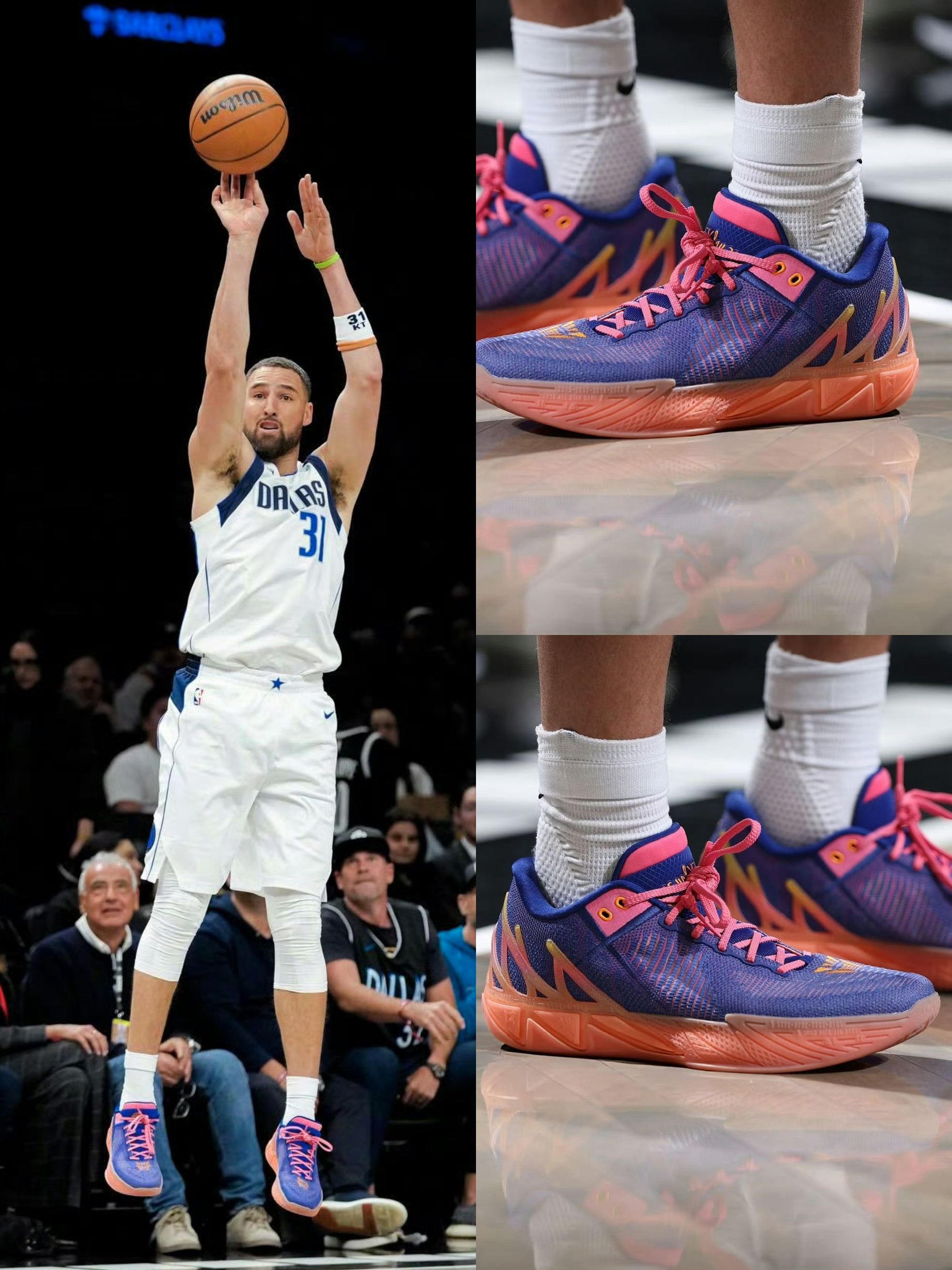 Kt11这款球鞋的设计灵感源自克莱·汤普森的家乡洛杉矶的日落大道,鞋身主色调为深紫色,搭配粉色与橙黄色的渐变色彩,整体呈现出洛杉矶日落时分的美丽景象。同时后跟TPU同样采用三色渐变设计,与鞋面颜色相呼应。鞋舌处设计独特,左脚印有克莱·汤普森的英文签名,右脚则印有“SUNSET”与洛杉矶日落相关的图案标识