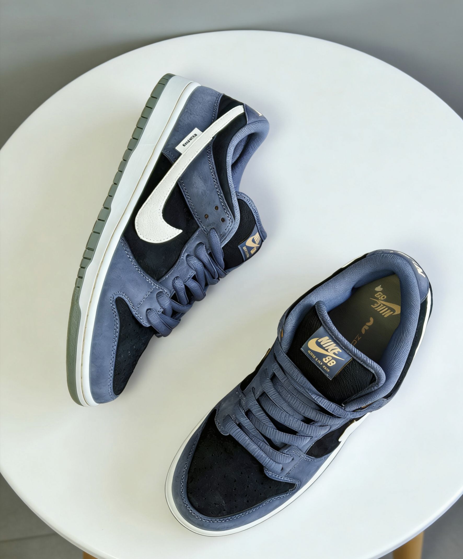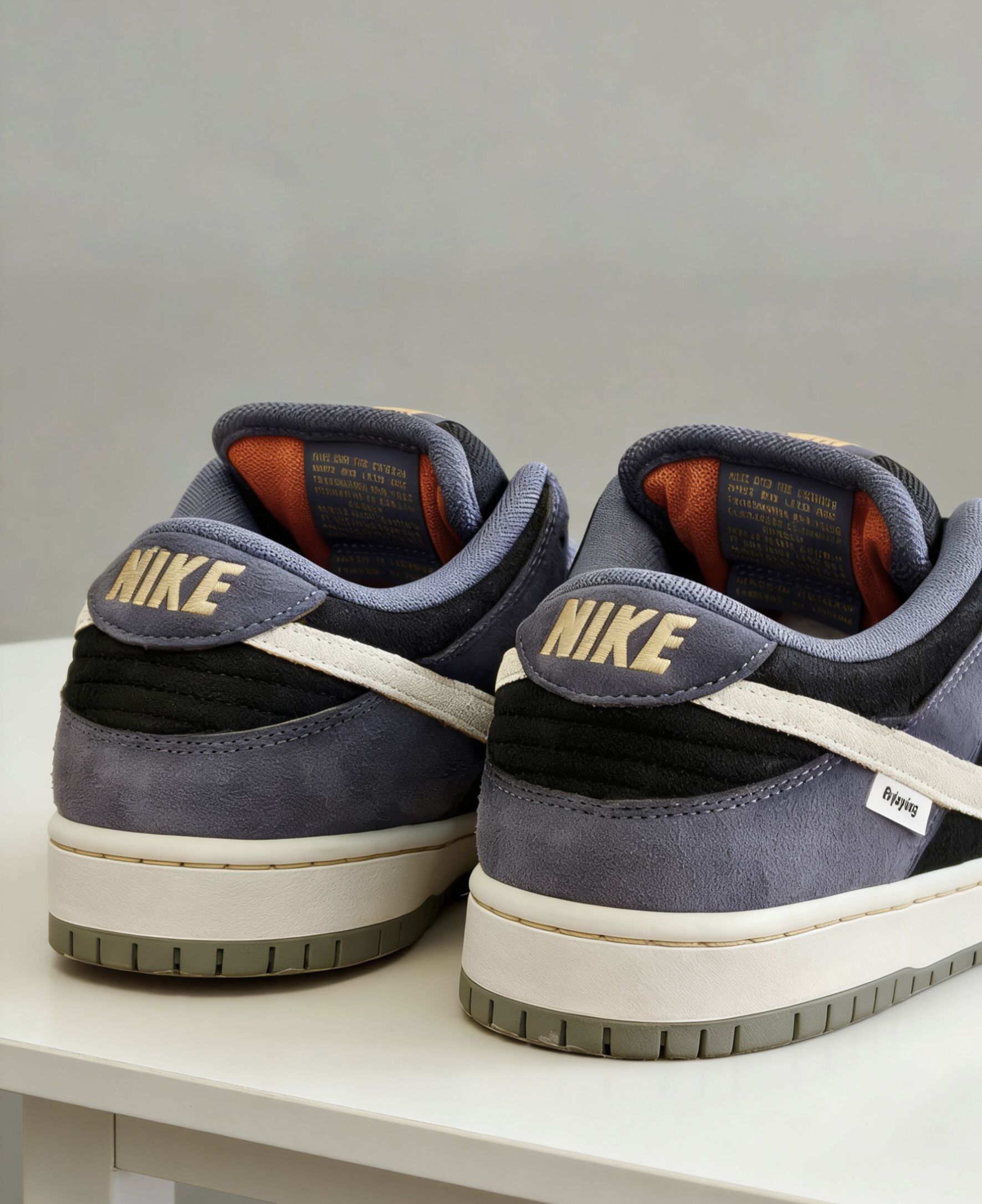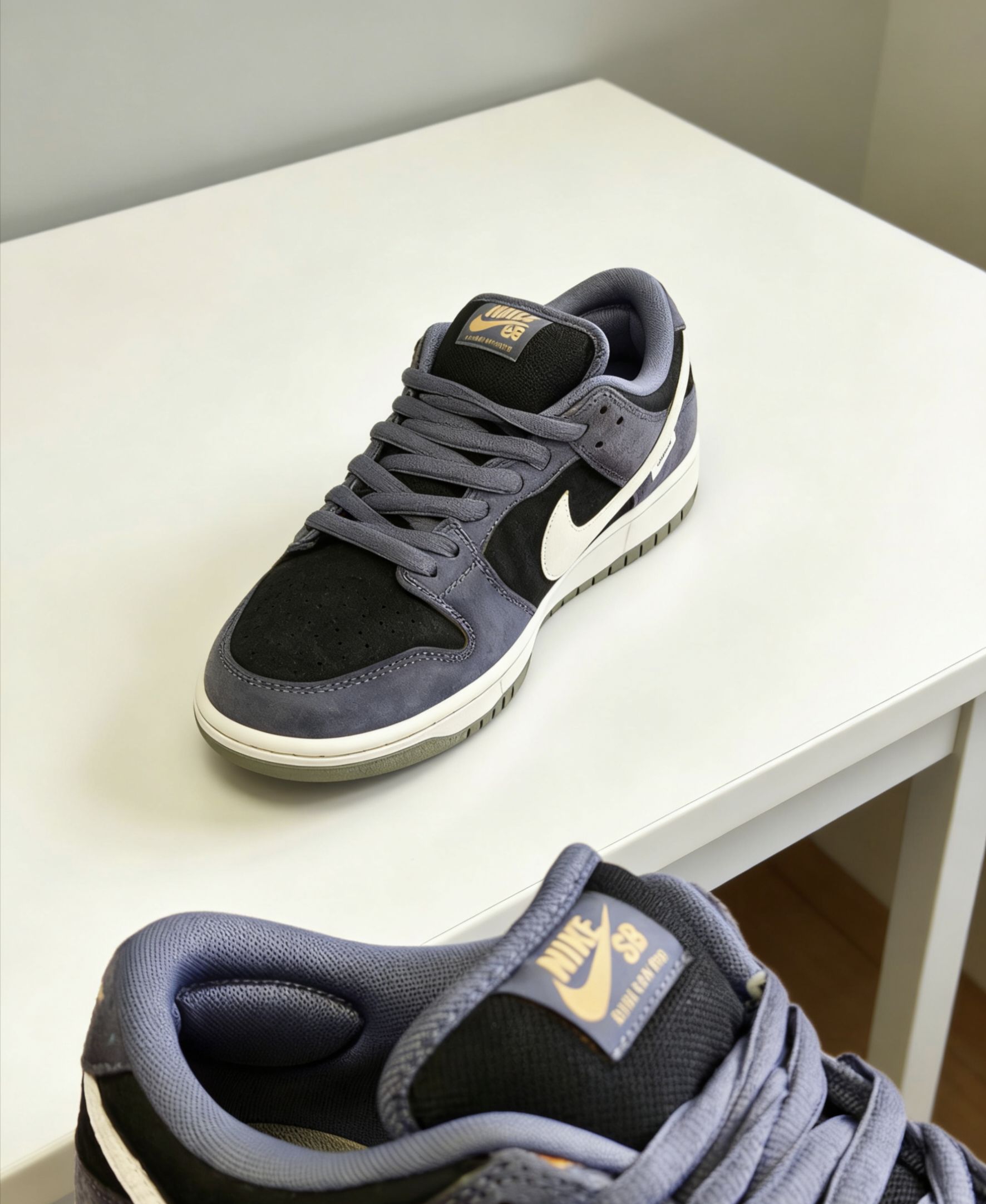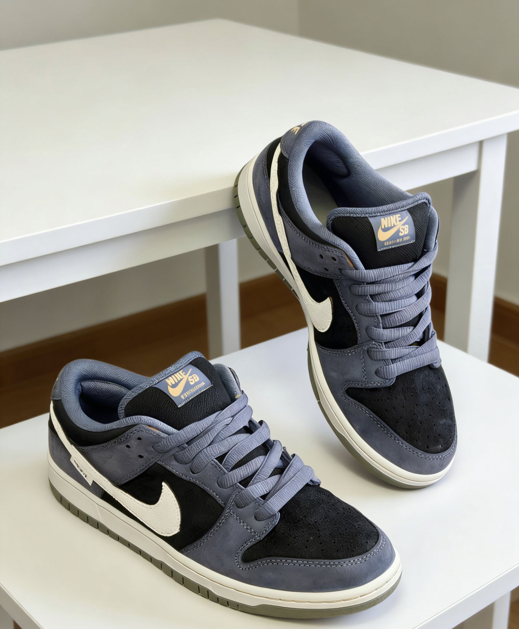 🌊 复古蓝黑麂皮|Nike SB Dunk Low 「Enjoying」 这双Nike SB Dunk Low真的把复古街头感拉满了! - 配色质感:深浅蓝黑麂皮拼接,自带做旧质感,白勾和鞋舌的金色Logo是点睛之笔,低调又有辨识度。 - 细节拉满:鞋侧的“Enjoying”小标签、后跟刺绣NIKE、内衬的橙色点缀,每一处都藏着设计小心思。 - 穿搭适配:不管是工装裤、牛仔裤还是运...