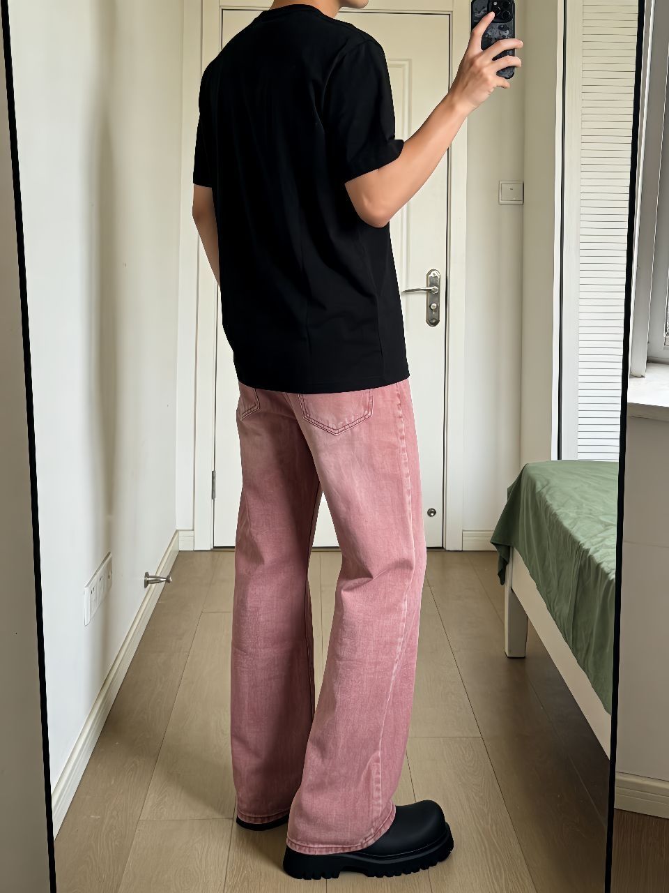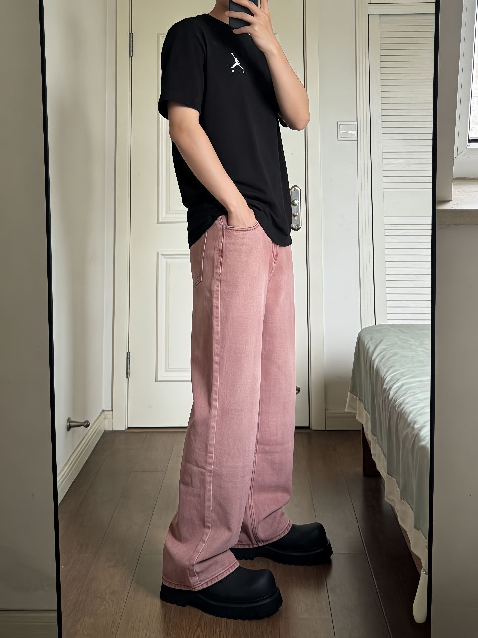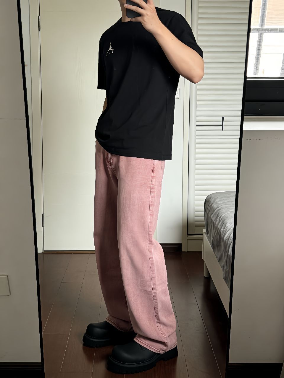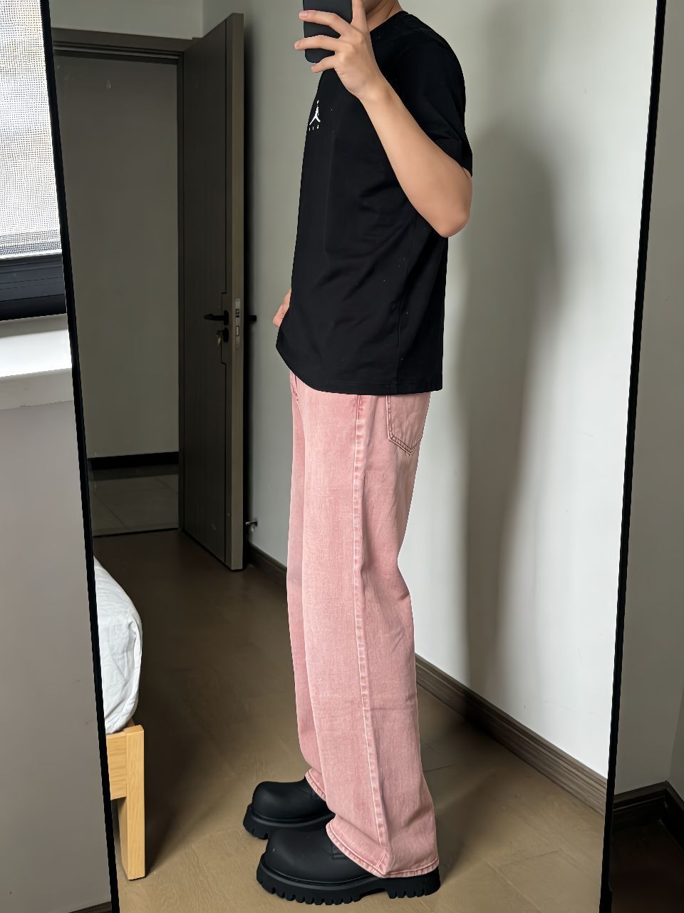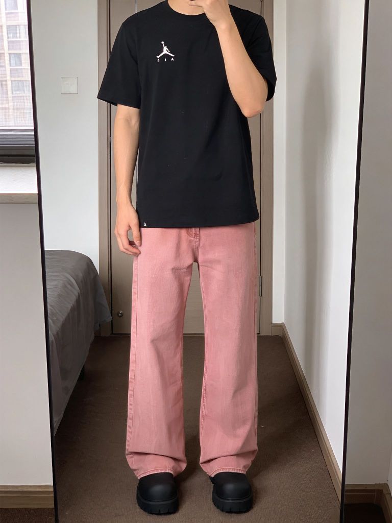 最近早晚温差大,翻出了这件黑色短袖打底,外面套个衬衫或卫衣都行,纯色Logo简单耐看。重点夸夸这条牛仔裤,做旧水洗很自然,宽松阔腿版型藏肉一绝,中腰穿着舒服不卡裆。脚下踩这双德比鞋绝了,大头设计憨憨的很可爱,关键是真的轻便不累脚,暴走两万步无压力。黑鞋配黑T呼应上了,裤子堆在鞋面正好盖住一半,慵懒劲儿拿捏得死死的。早春懒得想搭配,这么穿准没错,记得袜子选亮色提亮点缀~