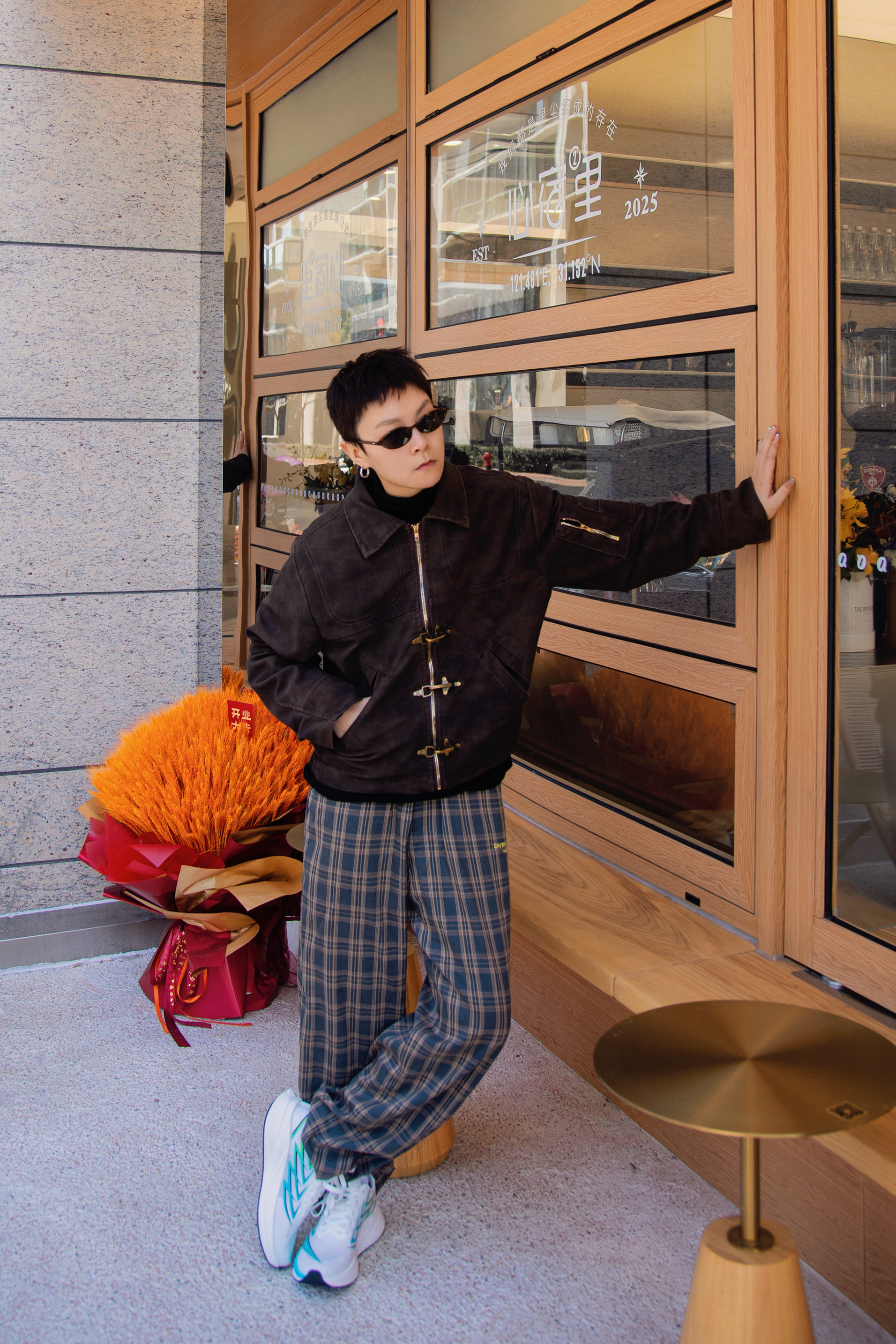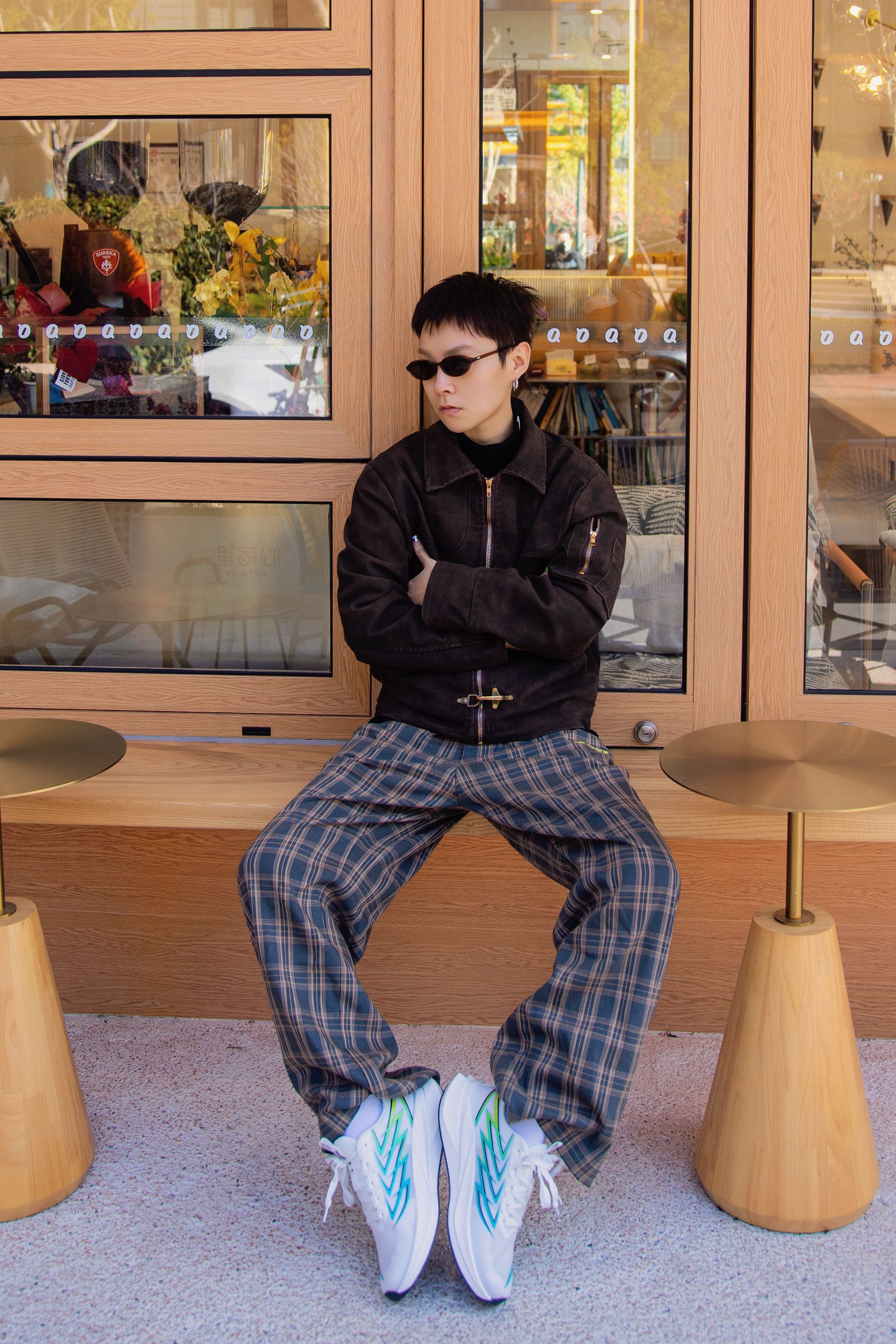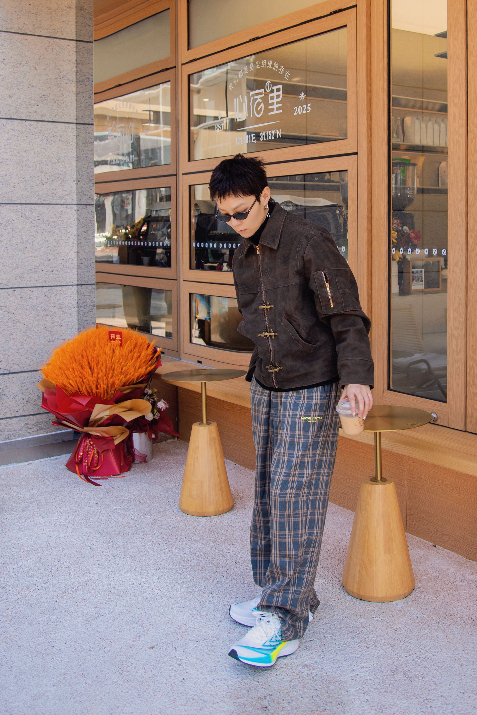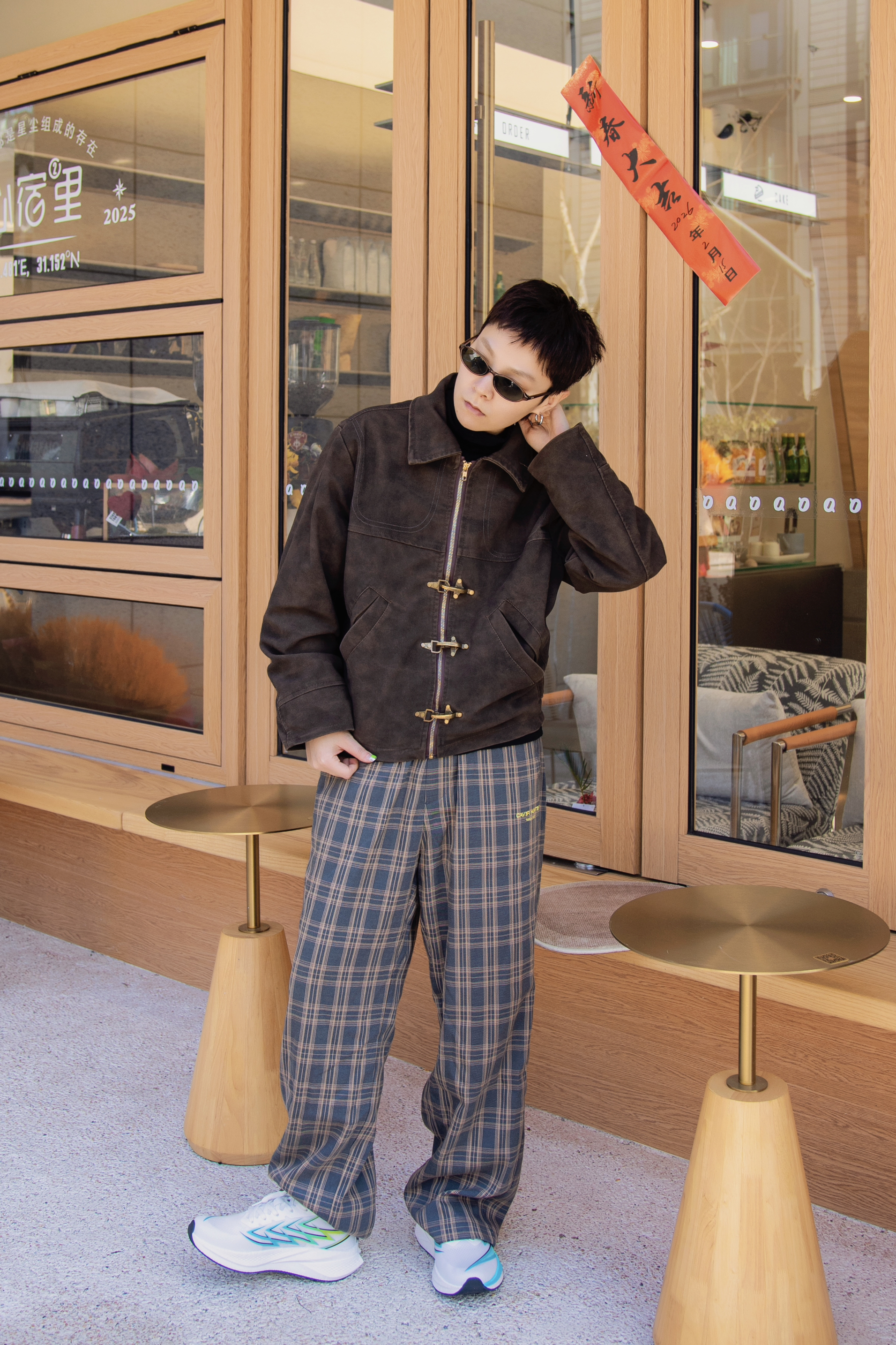 春日就要去郊游 分享一套春日复古大地色穿搭 穿搭指南: 上身一件黑色半高领打底 外搭棕色夹克外套 麂皮面料显高级质感 配一条棕色格纹休闲裤 上脚哆啦A梦跑步鞋 白色鞋身配合黄蓝线条很有活力 有弹力的鞋底很适合逛街 穿上这套复古暖色调去春游吧