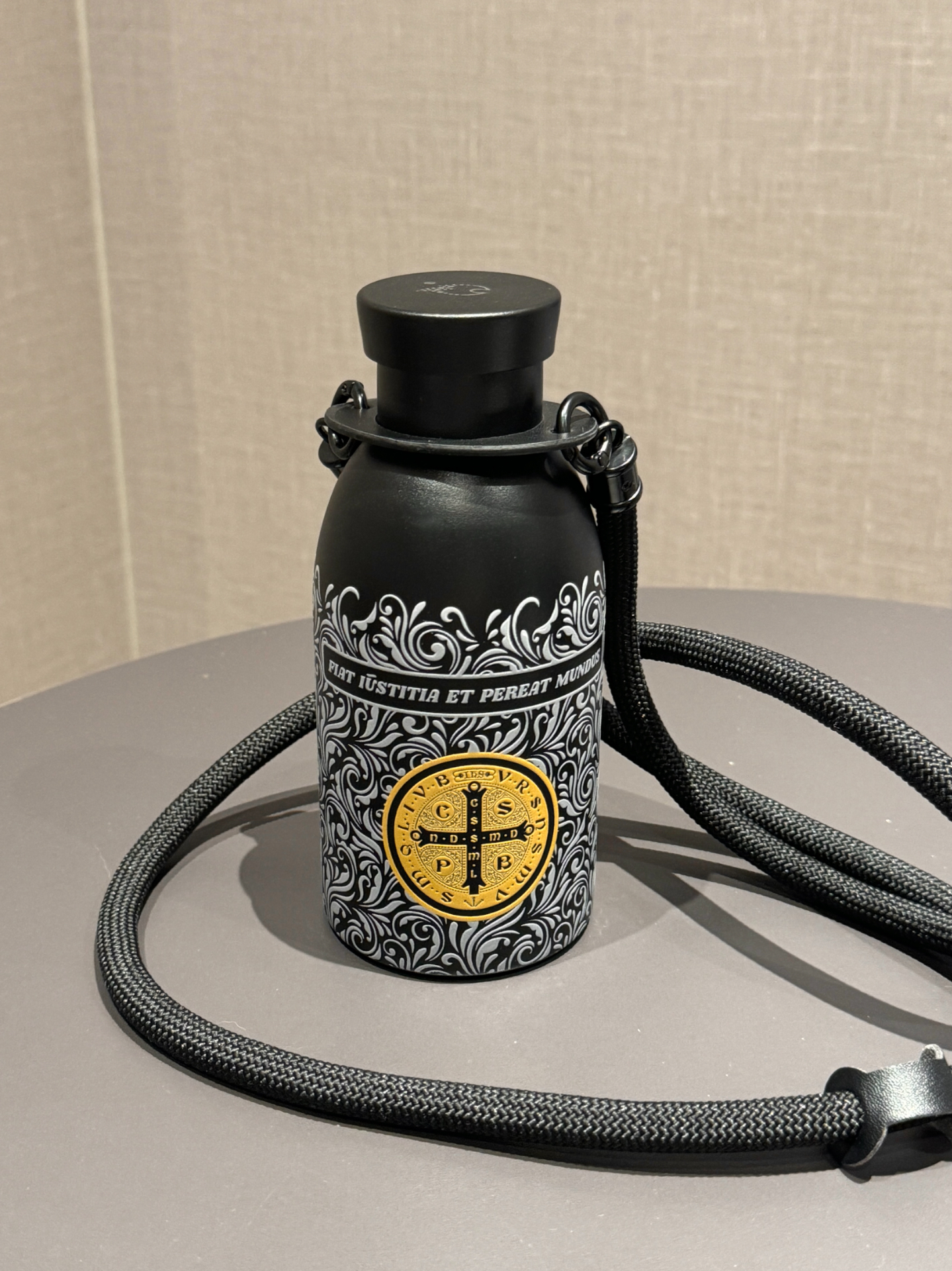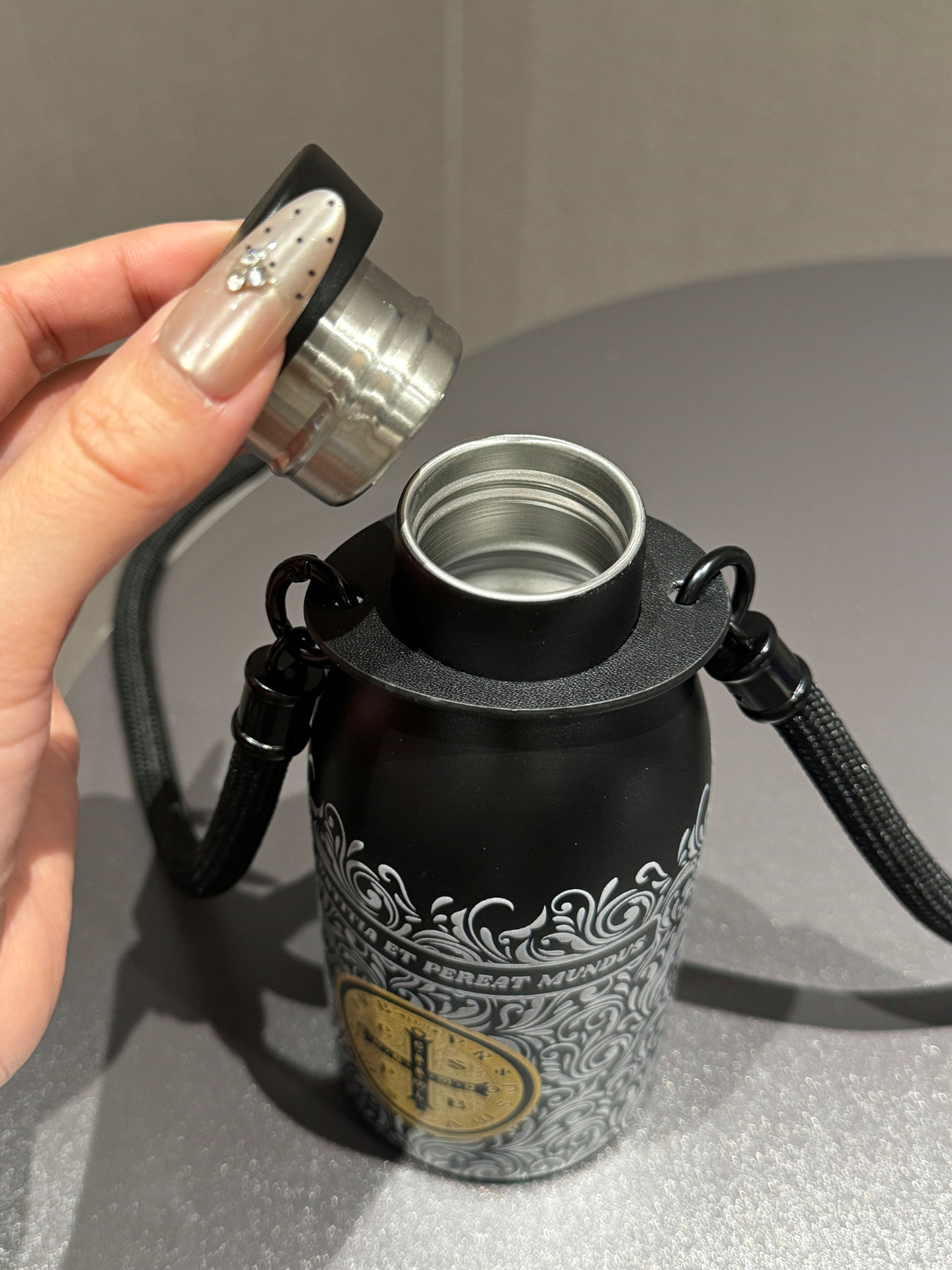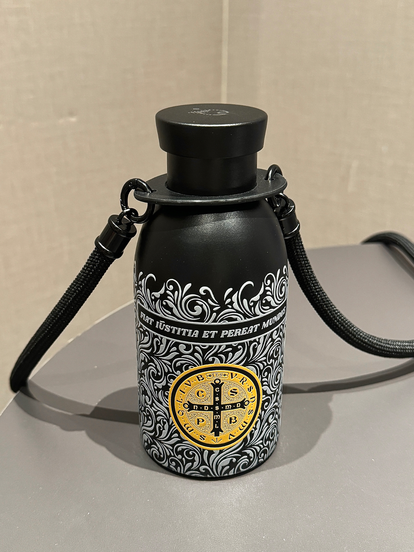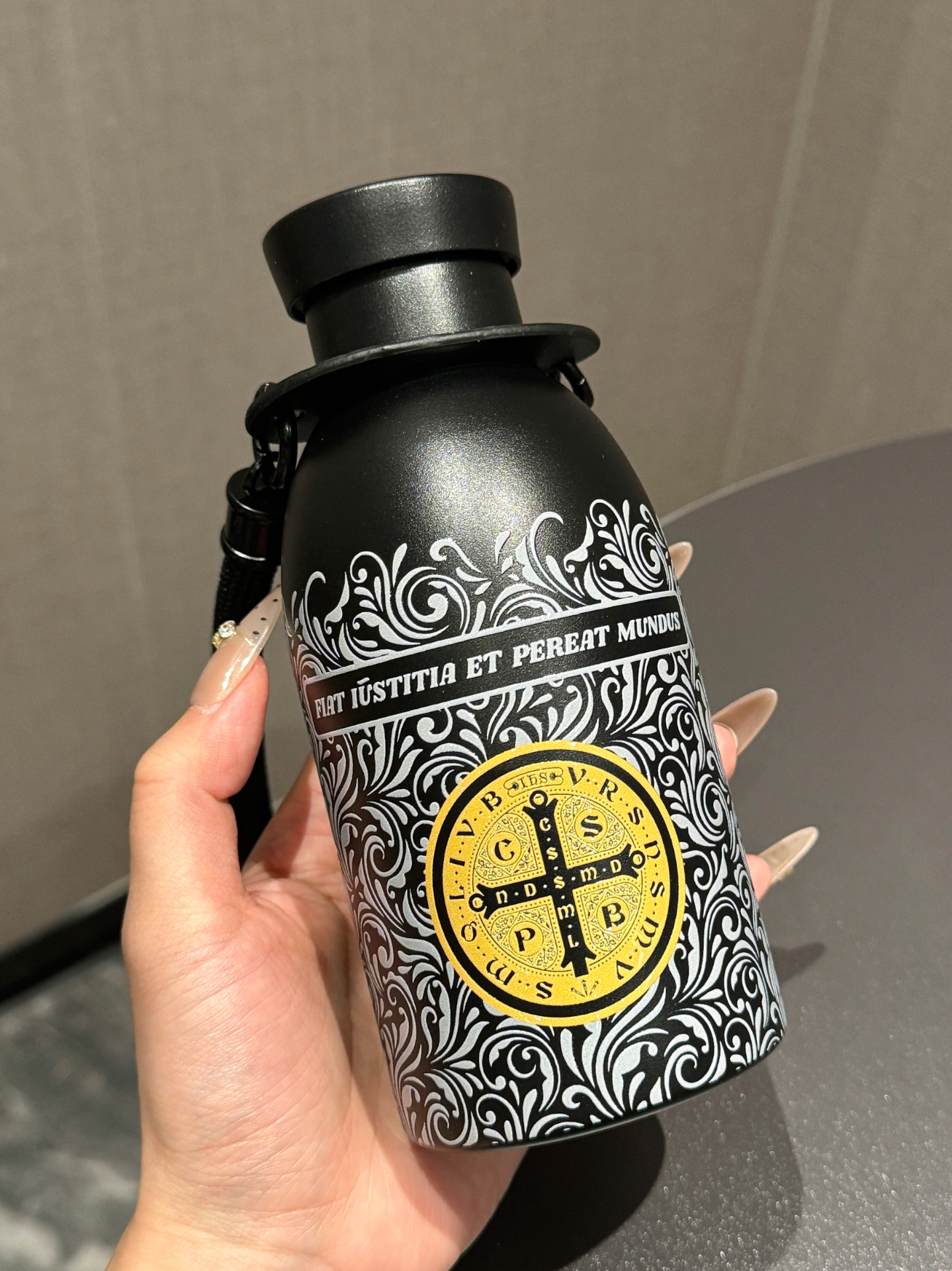 介个康斯坦丁保温杯太酷啦 3D打印的花纹质感拉满 杯身黑金配色尊嘟好高级 试了下保温效果也不错 放一天水都还是热热的 配了背带还可以斜挎 出去玩或者运动背着可方便了