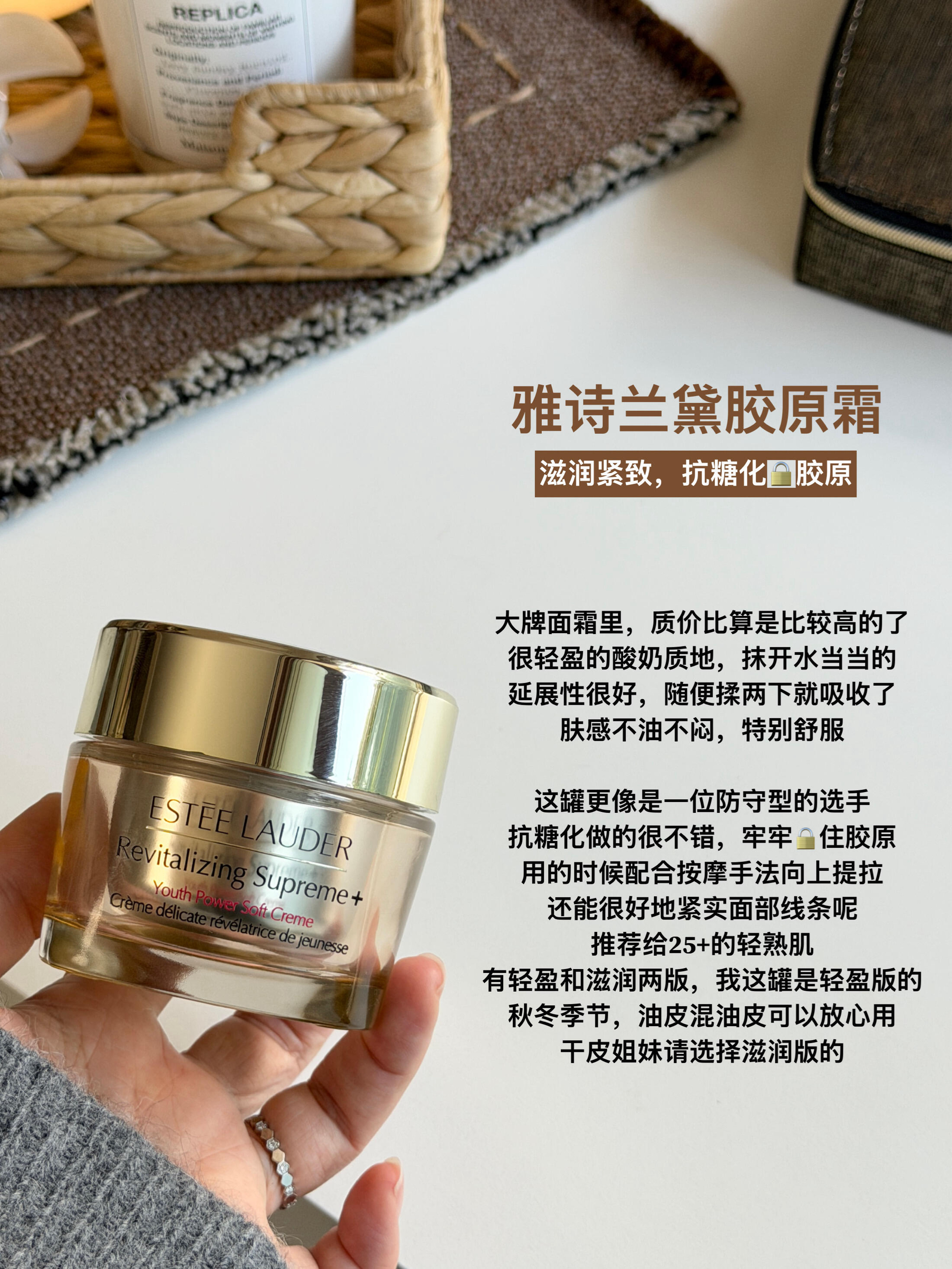 奔三的年纪,守住胶原蛋白真的就是头等大事 胶原蛋白就像是皮肤的“水库”💦 随着随着年纪增长,胶原跟着流失 皮肤逐渐走下坡路,老化就像是开了二倍速一样 松弛垮脸暗沉细纹全都来敲门 粉底涂得再厚都盖不住疲态感 我自己抗老多年,也用过一箩筐胶原面霜 大浪淘沙留下了这三瓶,各有的绝活 值得姐妹们放心把脸给给它们! - 优时颜微笑面霜-不仅给皮肤喂胶原,更深层补充母胶原,紧嫩饱满💦光感 雅诗兰黛胶原霜-滋润...