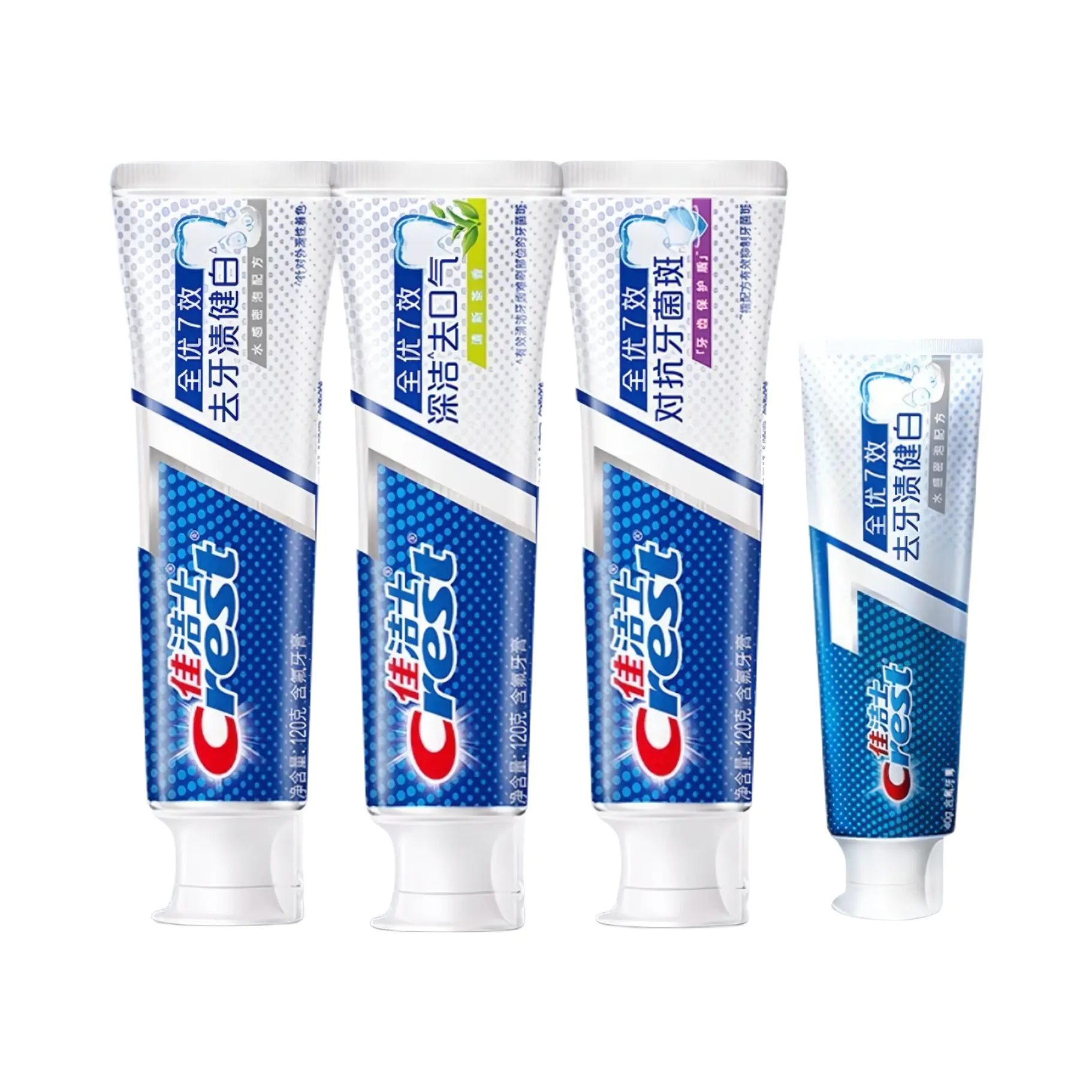 本篇笔记关联了Crest/佳洁士 全优7效牙膏 含氟清新口气强健牙釉质深洁抗敏感 去牙渍健白、Crest/佳洁士 全优7效对抗牙菌斑去牙渍健白牙膏组合装 牙斑菌180g+去牙渍120g、Crest/佳洁士 全优7效牙膏组合套装 含氟 强健牙釉质抗牙菌斑去黄清火 牙菌斑120g+去口气120g+去牙渍120g+去牙渍40g等商品,为用户提供真实的使用体验和购买参考。