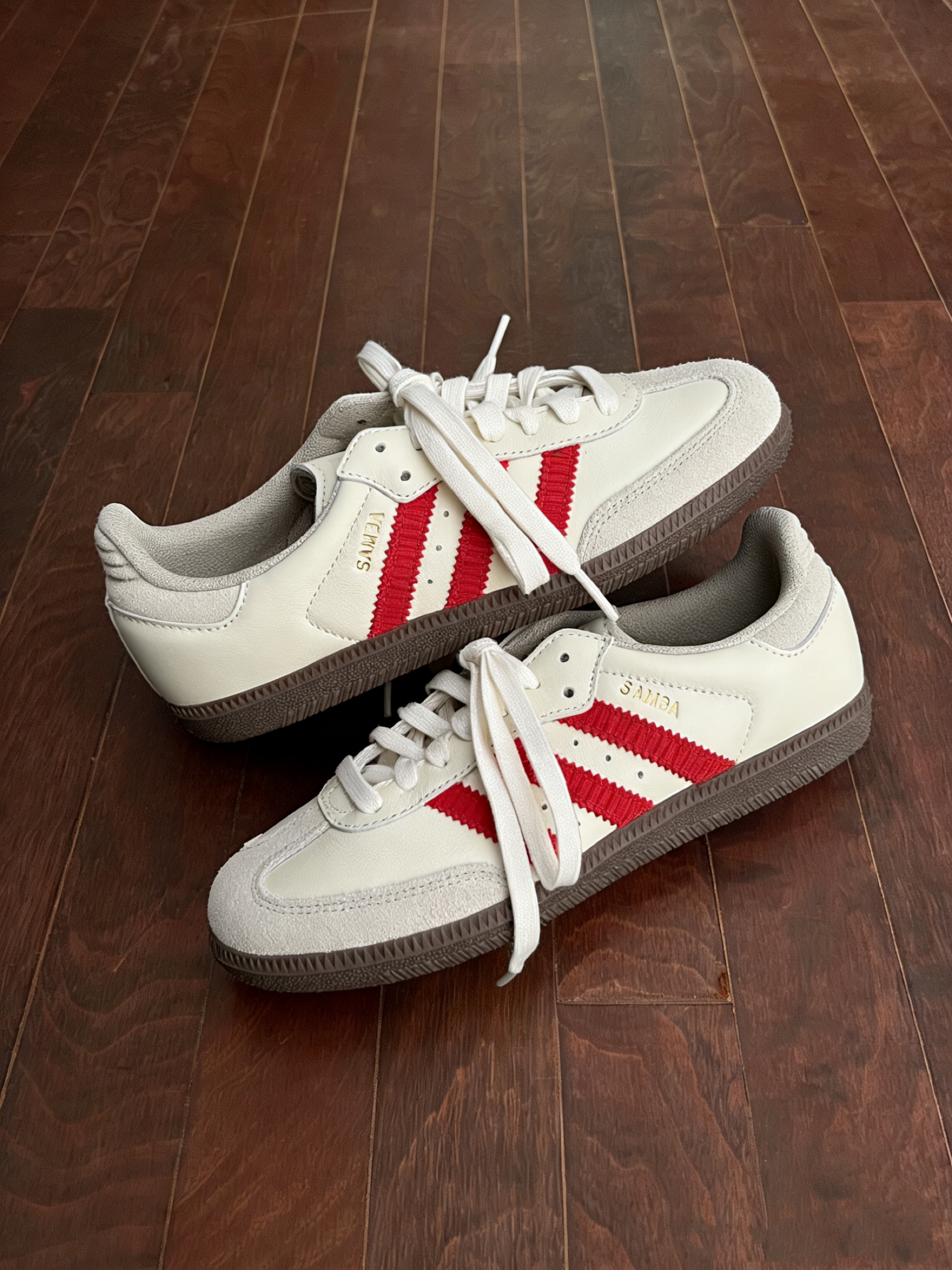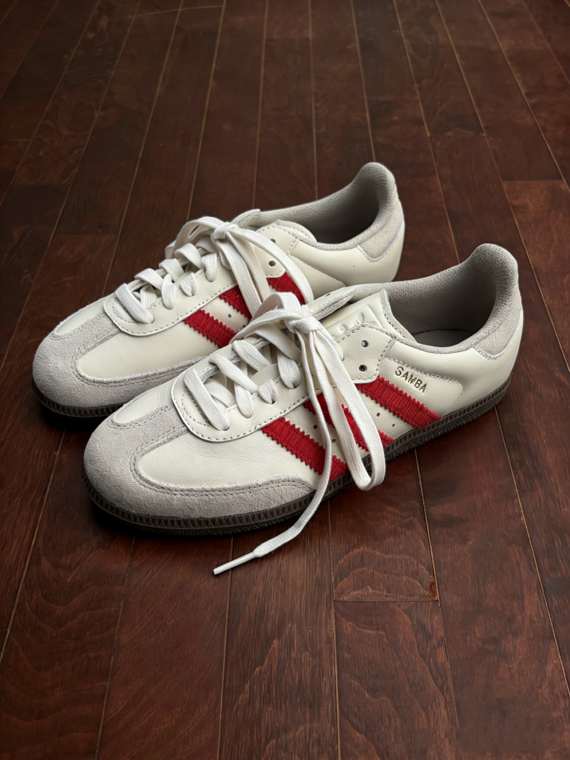 奶乎乎的米白鞋身完全不挑皮,黄黑皮上脚也毫无压力,正红色的灯芯绒三道杠撞色恰到好处,不浮夸却自带超强记忆点,完全不会和烂大街的黑白款撞款。鞋头细腻的翻毛皮拼接+鞋身软乎乎的真皮材质,上手摸就知道质感有多绝,鞋侧的金色Samba烫金标细节感拉满,再配上经典的生胶大底,复古氛围感直接焊死,不管是拍鞋身细节图还是上脚全身照,都巨出片,原相机直出都不用调滤镜。