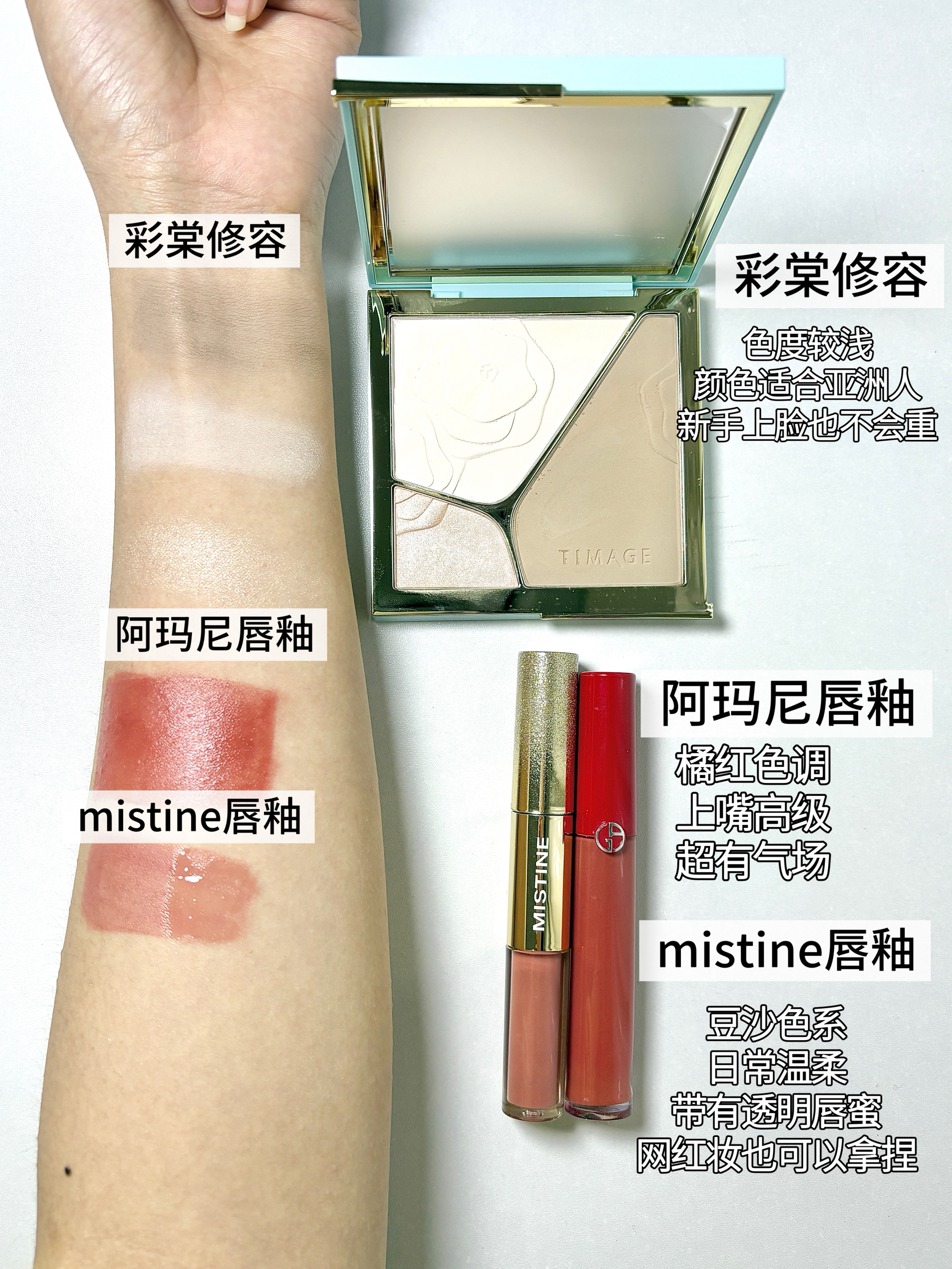 今天我们从底妆到口红 来给大家分享一些适合新手宝宝的彩妆 大家可以来康康哦~ 每个颜色还有质地都给大家展示了 苹果原相机拍摄 可以参考一下哦 特别素这个嘉利玛气垫 红红的包装蛮适合新年哦 而且粉质细腻 控油也不错 我用了精华油来对比 上完立马柔焦 而且还有有钱花的标志 新的一年祝大家越来越有钱哦~