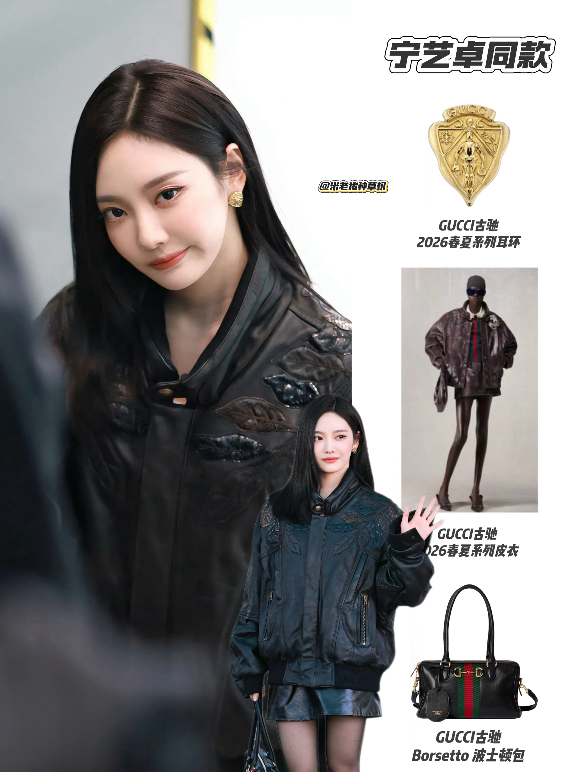 这个中国女人太美了🤤宁艺卓这套Gucci 2026春夏皮衣造型又酷又飒,oversize皮夹克自带复古气场,肩部的叶子压纹细节很有质感。 同材质皮裙与黑丝长靴的组合,在硬朗中透出性感,再配上标志性的波士顿包,整体又A又有辨识度,把复古与街头感平衡得恰到好处。