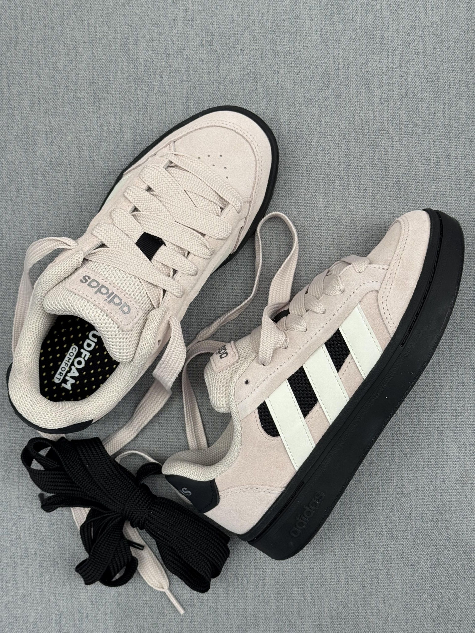 麂皮鞋面细腻又软,紫粉色温柔到发光,黑白细节干净利落,厚底板鞋轮廓超有型。Cloudfoam鞋垫软弹包裹,脚掌像踩云朵一样,走一整天都不累脚~👟✨ 穿上它,整个人都甜起来了!姐妹们,这双真的绝,赶紧冲~💕