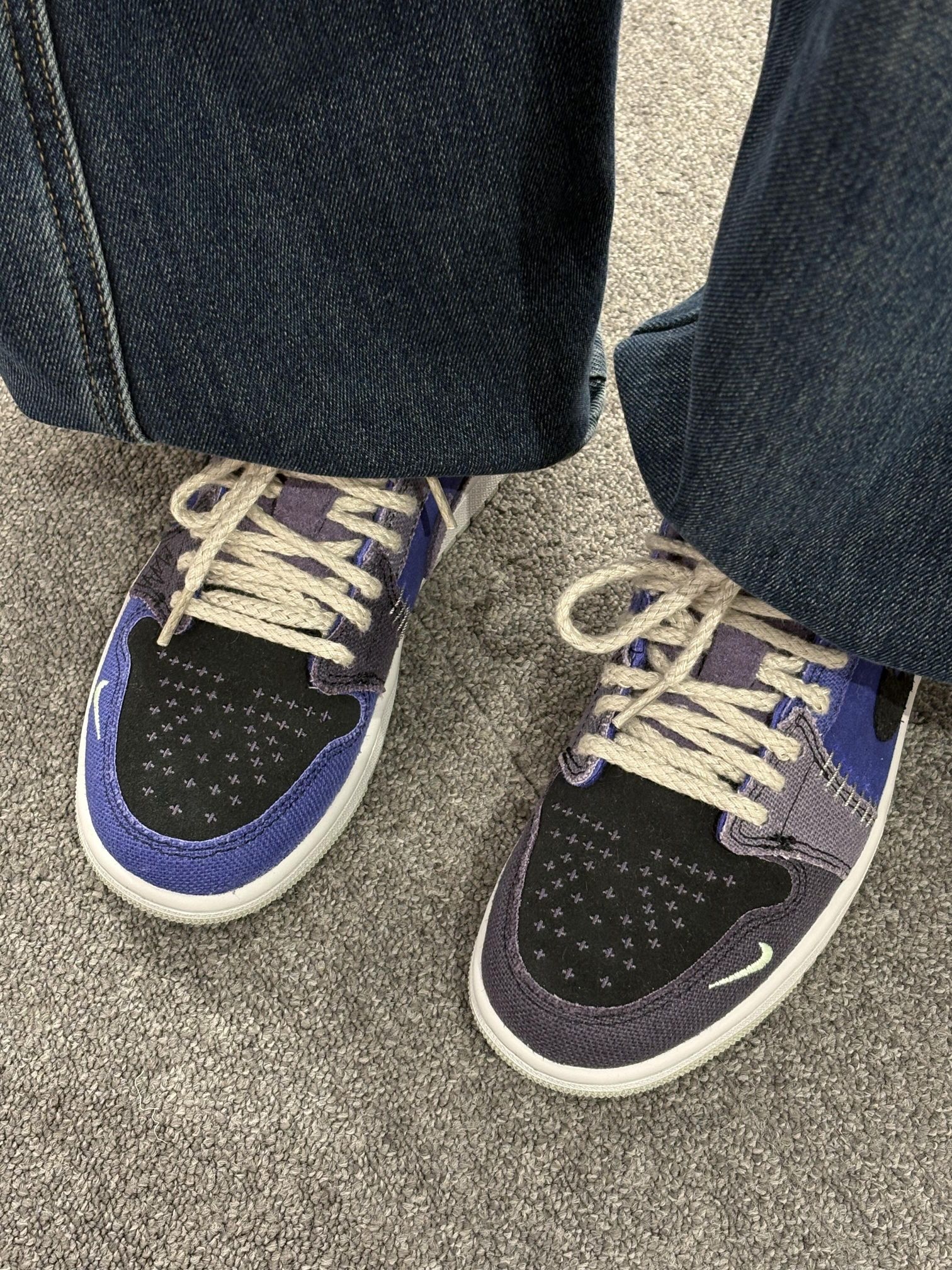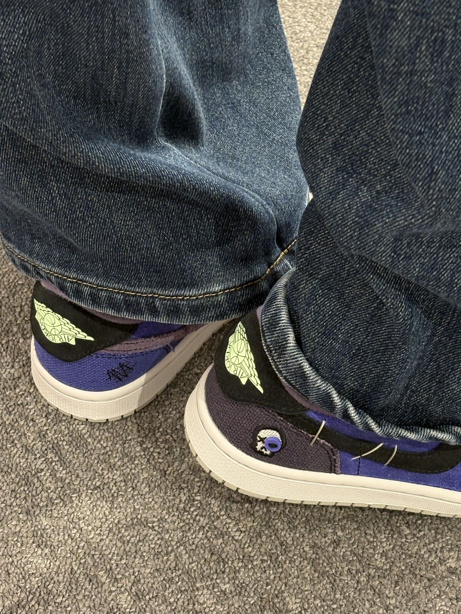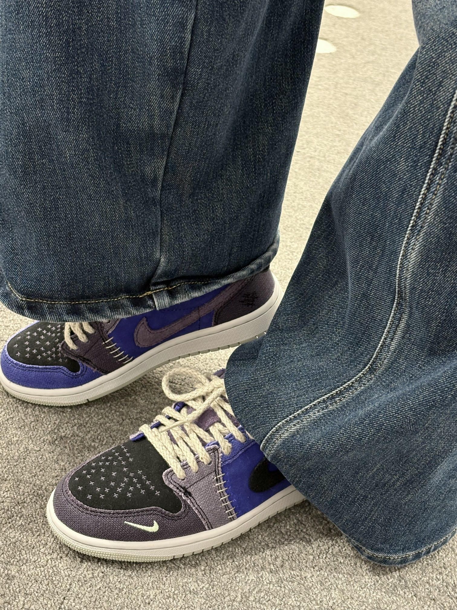 OOTD今日穿搭公式✅ 阔腿牛仔裤 + AJ1 Low 巫毒娃娃 = 本命配色! 这双鞋的质感真的绝了💜 做旧的帆布材质搭配紫黑撞色,复古感直接拉满。 粗鞋带的设计细节感满满,上脚不仅显腿长,还自带一种慵懒的酷飒感。🐾 不管是配直筒裤还是卷边裤都超好看, 春天的第一双潮鞋我先锁死了!✨