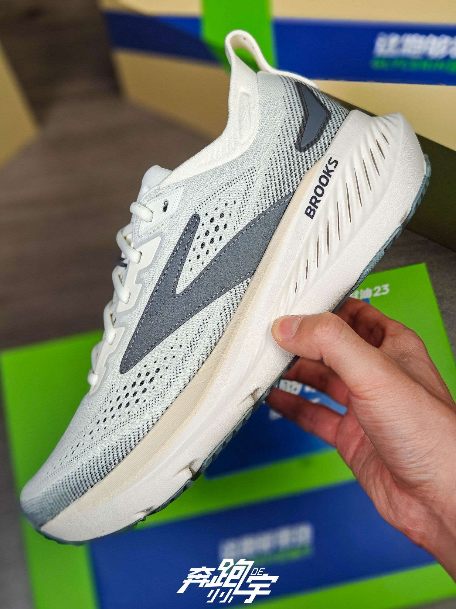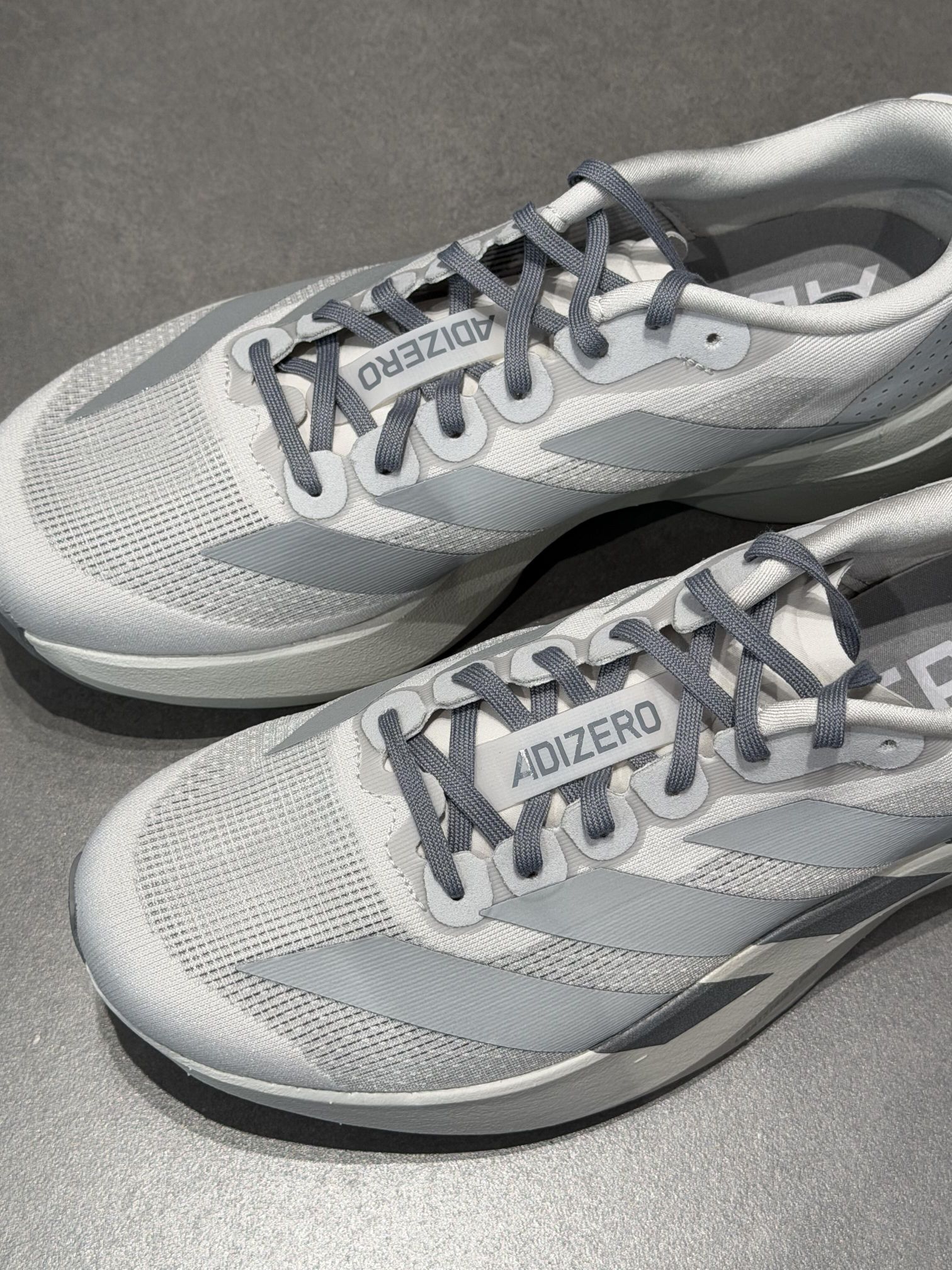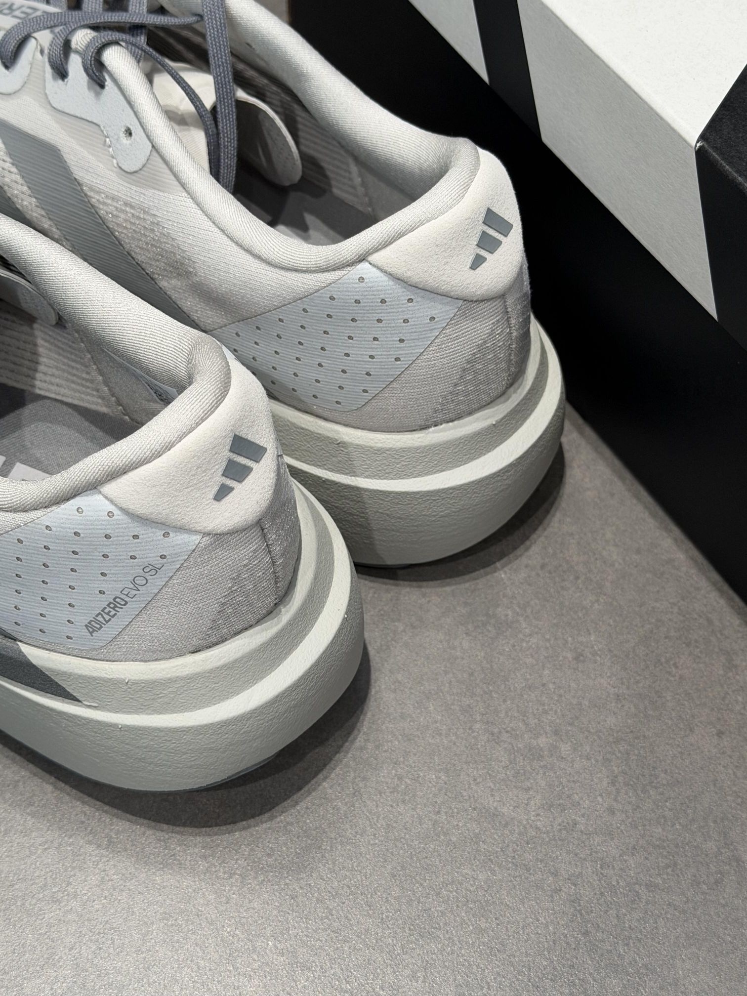 浅灰+银的配色真的太会了,网眼鞋面清清爽爽,三条纹在光下还会微微反光,走路带风的感觉谁懂啊! • 脚感:轻到像踩在云朵上,回弹很顶,日常通勤或者慢跑都无压力 • 颜值:灰银配色高级感拉满,搭运动裤、牛仔裤都能穿出松弛感 • 细节:鞋舌和鞋垫的“ADIZERO”字样,细节控狂喜