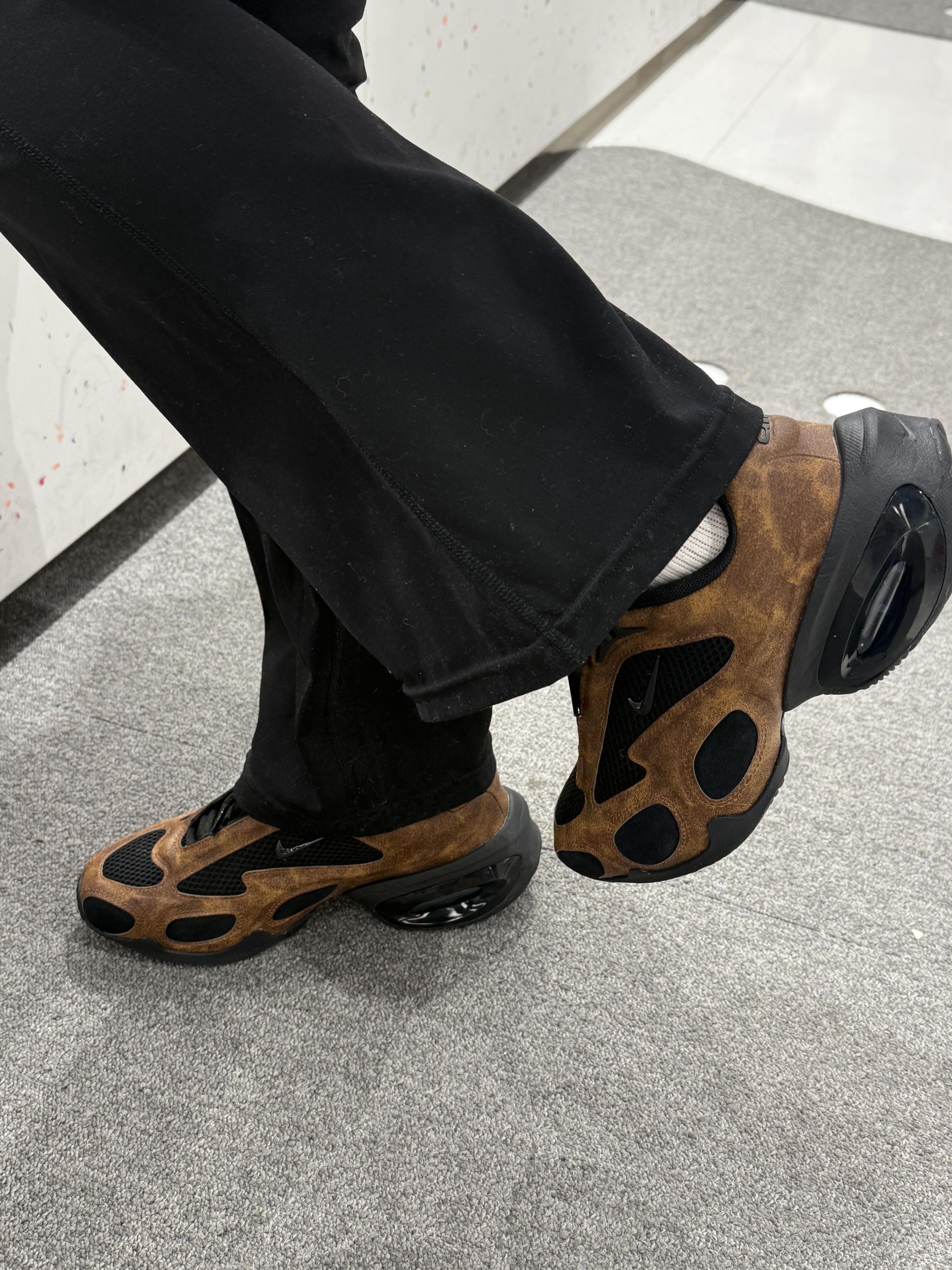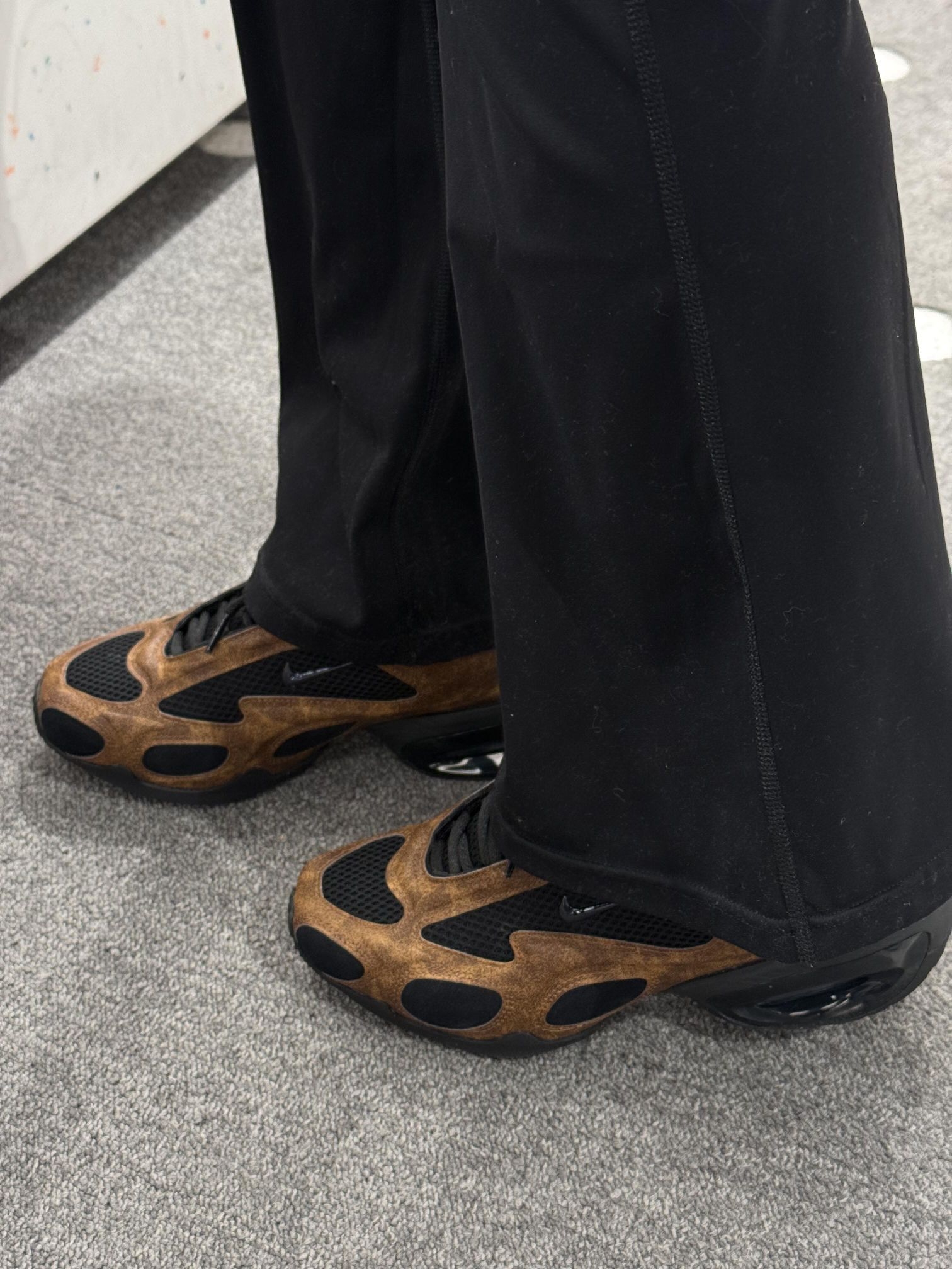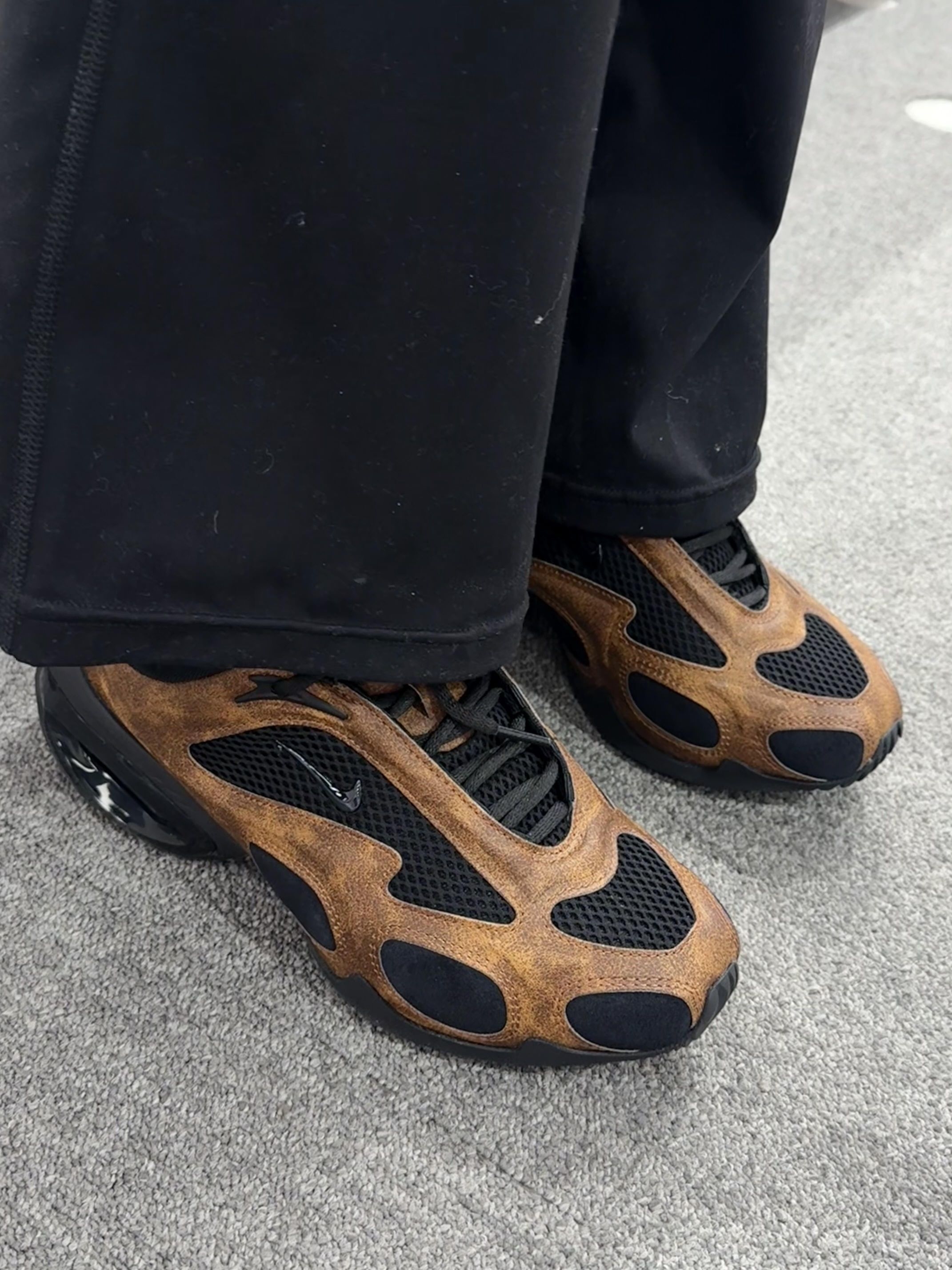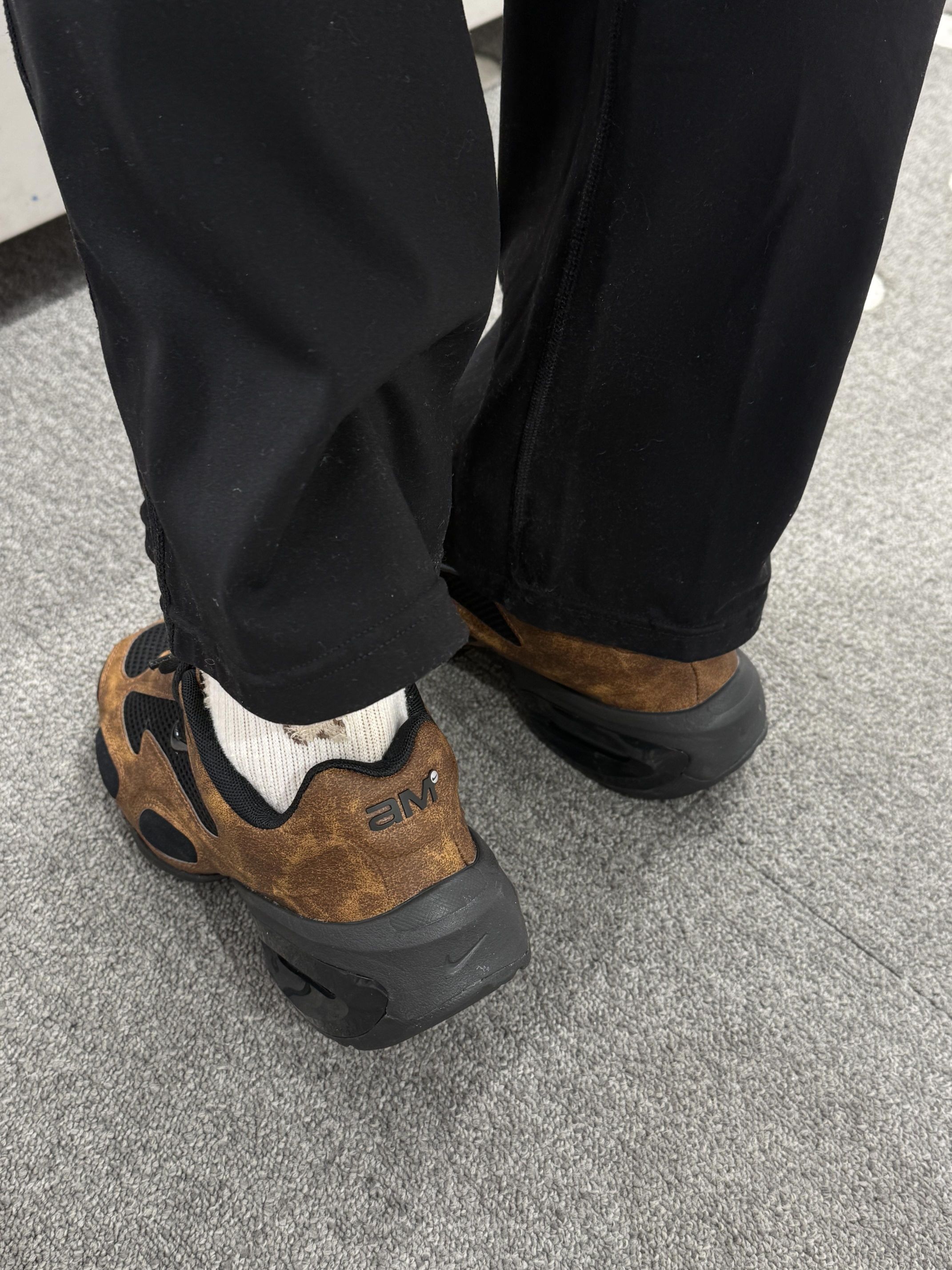 焦糖棕拼黑色的配色真的神,像一杯醇厚的摩卡咖啡,麂皮的纹理质感拉满,搭配黑色网面又不会显得笨重,反而多了点透气的清爽感~🤎 鞋型是偏老爹鞋的宽楦设计,脚肥星人也毫无压力,Air气垫踩上去软乎乎的,暴走一天都不累脚! 搭黑色阔腿裤真的绝配,裤脚稍微盖住一点鞋帮,复古慵懒的腔调直接拉满,随便拍都出片📸 感觉这双鞋能承包我整个秋冬的穿搭,复古党闭眼冲就完事!🌰
