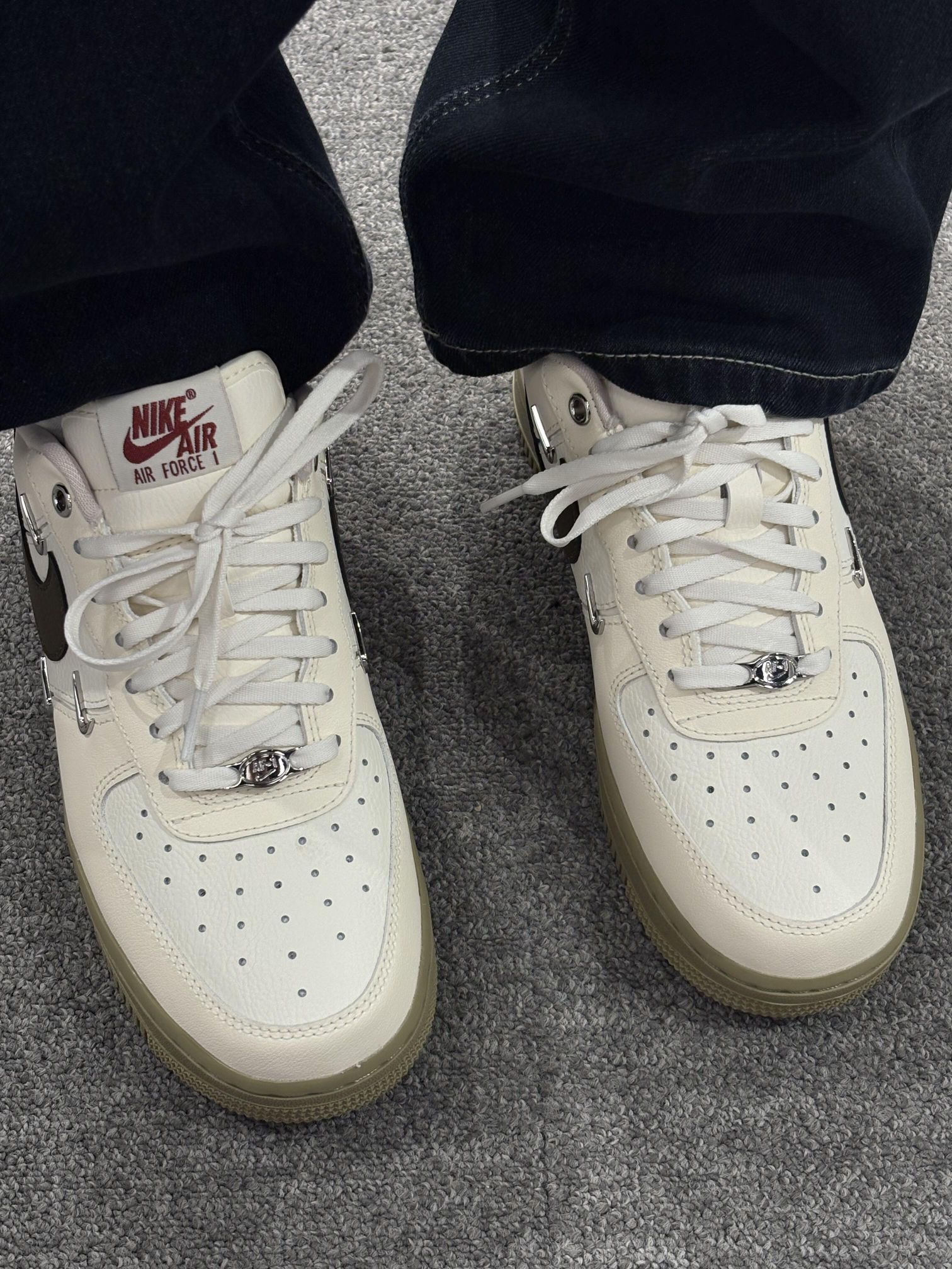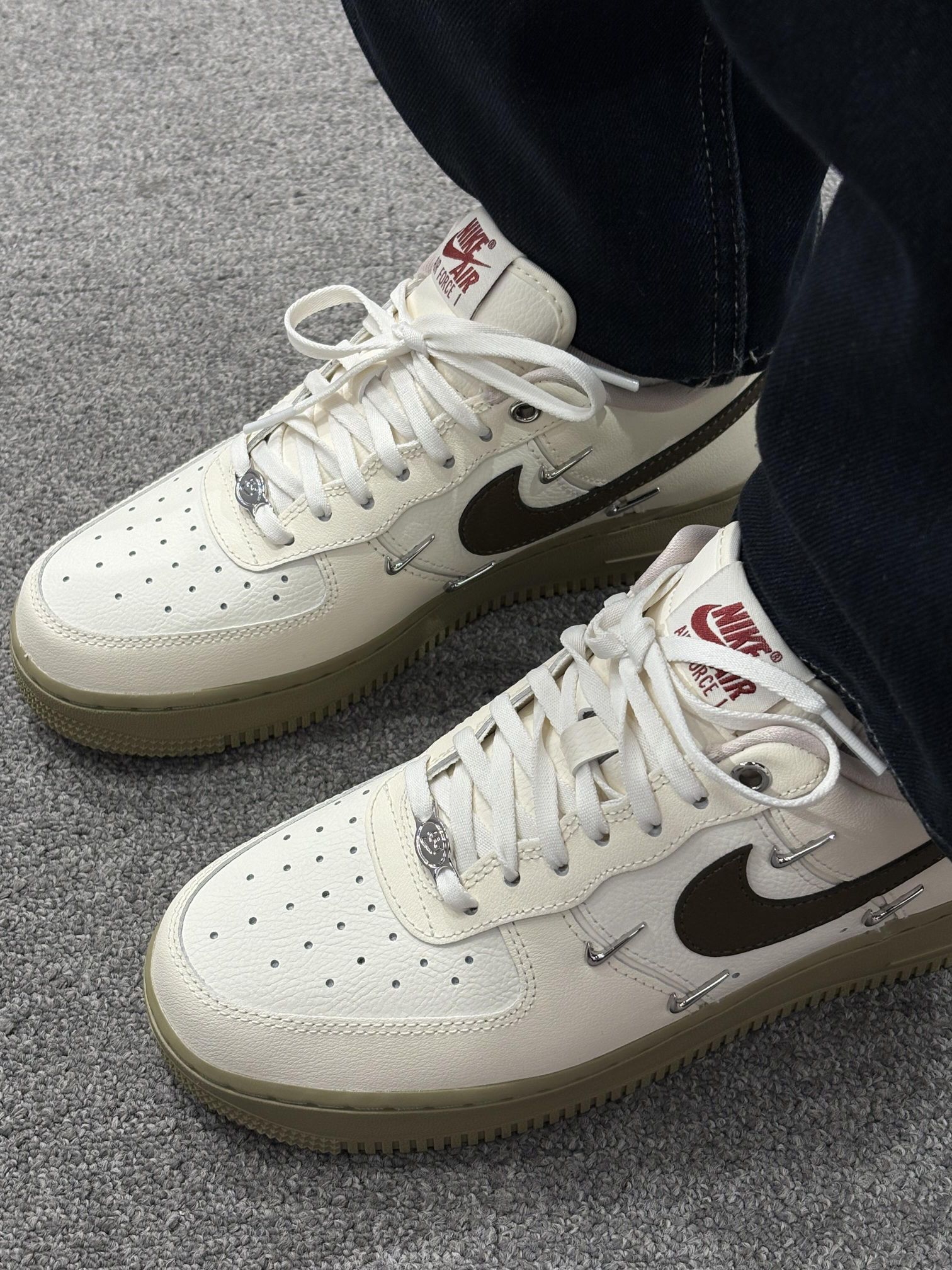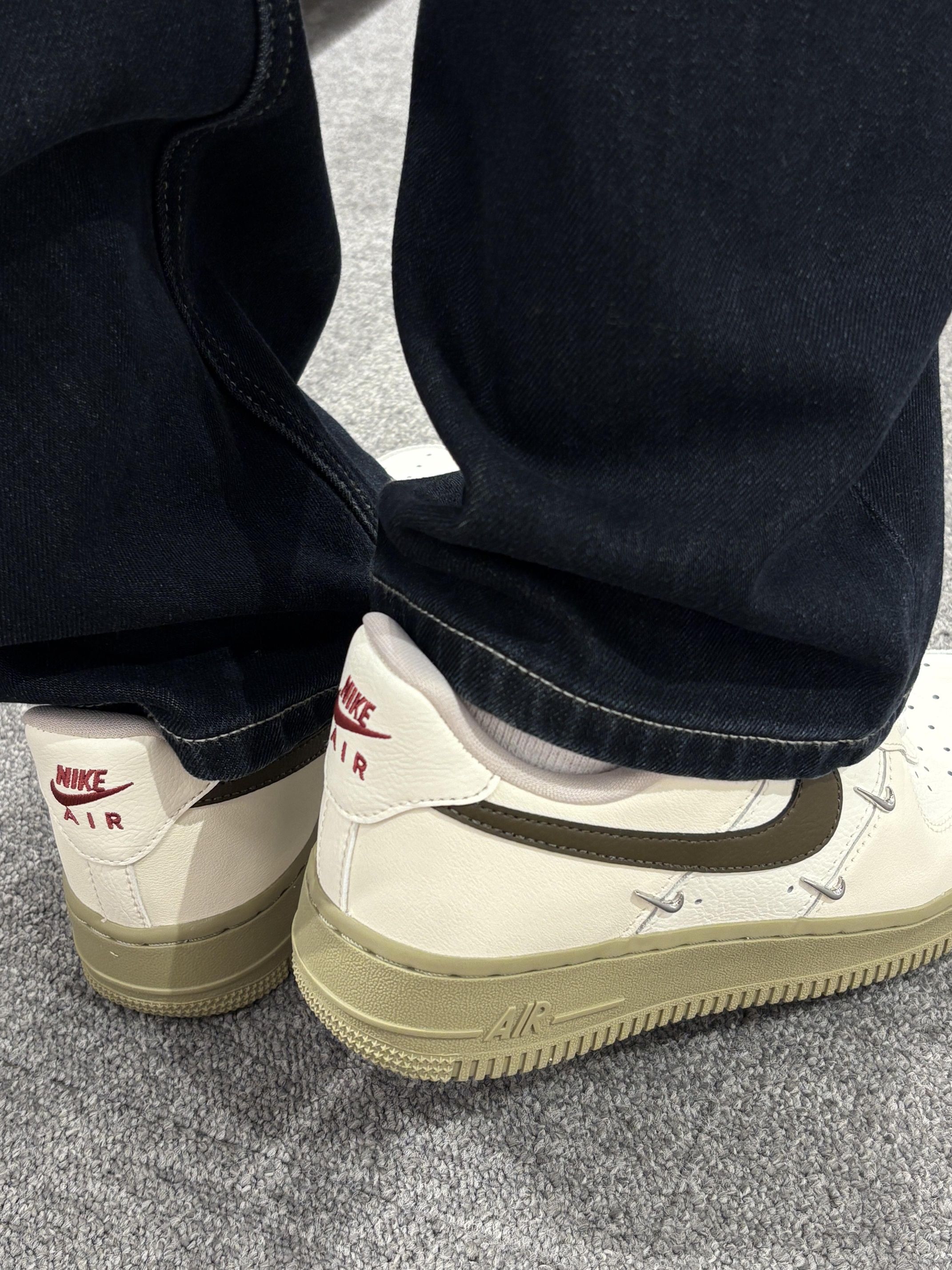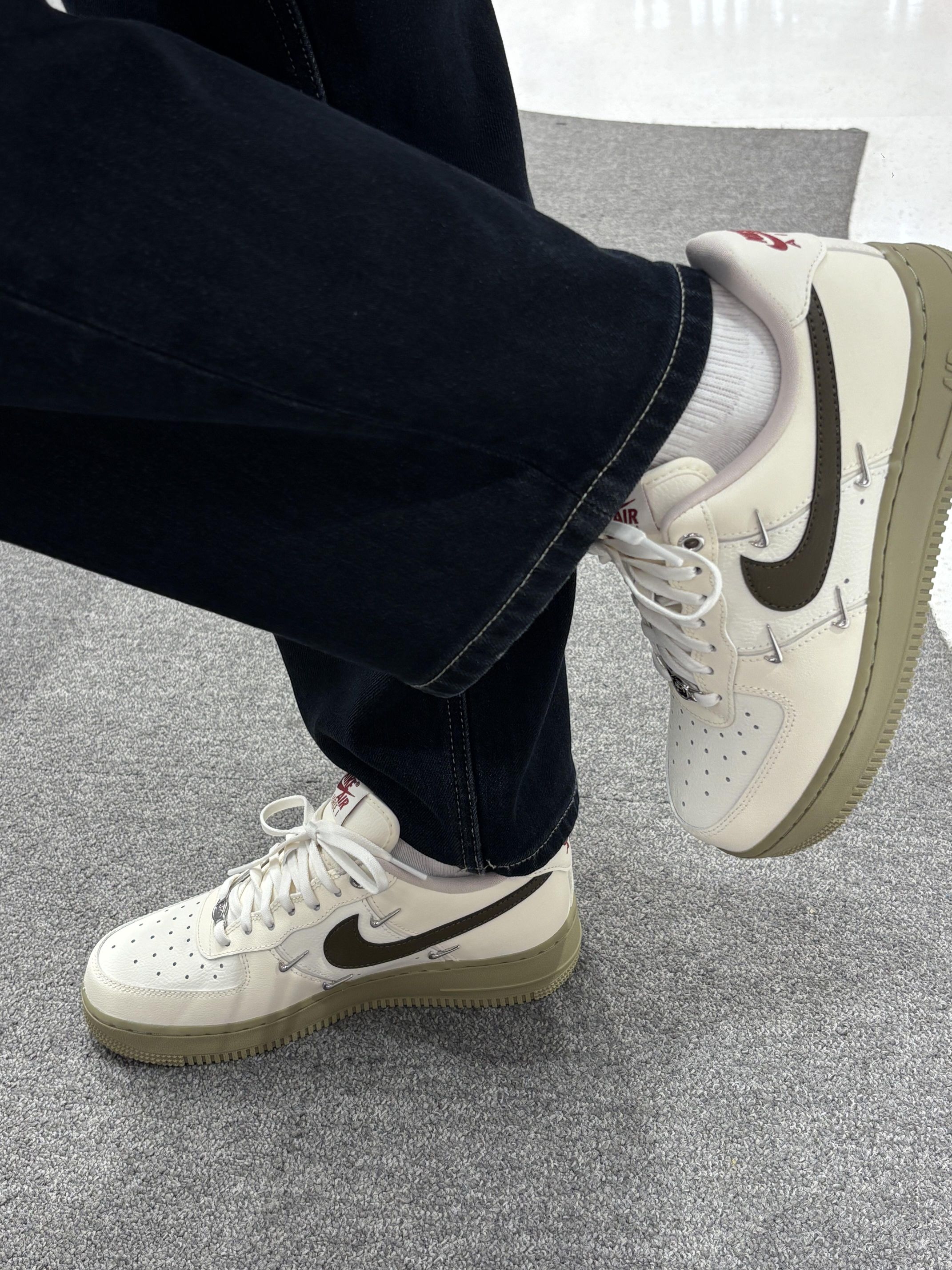 这双AF1的奶茶配色直接戳中我的心巴💘 米白鞋身搭橄榄绿勾子,鞋底也是同色系的浅卡其,低饱和的调调温柔又高级,不管搭黑裤子还是浅色系裤子都巨百搭,妥妥的氛围感神器~🧋 鞋身的小细节也超戳,金属四勾点缀得刚刚好,质感直接拉满✨ 上脚脚感也很舒服,暴走一天都不累,真的后悔没早点入!🍰