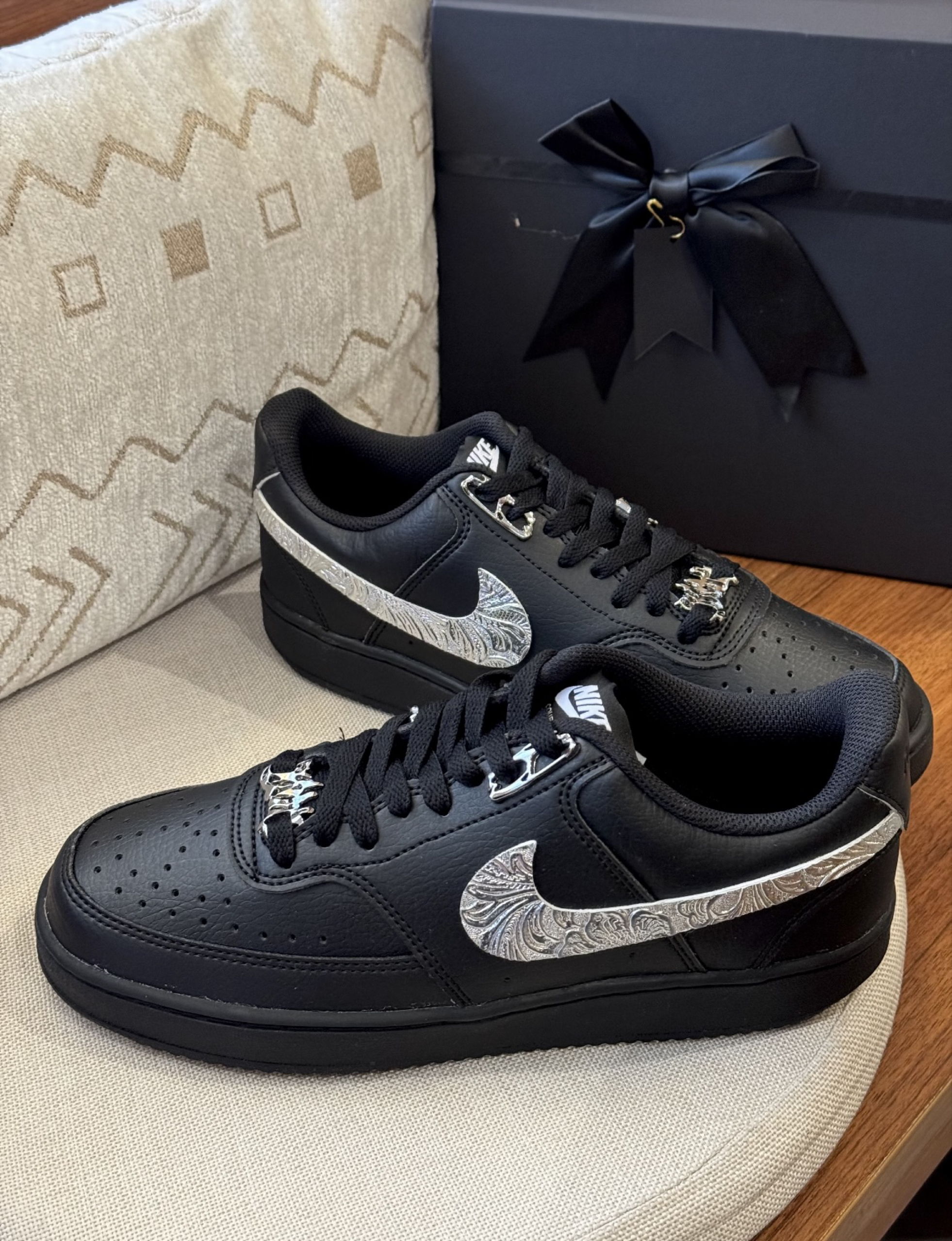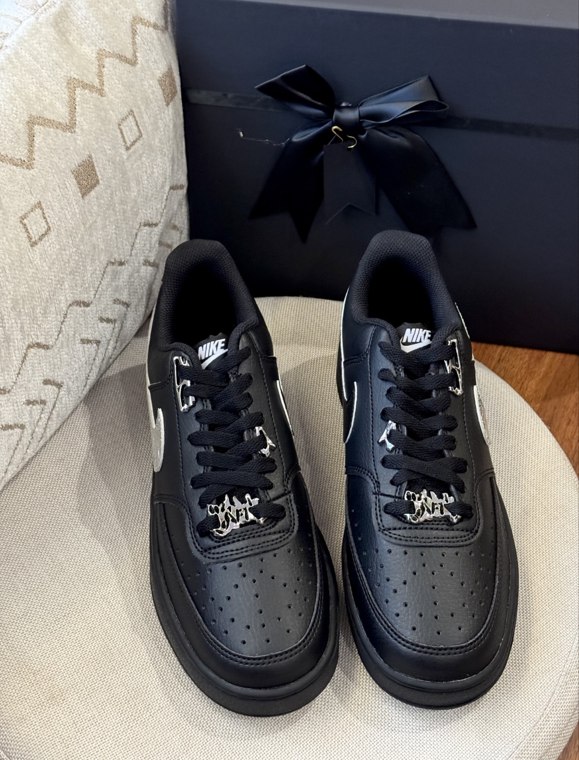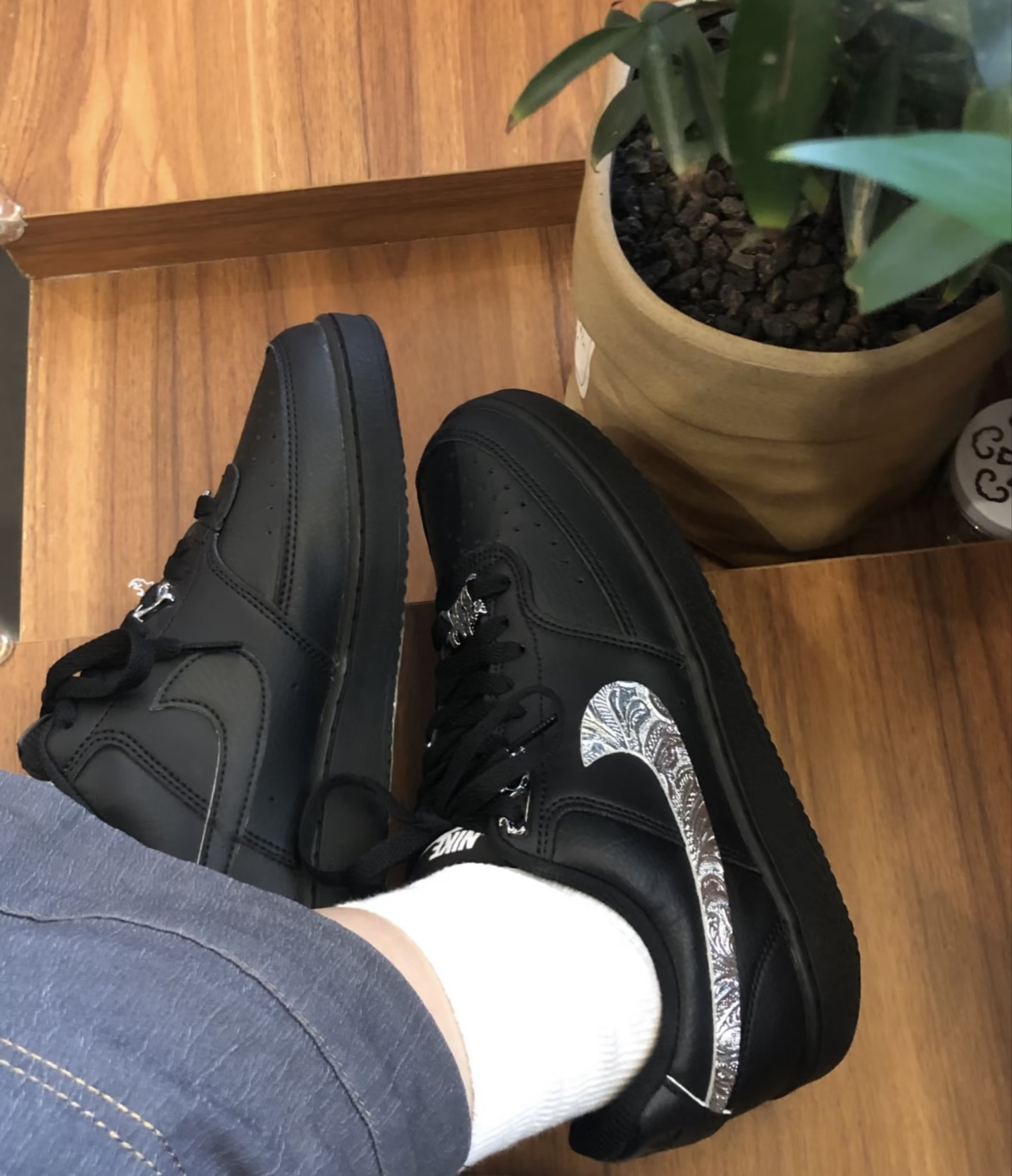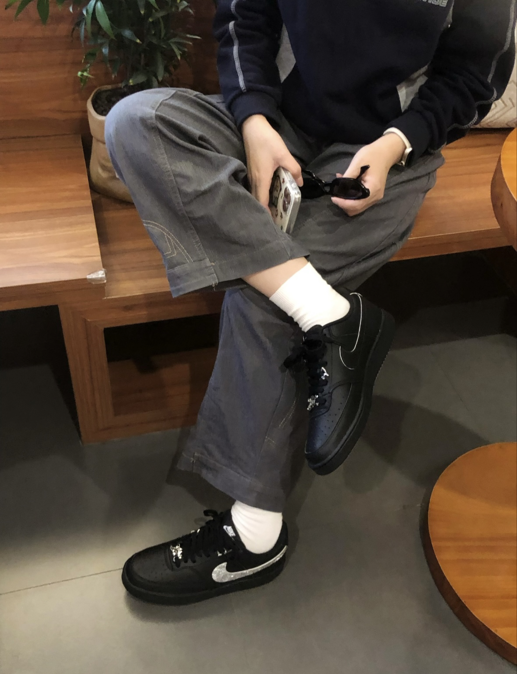 颜值:黑银配色高级感拉满,腰果花图案复古又时髦,不管是搭牛仔裤还是运动裤都很和谐,属于越看越耐看的类型。 • 脚感:经典的Air缓震,日常通勤、逛街都很舒服,久穿也不会累脚。 • 搭配:全黑鞋身+银色细节,适配各种风格,街头、复古、极简风都能hold住,白袜+牛仔裤的组合直接穿出美式复古感。 • 细节:鞋舌和后跟的Nike Logo也做了呼应设计,鞋带扣的小装饰也很有质感,整体做工很扎实。