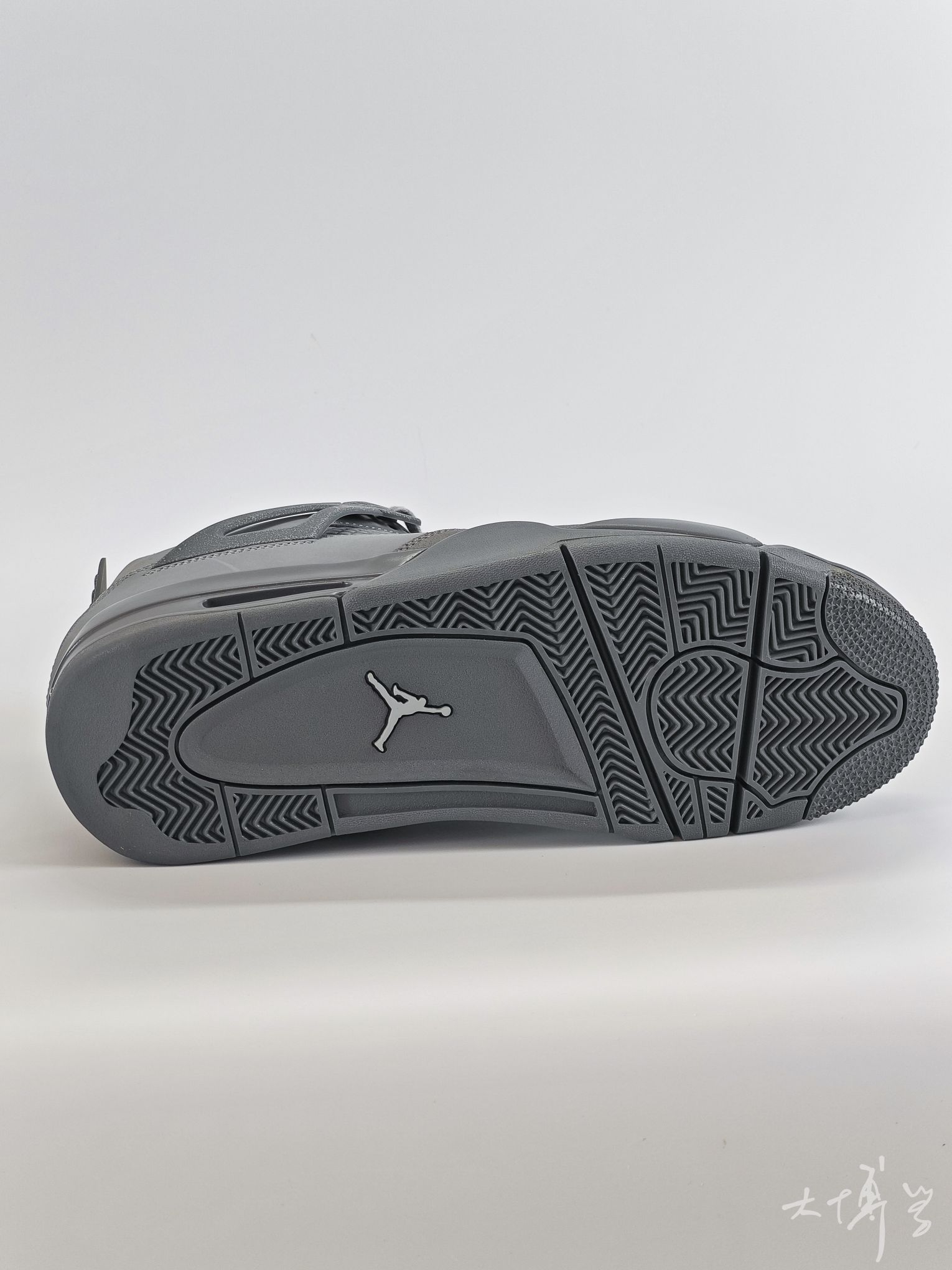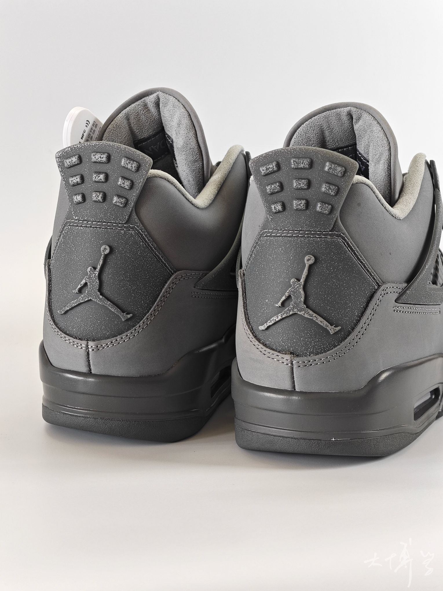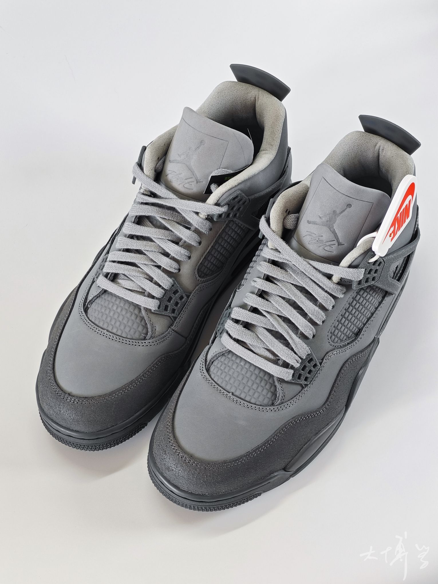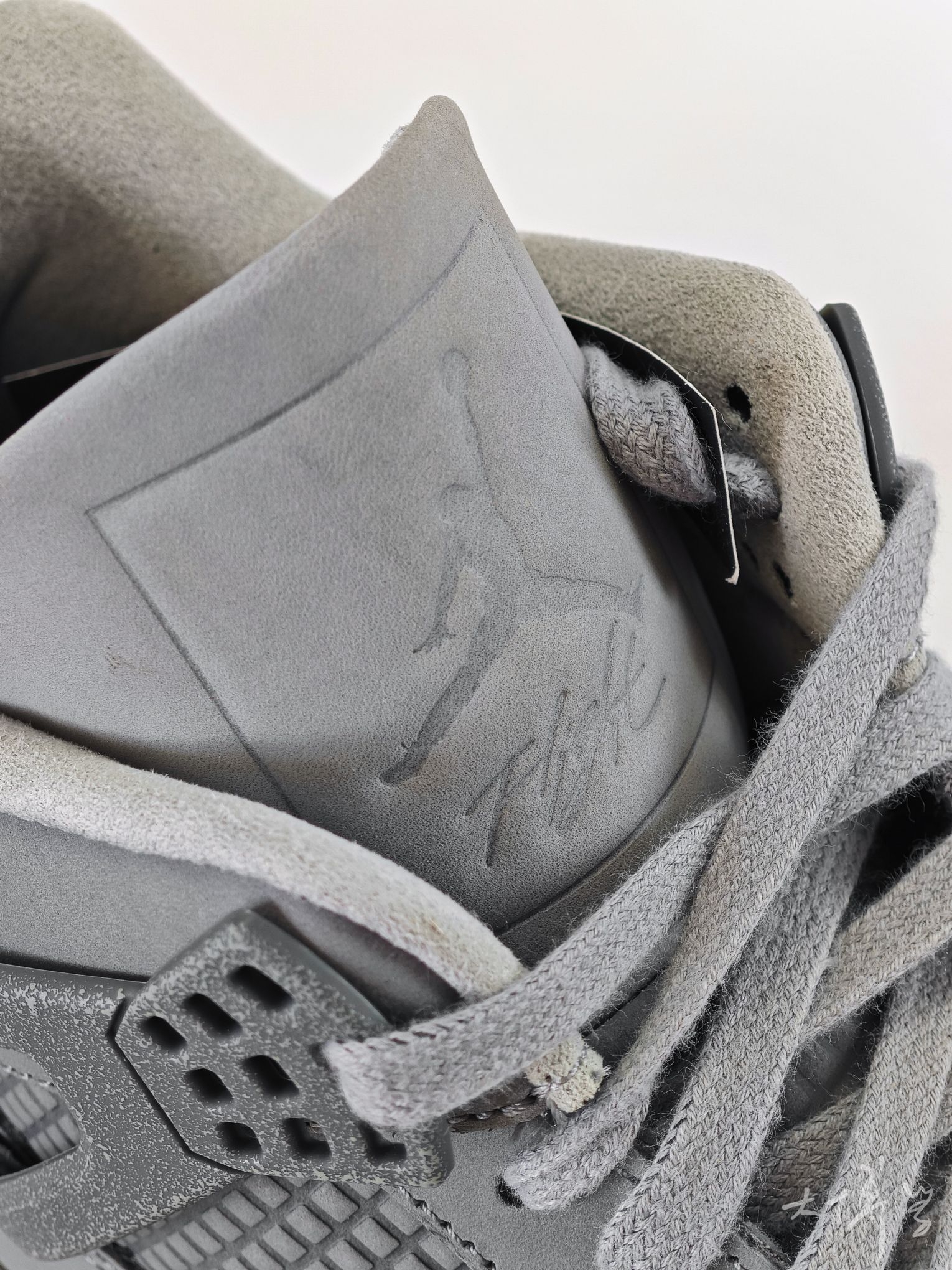 一双麂皮和磨砂皮为主的AJ4 鞋身是多种不同的灰色拼接而成 加上鞋盒的设计 真像是刚才水泥里捞出来一样 酷酷的灰色,颜值不输“雷公”“电母”