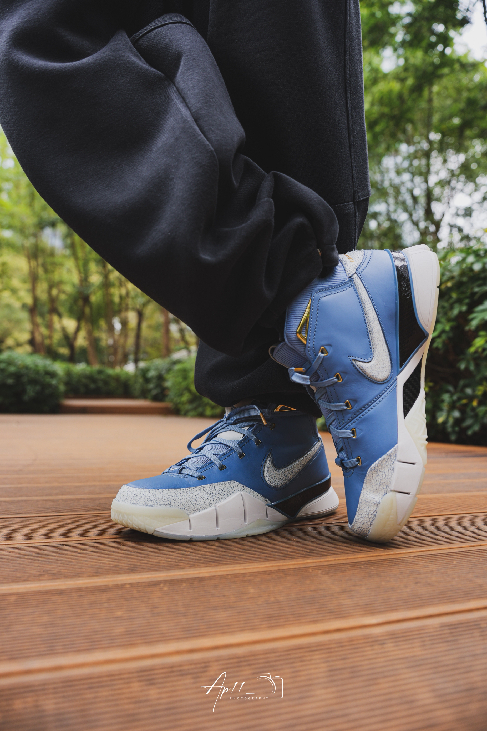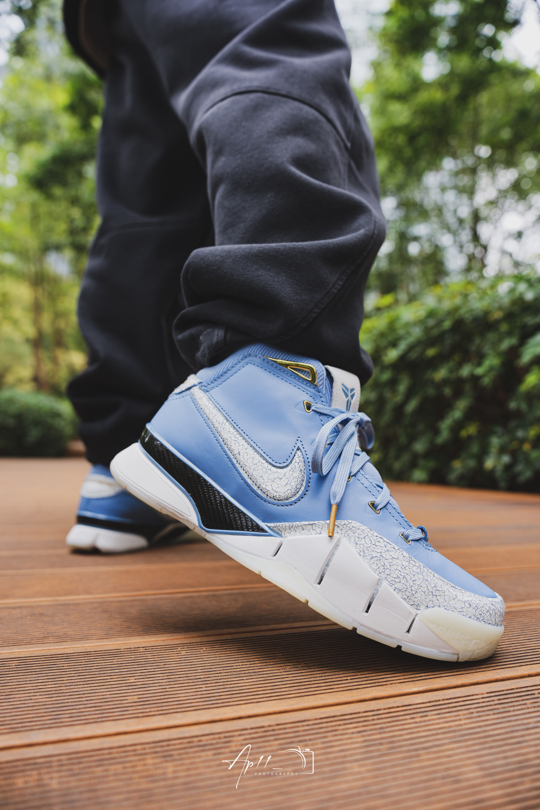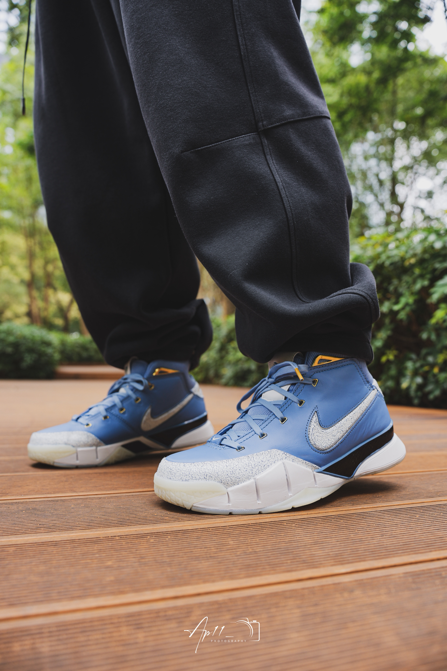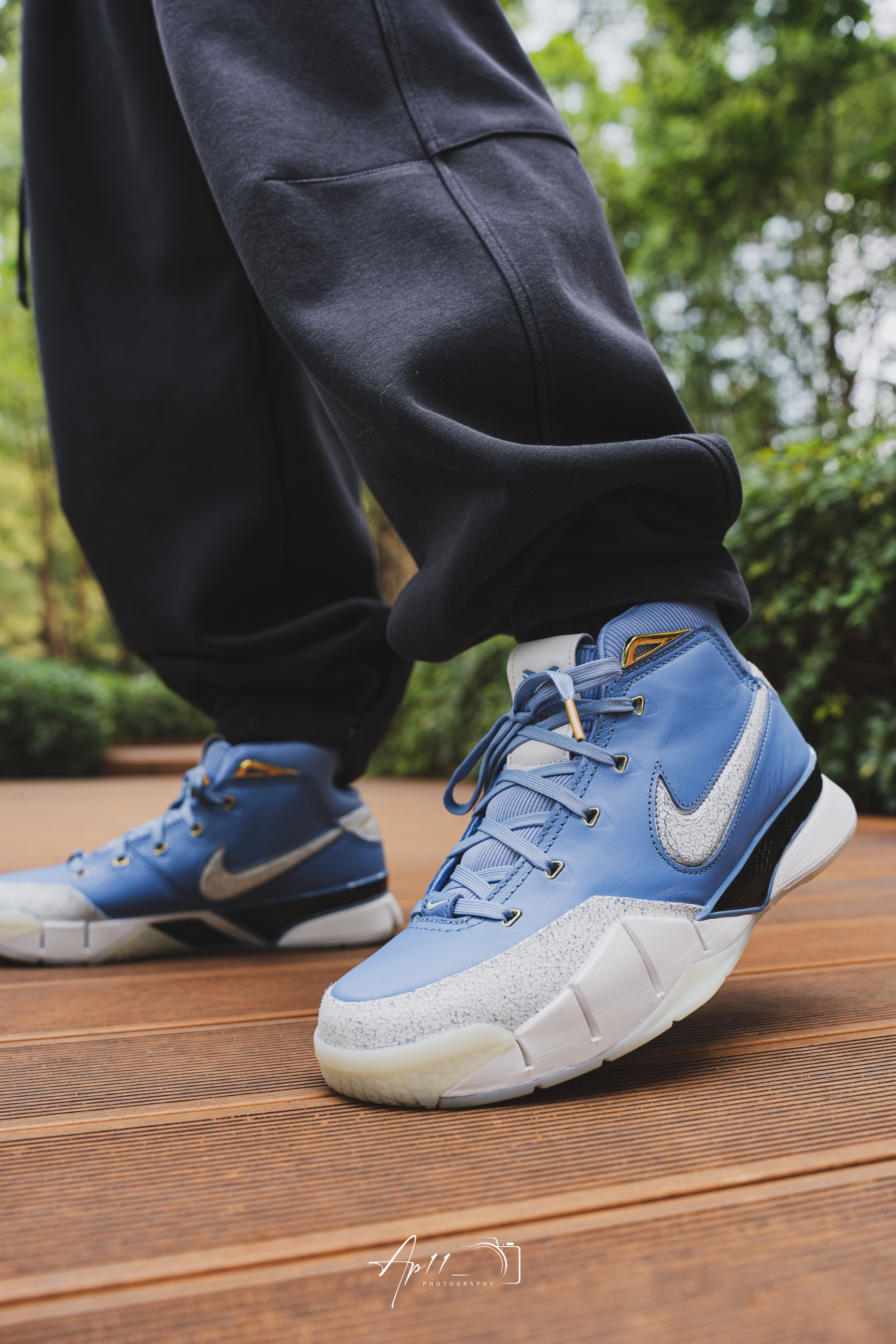 开春穿上了这双KOBE1,北卡蓝的皮革鞋面配上做旧裂纹细节,细节点缀得恰到好处。搭束脚裤出门,走在公园木栈道上,脚感依旧扎实,复古味拉满,每次上脚都像把青春穿在了脚上。