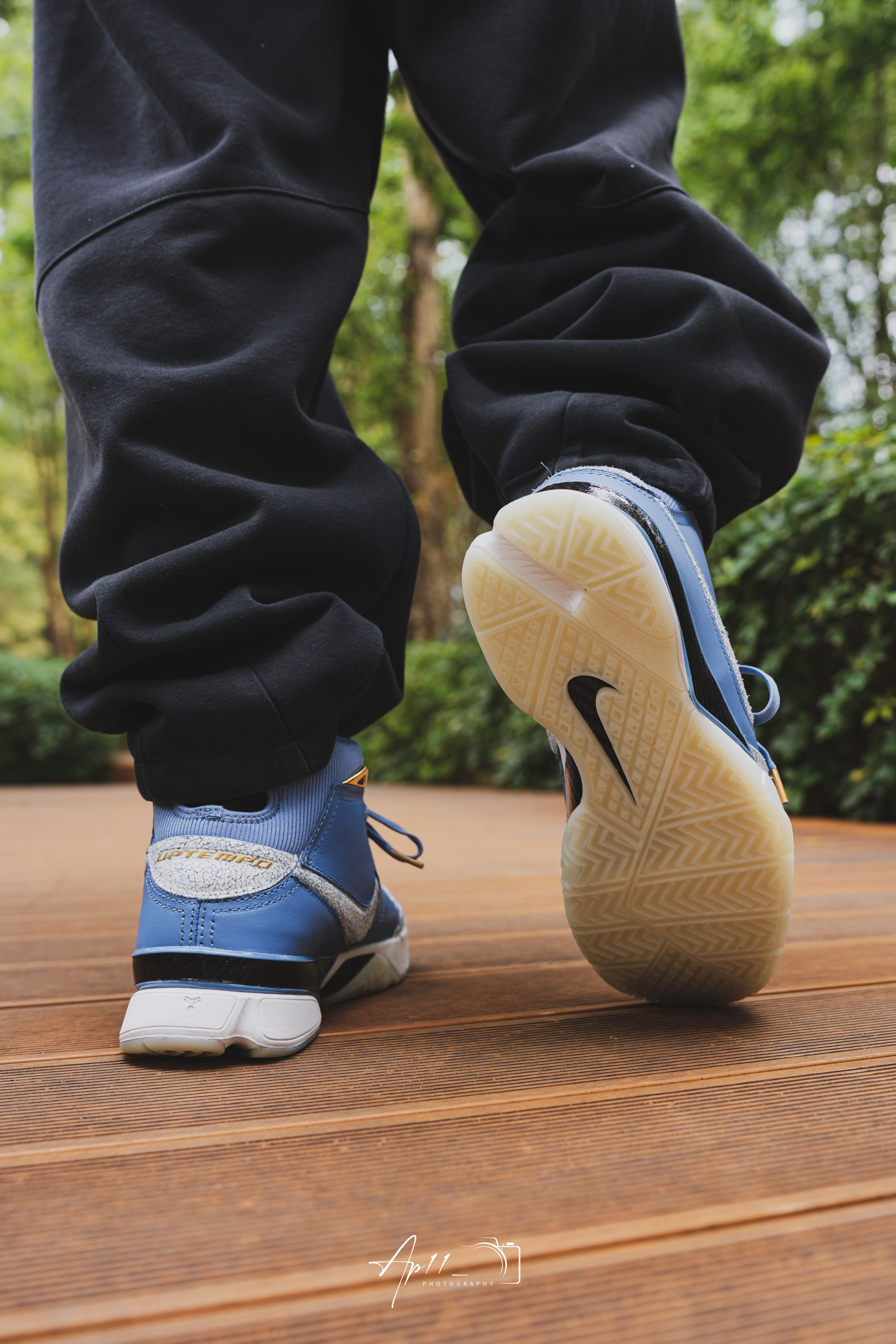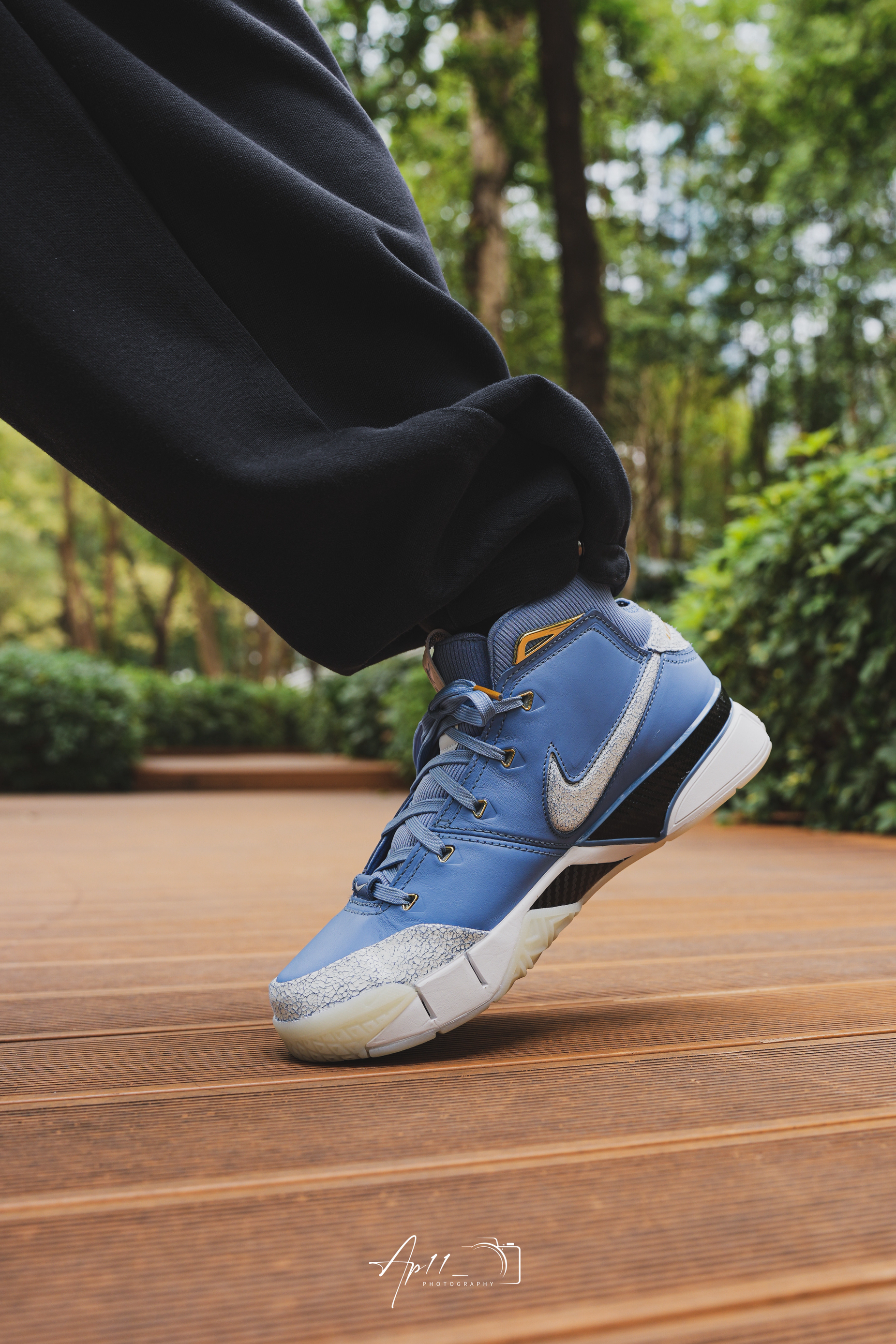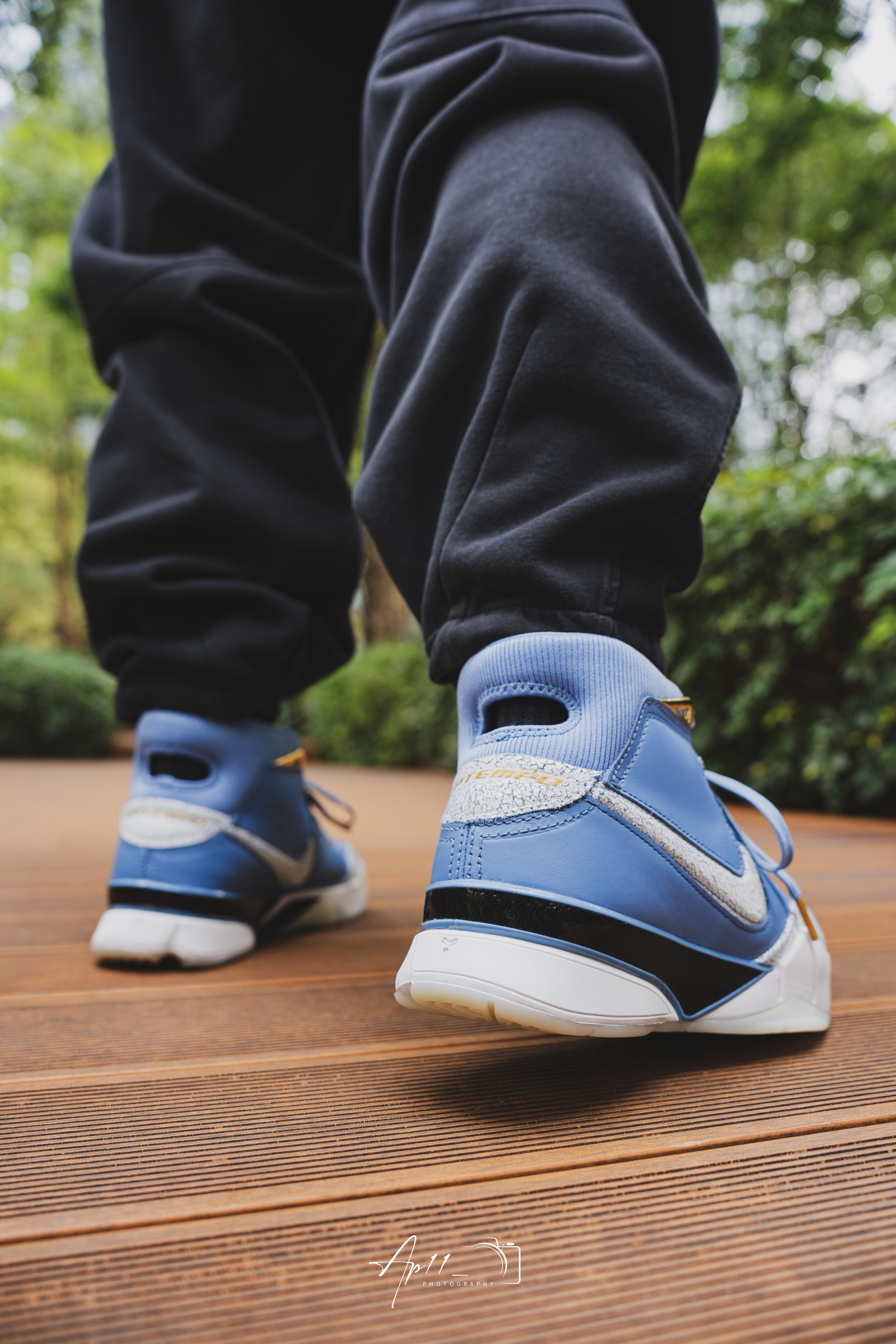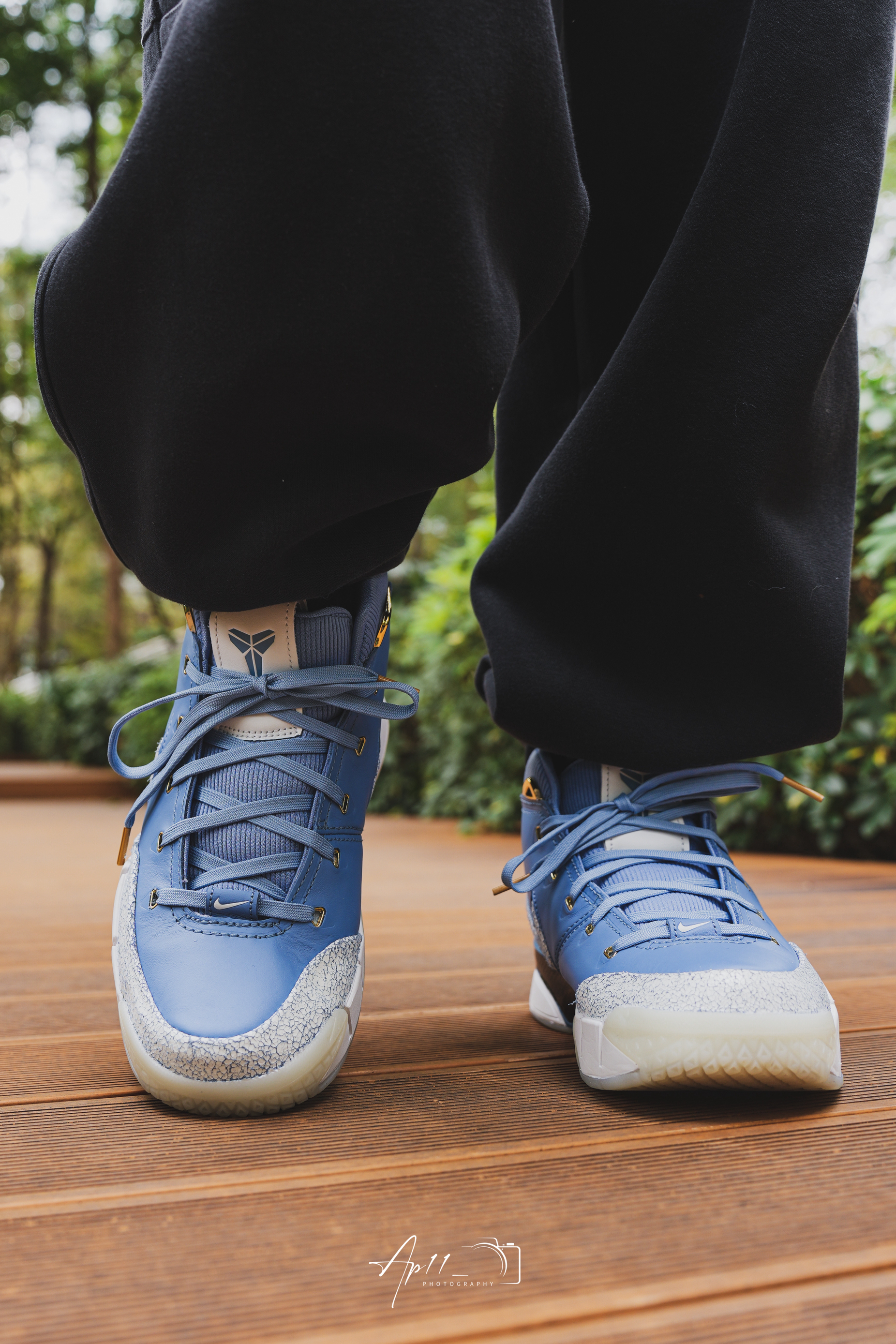 开春穿上了这双KOBE1,北卡蓝的皮革鞋面配上做旧裂纹细节,细节点缀得恰到好处。搭束脚裤出门,走在公园木栈道上,脚感依旧扎实,复古味拉满,每次上脚都像把青春穿在了脚上。