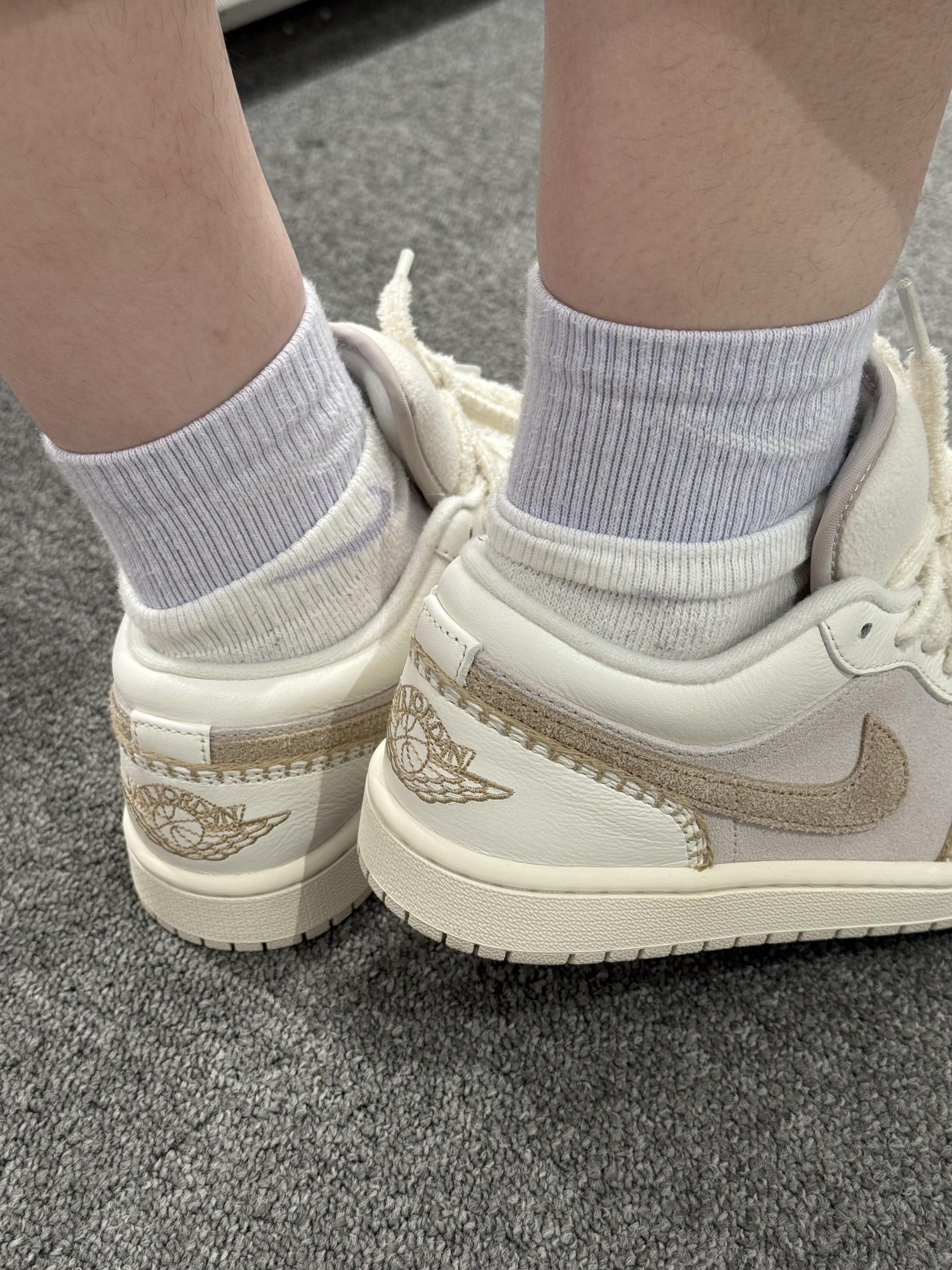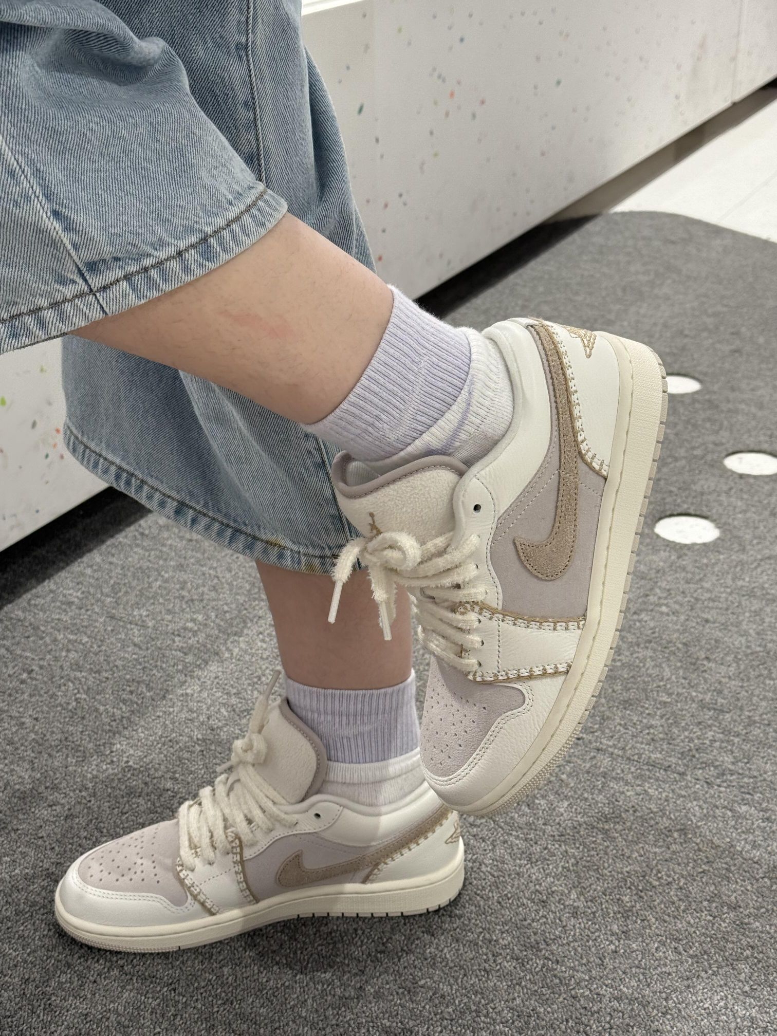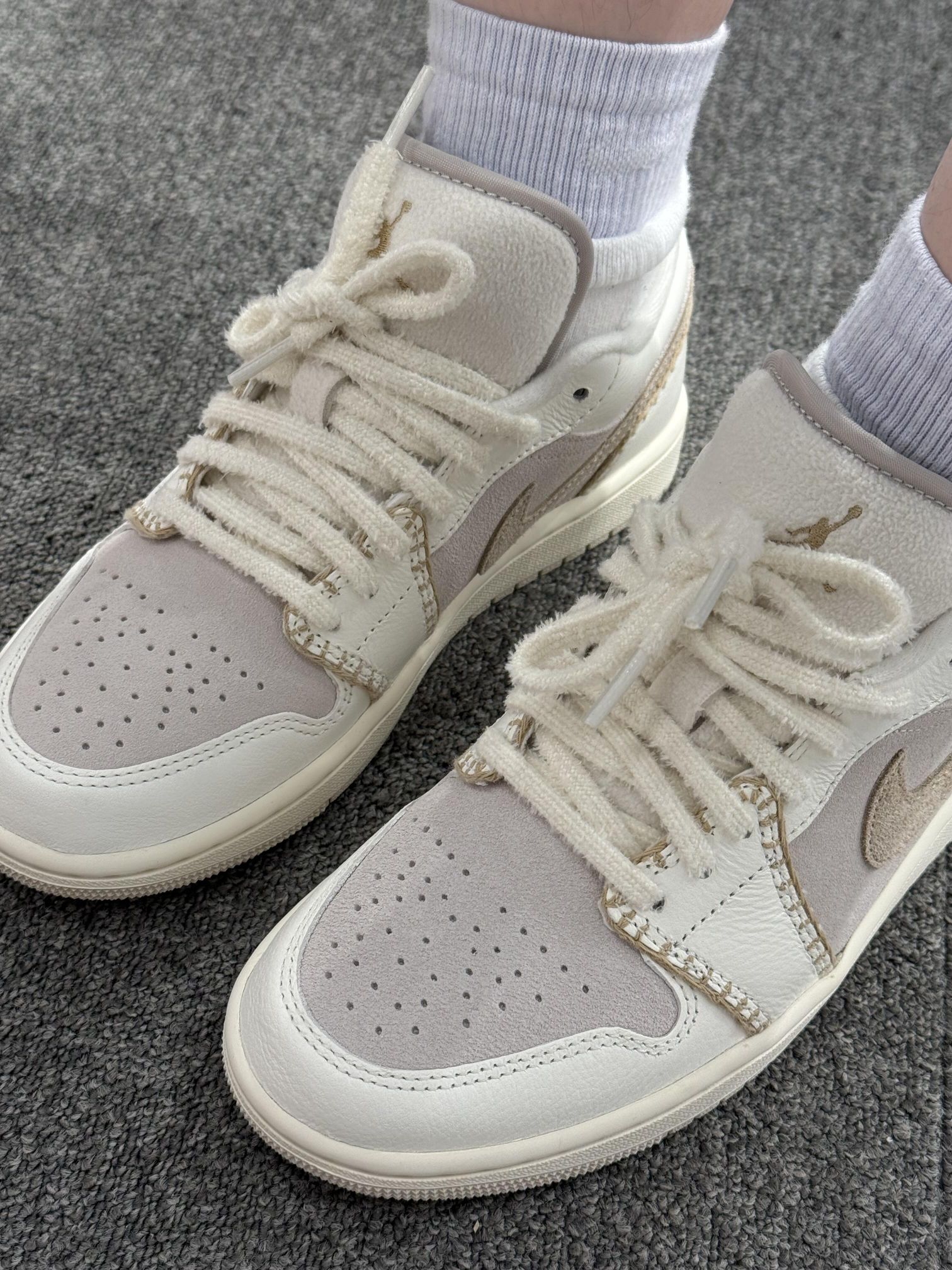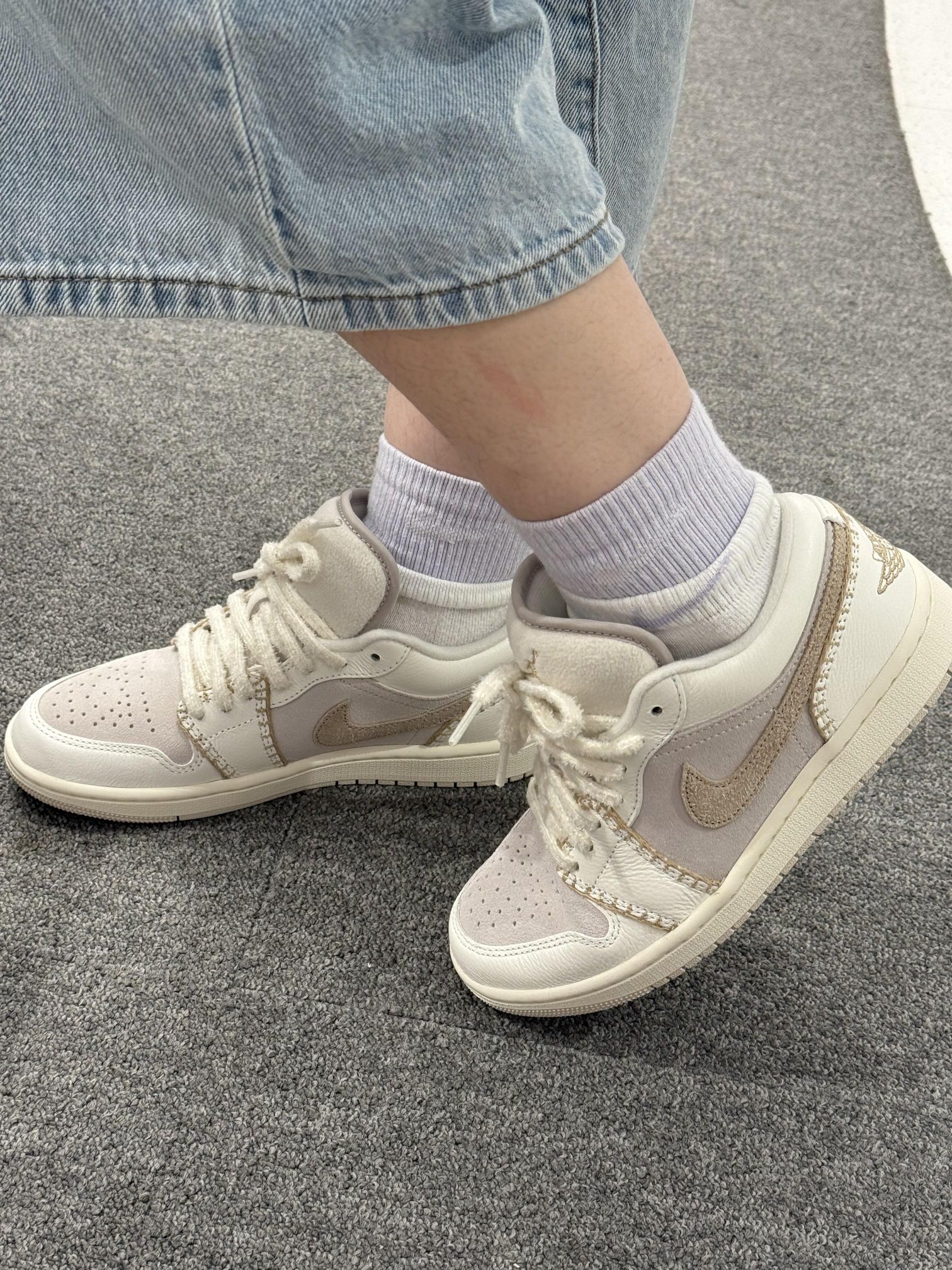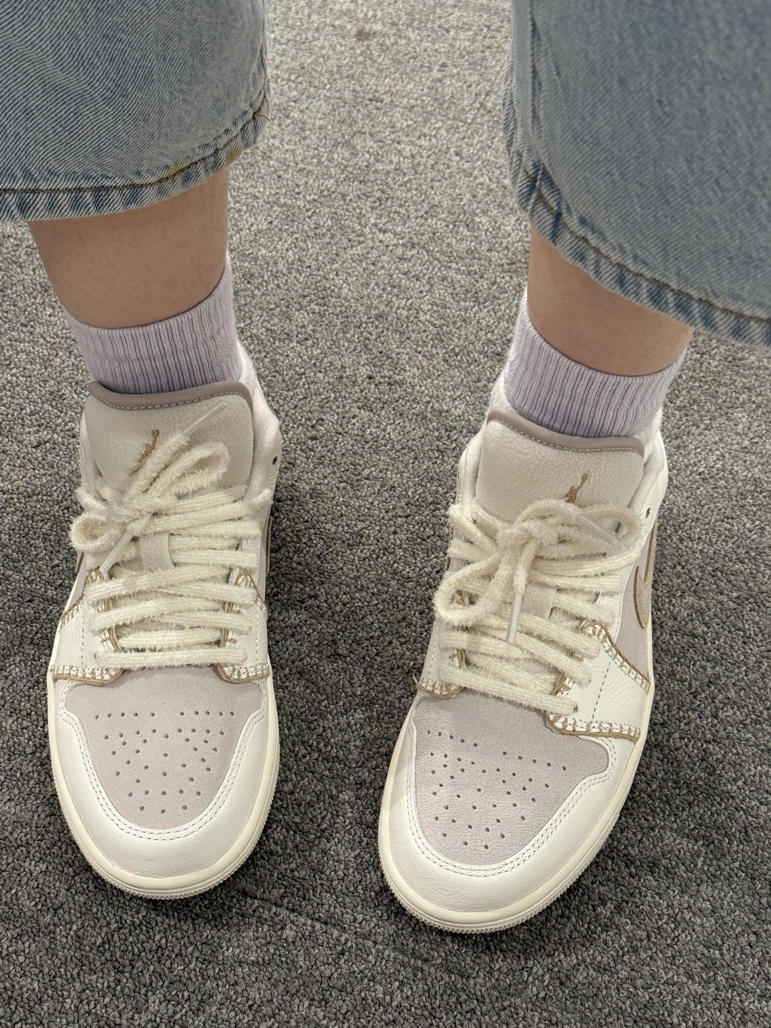 奶fufu的米白+浅灰配色,像把云朵踩在脚下☁️ 鞋身的缝线设计超有小香风那味儿,毛茸茸的鞋带和鞋舌,精致得想抱着鞋亲一口!🧁🧁 搭配浅紫堆堆袜和阔腿牛仔,软萌感直接拉满✨ 走在路上感觉自己是甜度超标の元气崽崽~🍦 现在连低头系鞋带都变成幸福小事,这双鞋大概是来治愈我的吧!🥺 穿它出门的每一天,空气里都飘着软乎乎的甜~🍰
