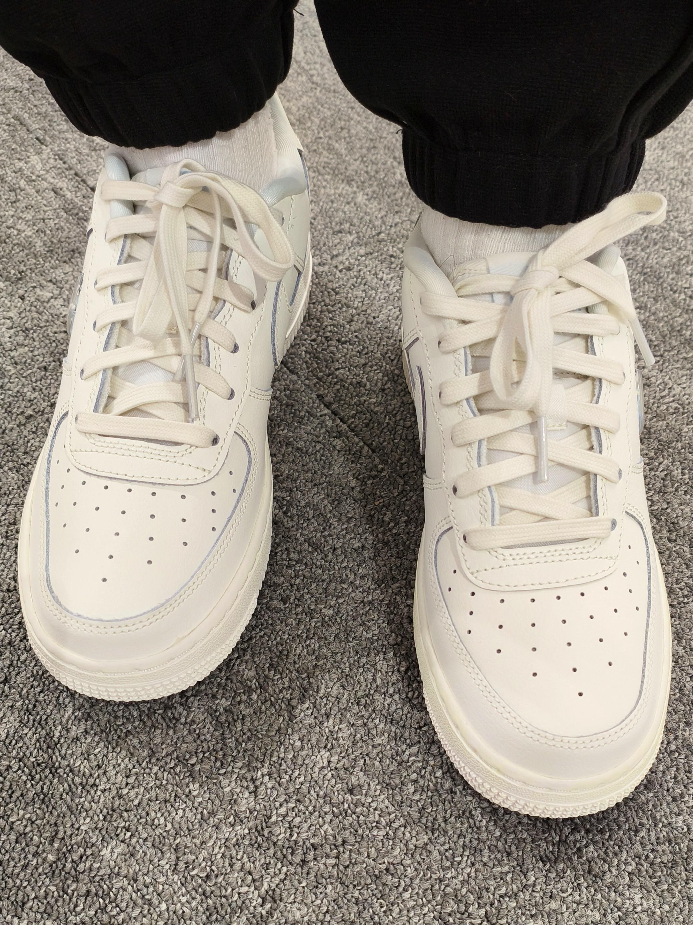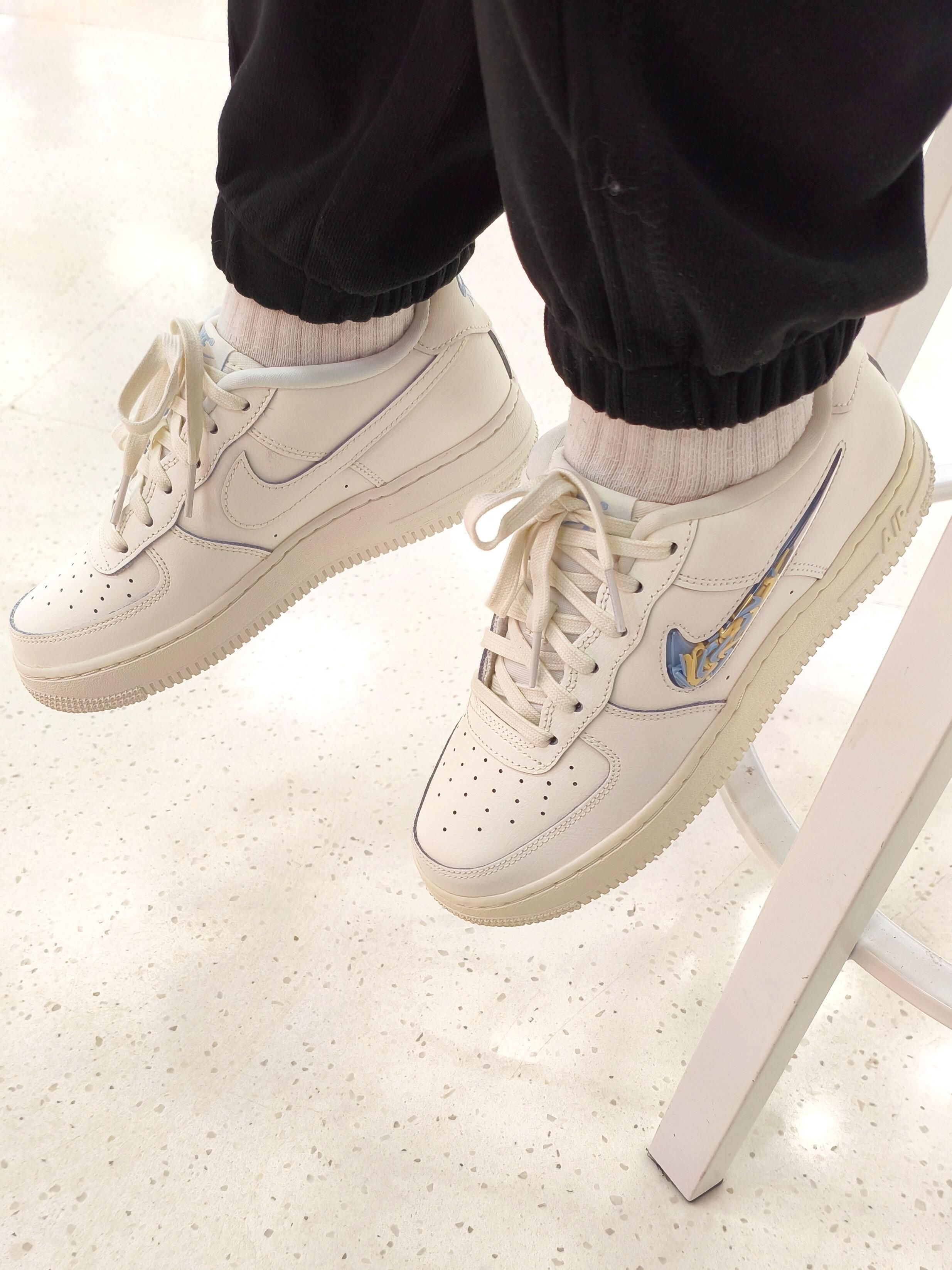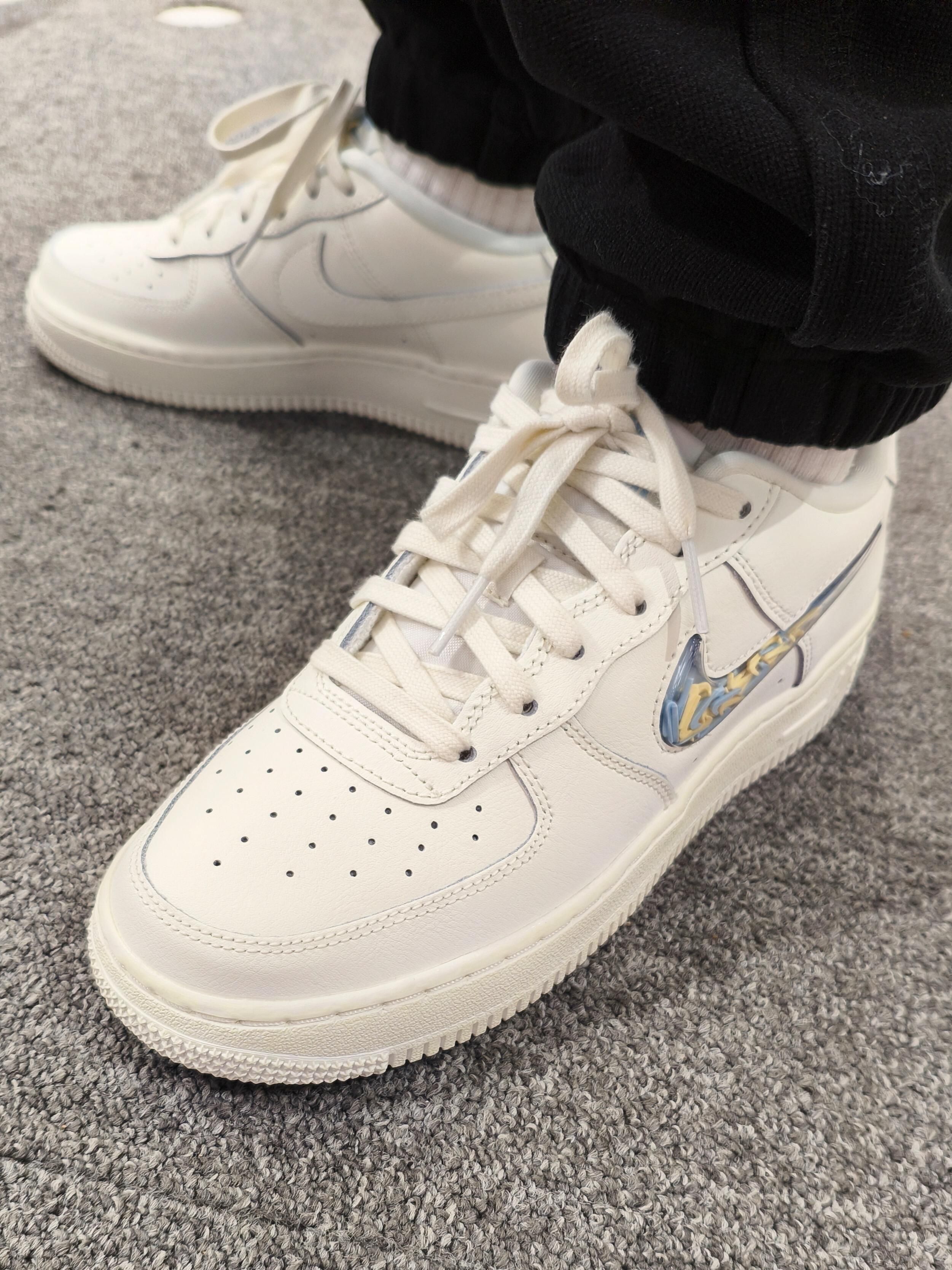 在鞋架上一眼锁定这双Nike Air Force 1的瞬间,就知道钱包要空了!🙈🙈 米白色鞋身是那种“被阳光晒软的奶油”质感,不是死板的白,带点做旧的暖调,衬得脚巨白!鞋带和中底的米黄做旧设计,直接把复古氛围拉满,走几步都像踩着90年代的青春电影画面~🍍🍍 身侧面的浅灰蓝线条太妙了!轻轻勾勒出鞋型轮廓,让简约的AF1多了份灵动;最绝的是Swoosh标识——蓝黄渐变晕染像初夏晴空过渡到落日余晖,上面...