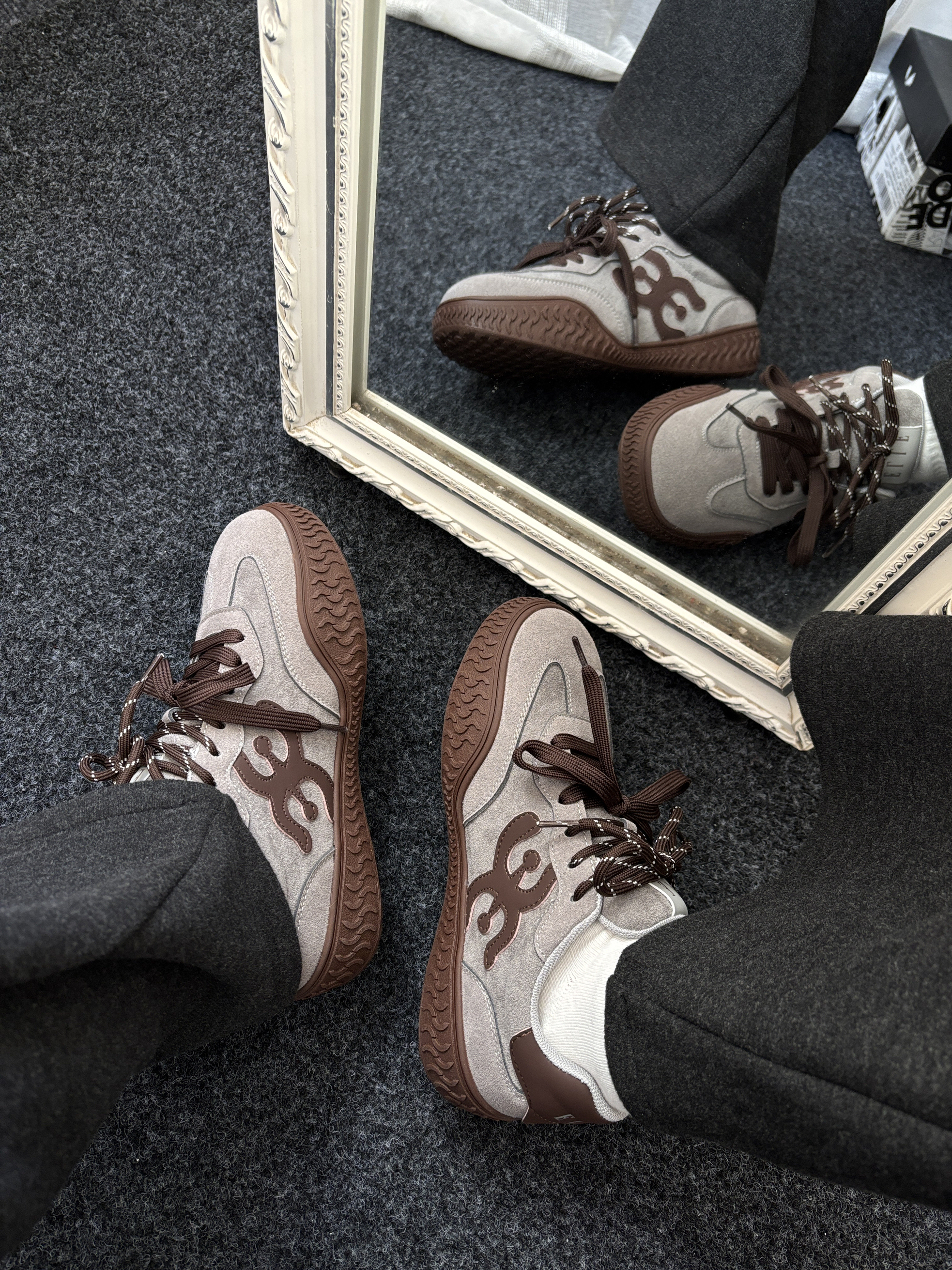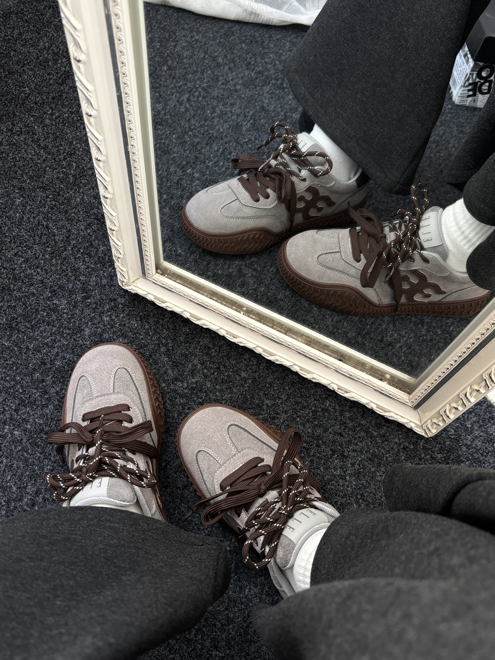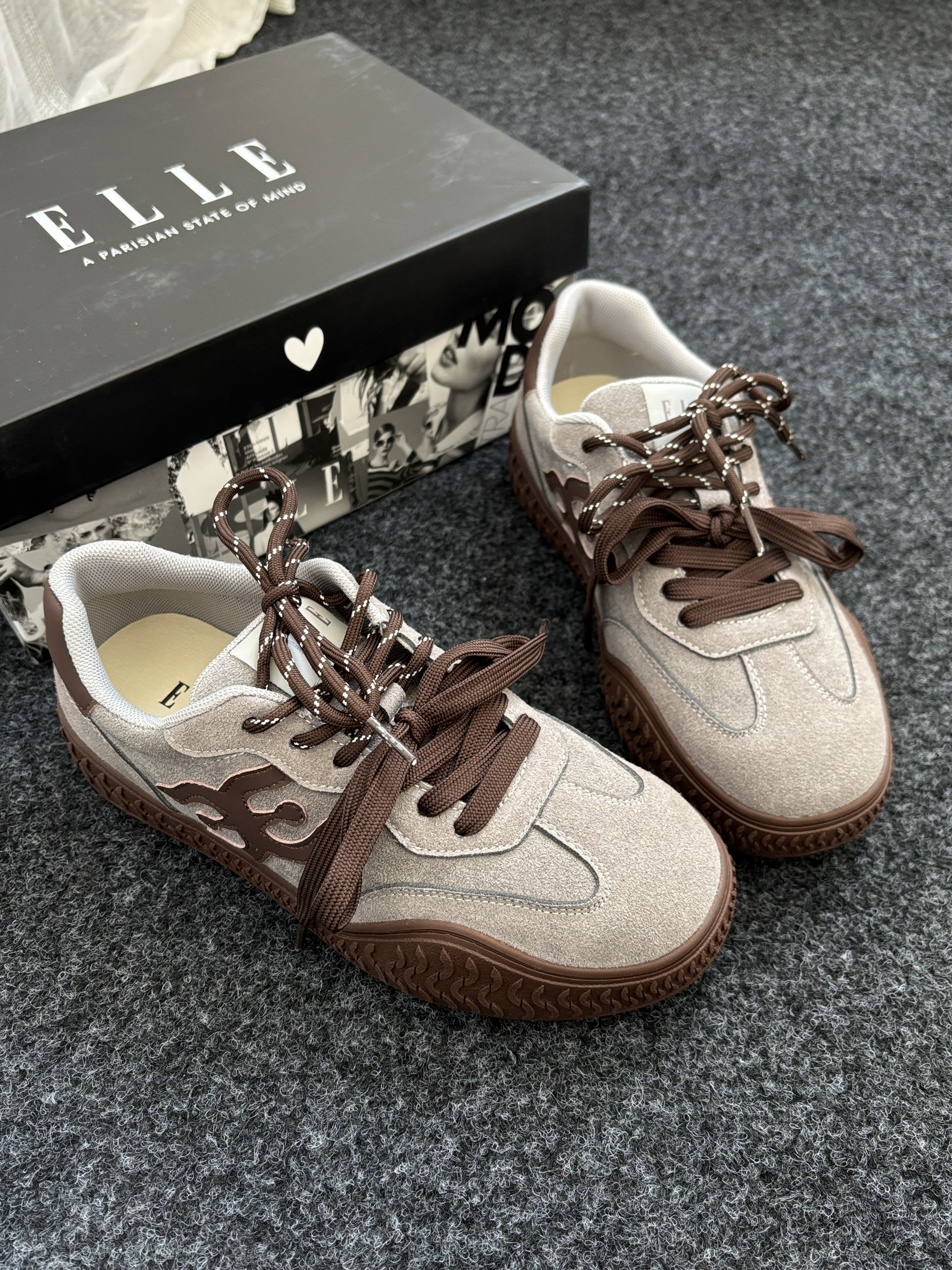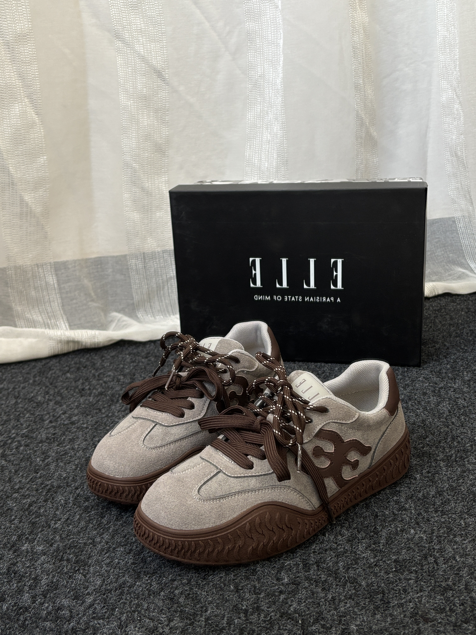 今天给大家分享一双有氛围感的鞋子✌️ 这双ELLE家的德训鞋灰色和咖色拼接 很有美式时尚复古感就很适合秋冬季穿 双鞋带设计层次感满满~ 鞋垫是猪皮革的穿起来很Q 弹软软的😌 个人感觉不错搭配一条牛仔裤休闲裤去穿都 ok👌
