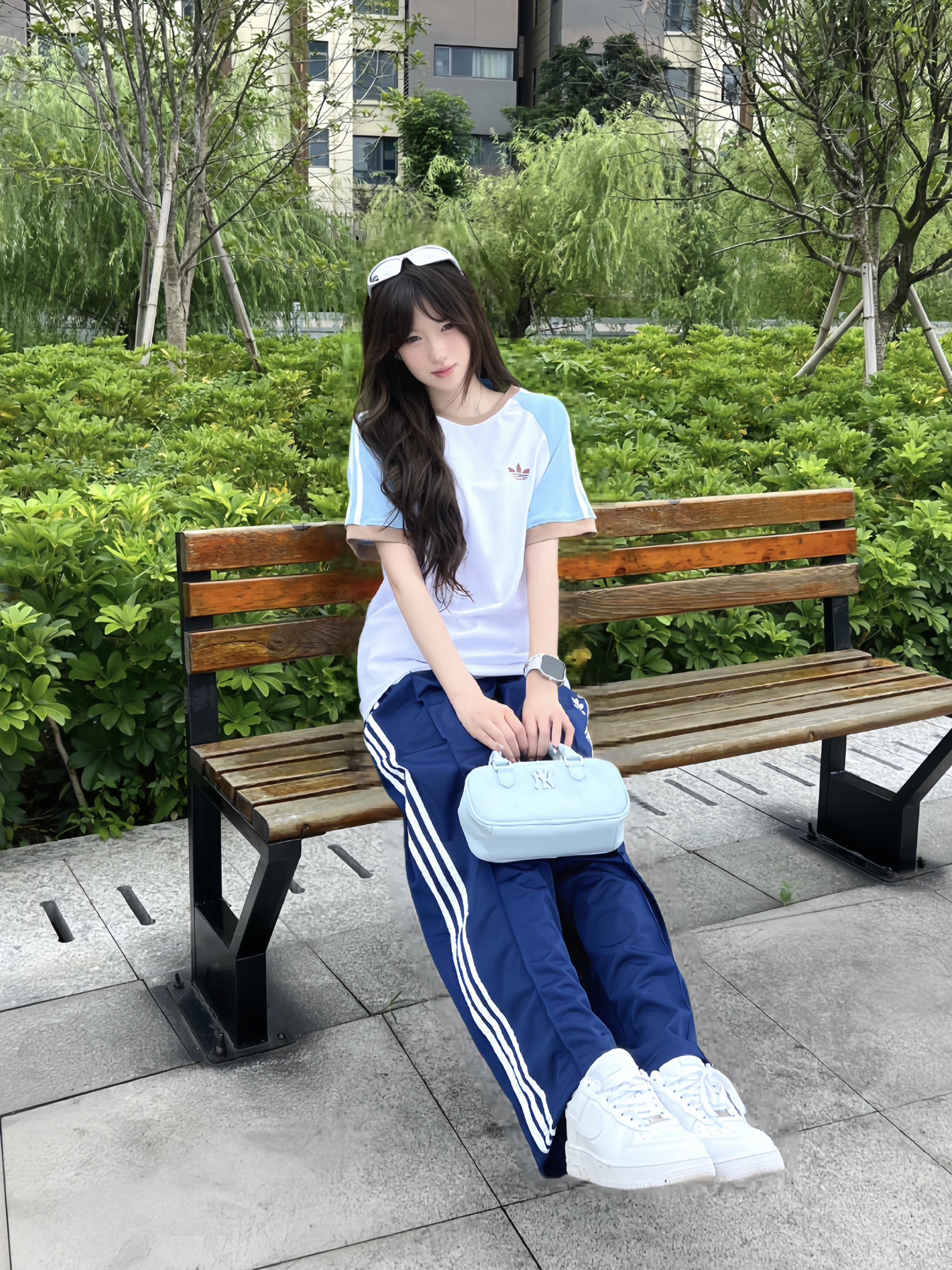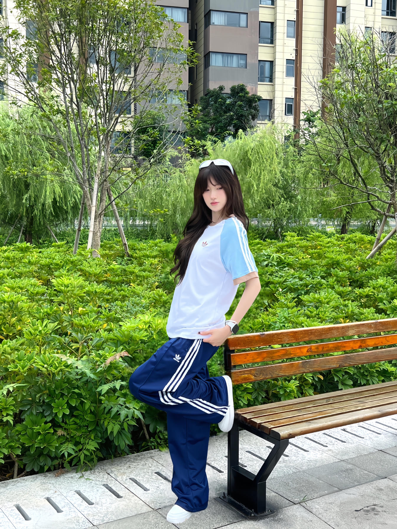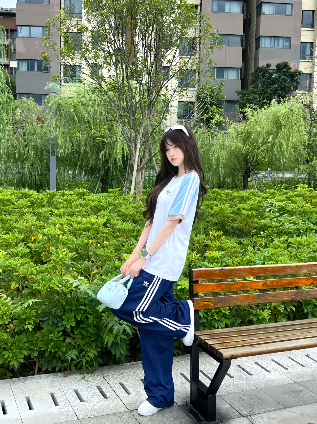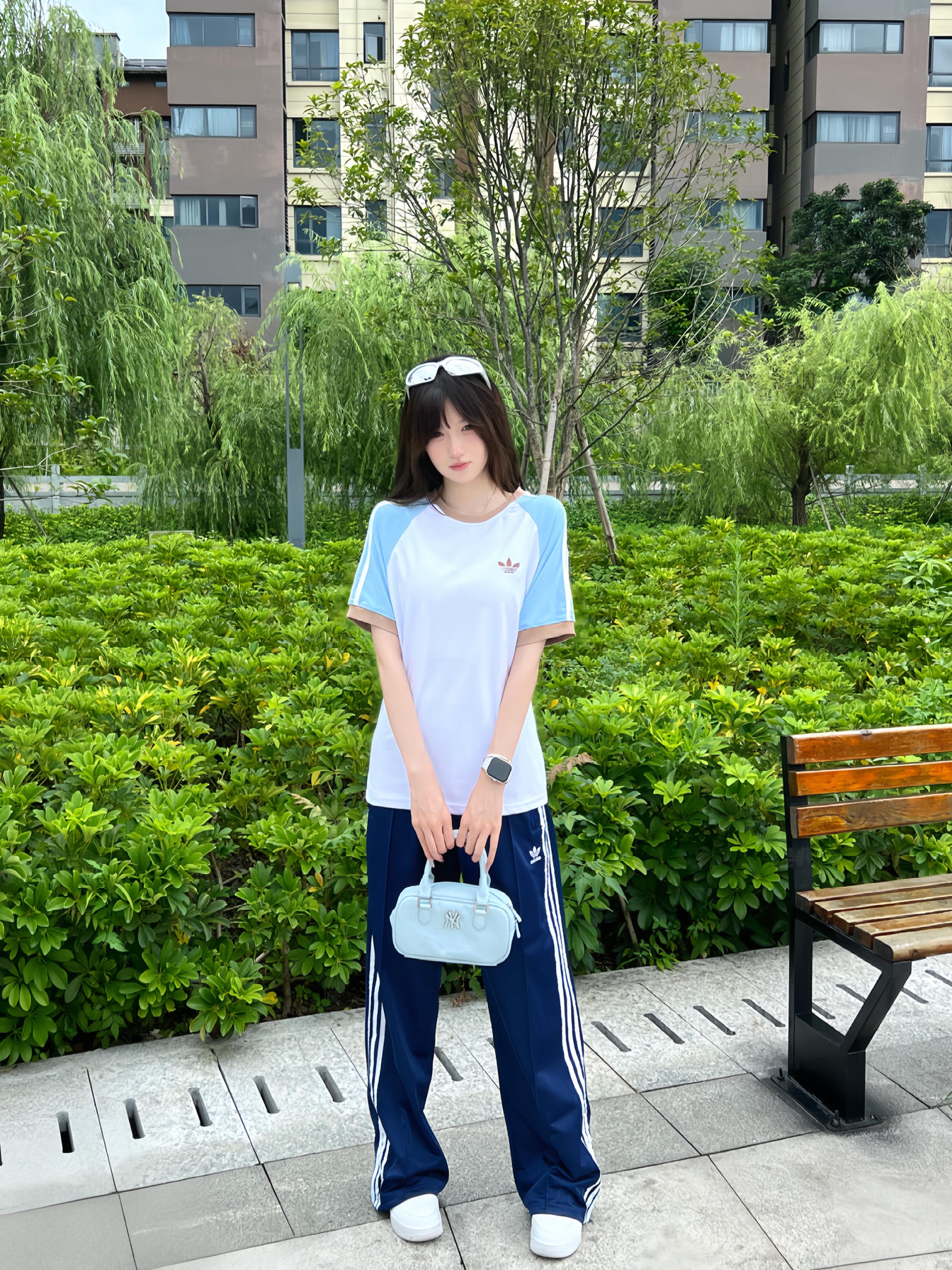 hello宝宝萌~ 又到开学季啦给你们看看我的早春穿蓝白撞色运动套装真的太适合夏天了! 上衣是白蓝拼接的三叶草短袖,面料轻薄透气,运动风满满又不失少女感 下装是同系列的藏蓝三条杠阔腿裤,垂感很好,显腿长又藏肉,走路带风的感觉谁懂! 包包:浅蓝波士顿包,和上衣的蓝色袖子完美呼应,增加了整体的层次感~ 💡 穿搭小Tips:这套穿搭很适合校园、公园或者运动休闲的场合,舒适又上镜