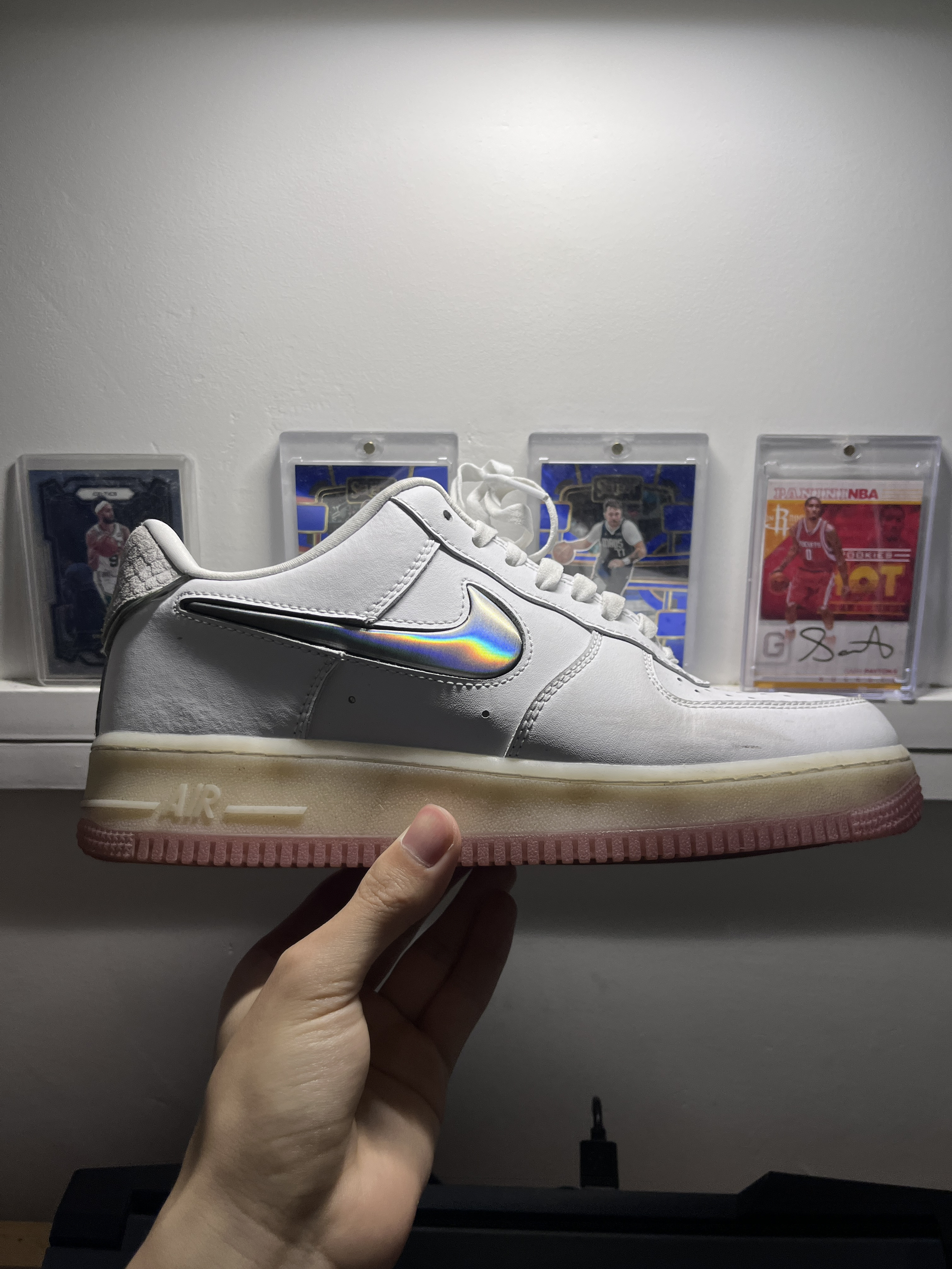 别划走!Nike Air Force 1镭射果冻底封神了✨ 谁能拒绝纯白鞋身+双勾镭射的神仙组合?光线一扫,虹光炸裂💥 渐变粉果冻底嫩到犯规,颜值直接拉满! 脚感更是王炸,Air气垫软到像踩棉花☁️ 久站不酸、暴走不累,包裹感绝了!甜酷风、通勤风随便搭,春夏出街穿它,你就是自带光环的焦点!