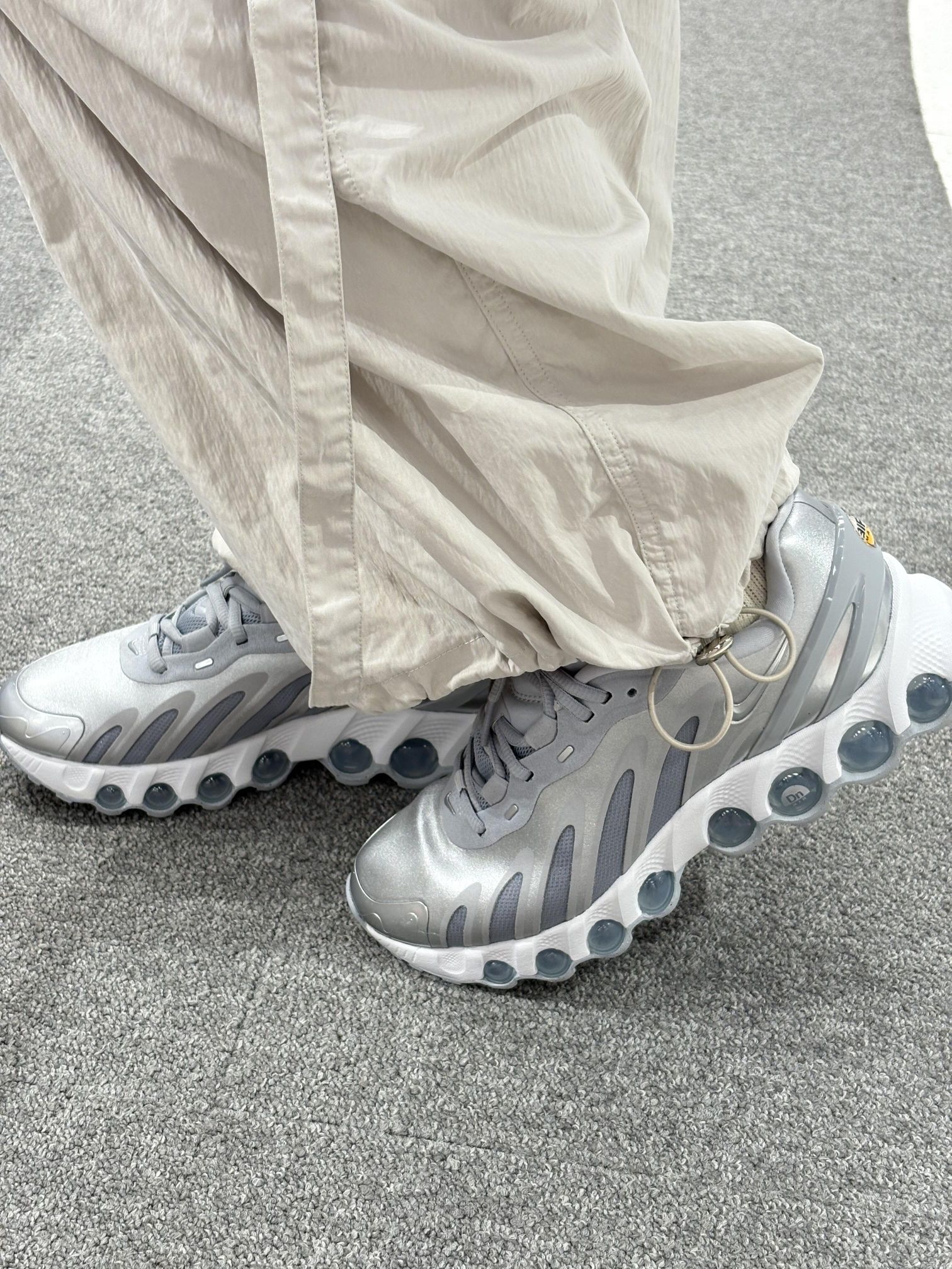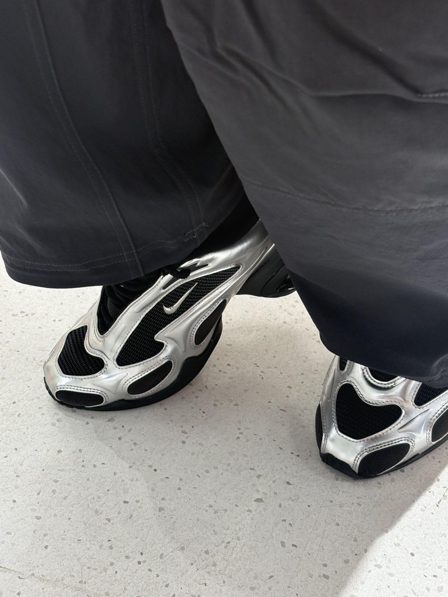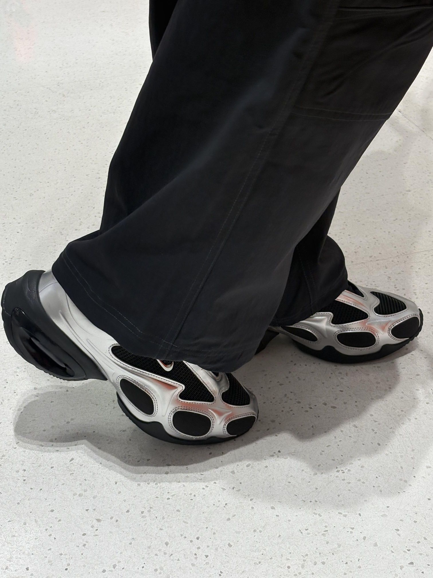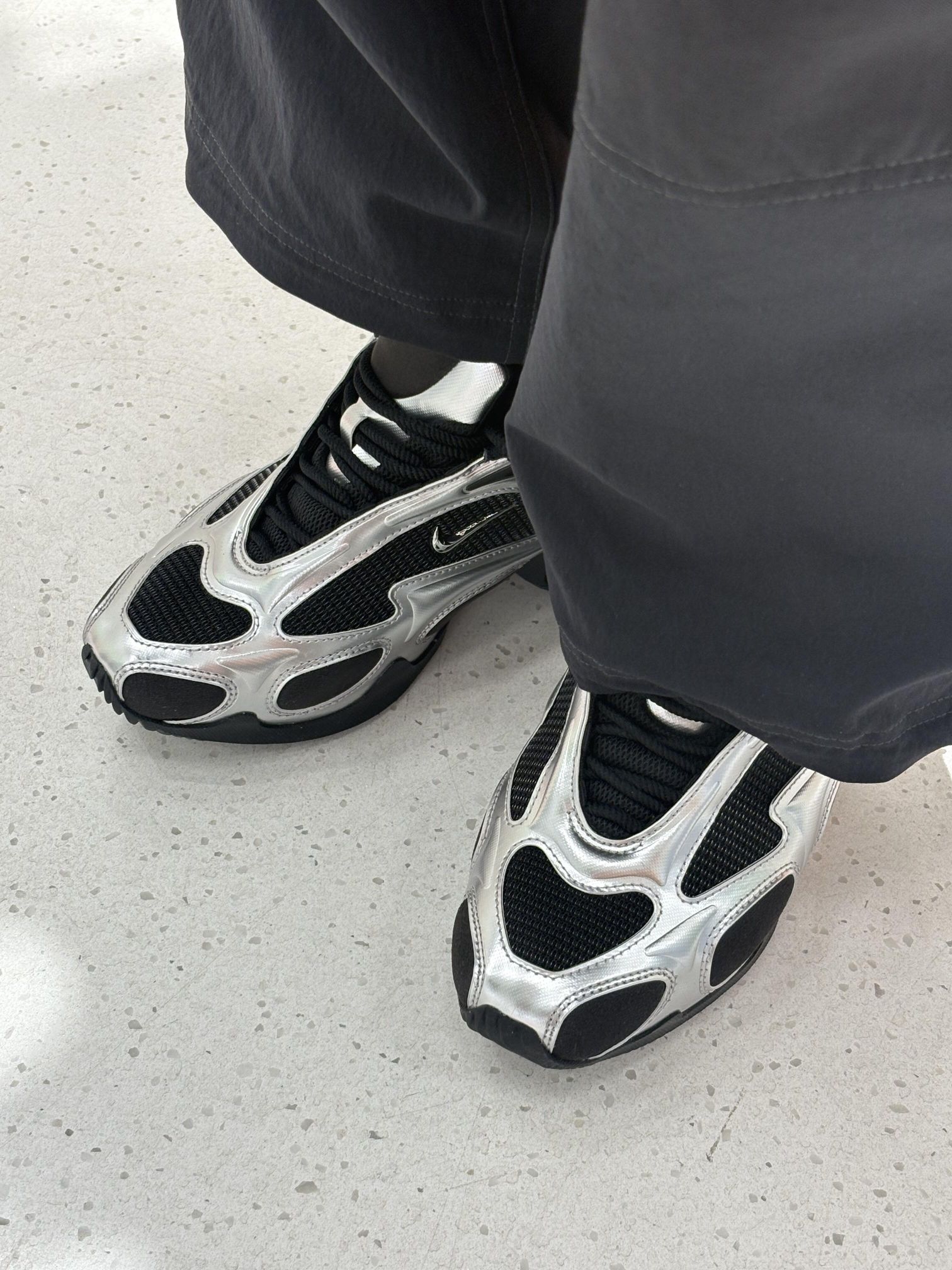 未来感炸场!被朋友追着问🔗的Nike鞋终于到手! 鞋面以银、黑为主色调,采用网面材质,搭配独特镂空造型,线条流畅且造型夸张,大底带有气垫设计,既增添潮流属性,又能提供舒适脚感,适配街头潮流穿搭风格 。🤙🤙🤙 这双鞋的设计太炸裂,银色金属光泽+独特镂空结构,踩上去像在未来漫步🚀 搭黑色阔腿裤,松弛又超有范儿,出街秒变焦点✨