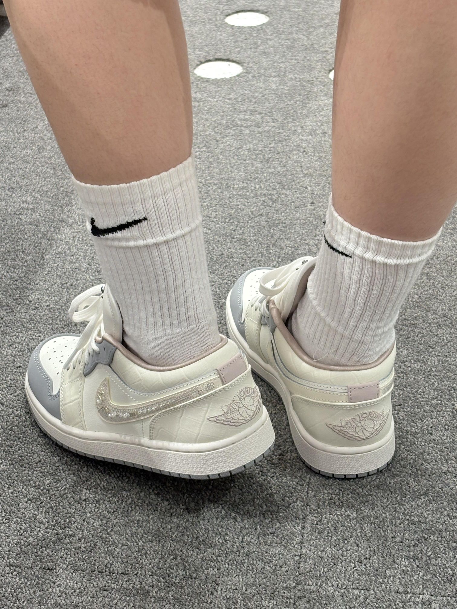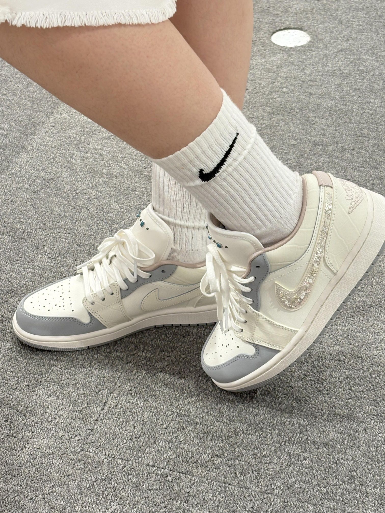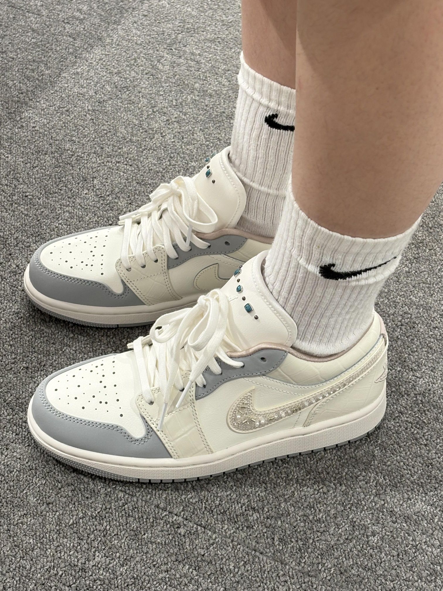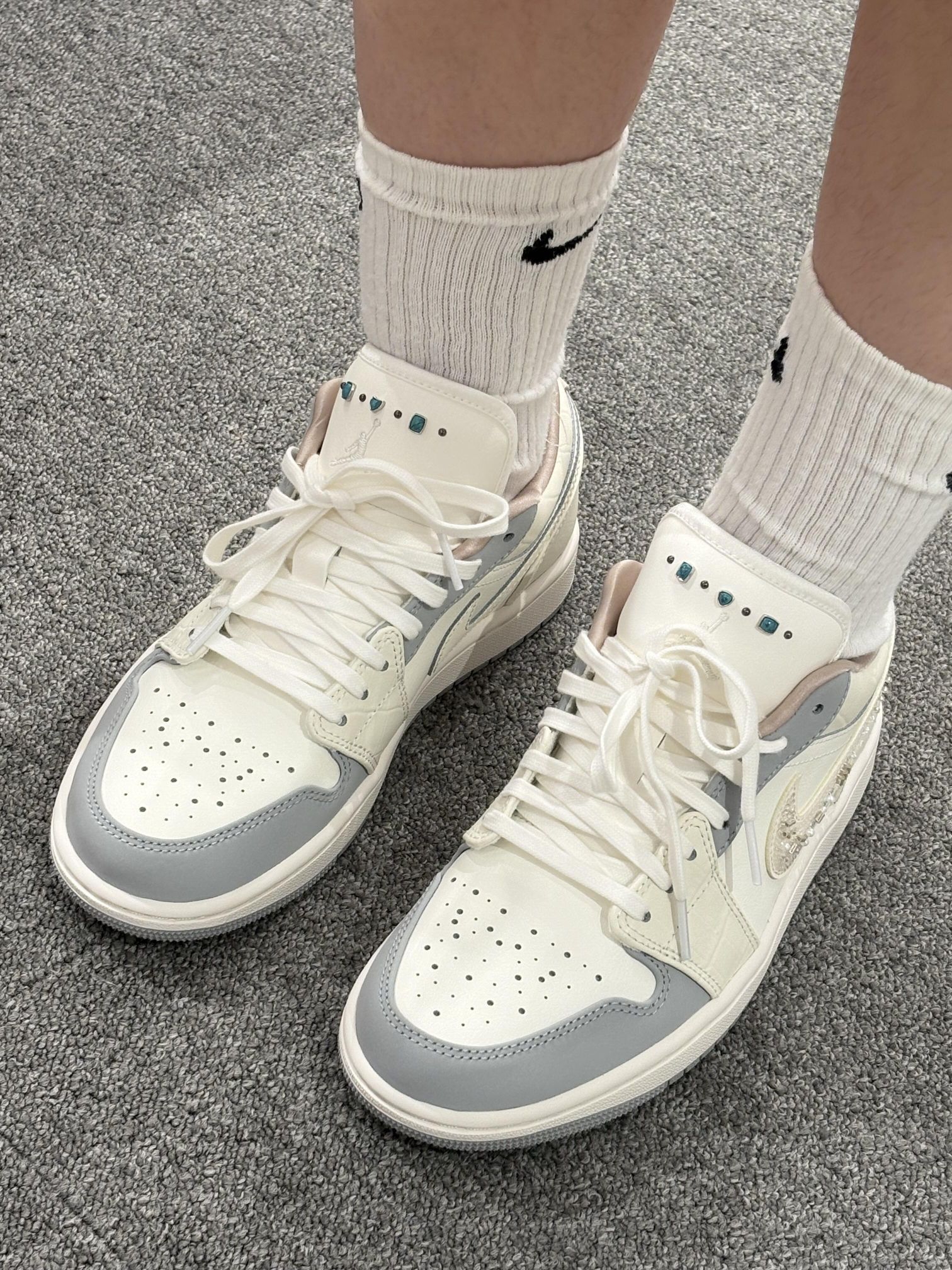 谁懂啊!这双AJ1 Low 简直把温柔和精致焊在鞋上了💫 米白×浅灰的配色,清爽又高级, 像把春日的云朵☁️ 踩在脚下~ 鞋侧 Swoosh 镶钻设计超绝, 低调闪但不浮夸,细节控狂喜!